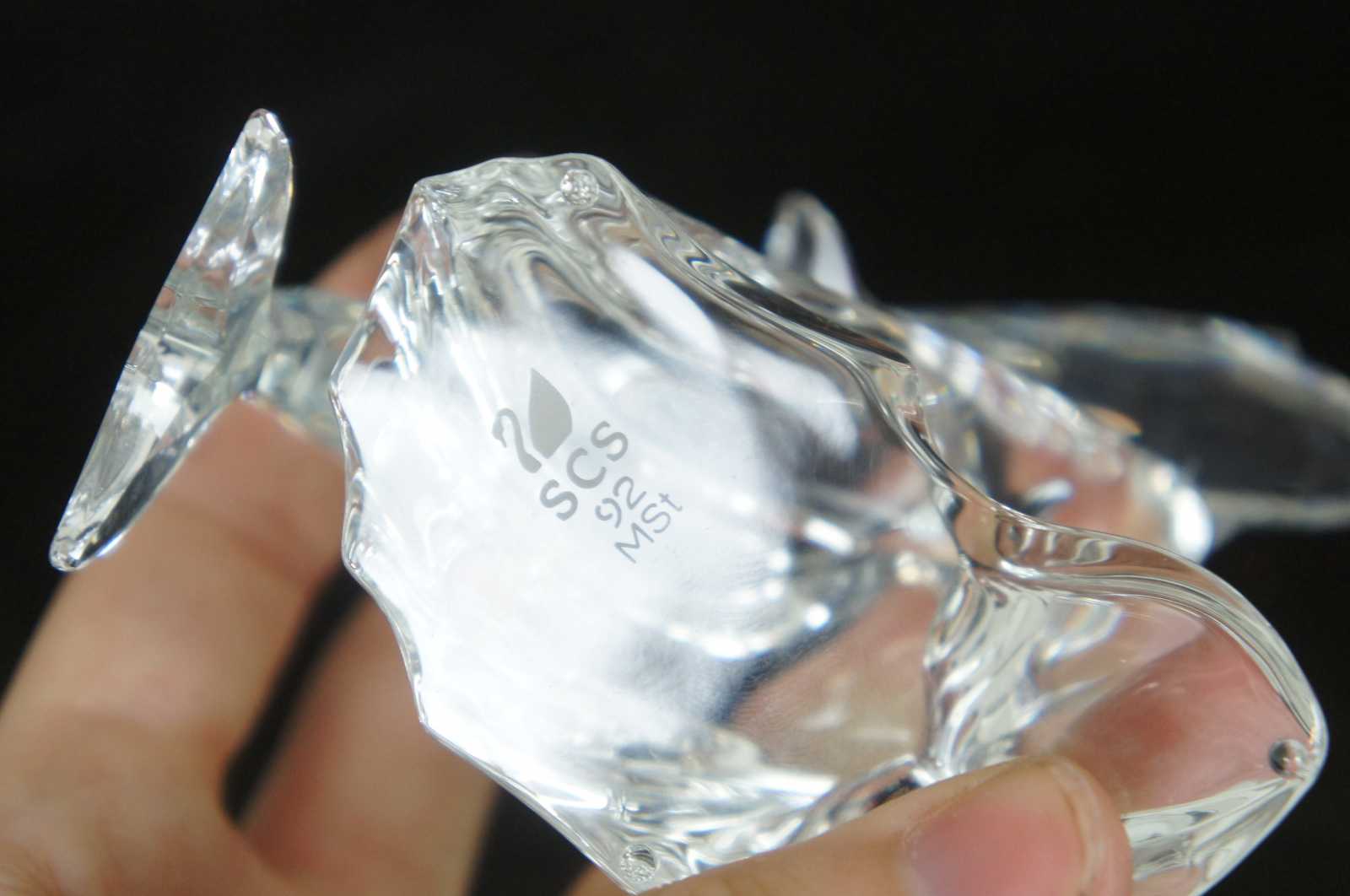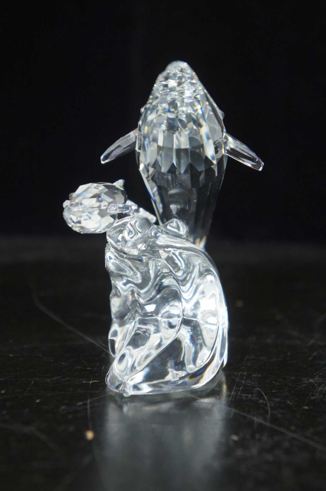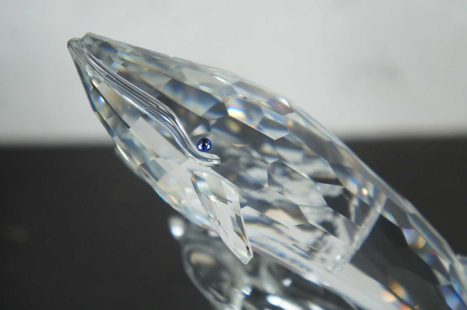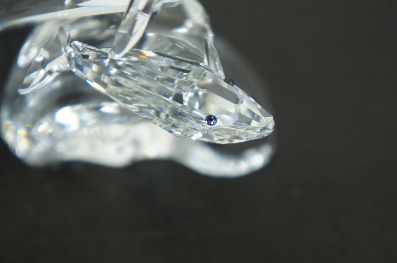 Swarovski crystal 1992 figurine “Care for Me,” featuring a mother and baby whale pair cresting a swirl of waves. This figurine (titled ""Care For Me"") reflects the Mother and Child relationship with its depiction of a mother and baby whale gracefully breaching a wave. This Annual Edition, expertly crafted of Clear Crystal, was only available in 1992 to Swarovski Crystal Society (SCS) members. D01X921. Designer: Michael Stamey