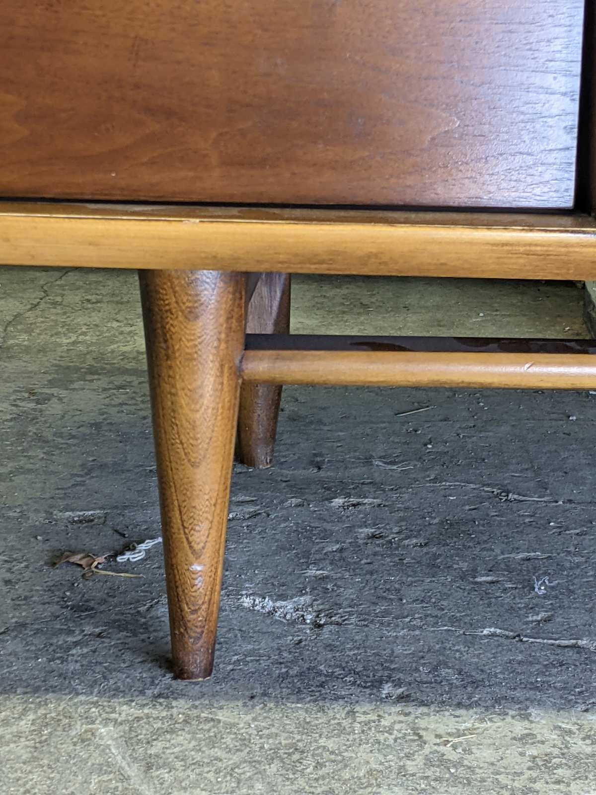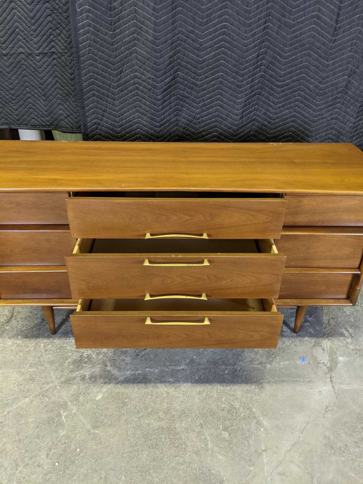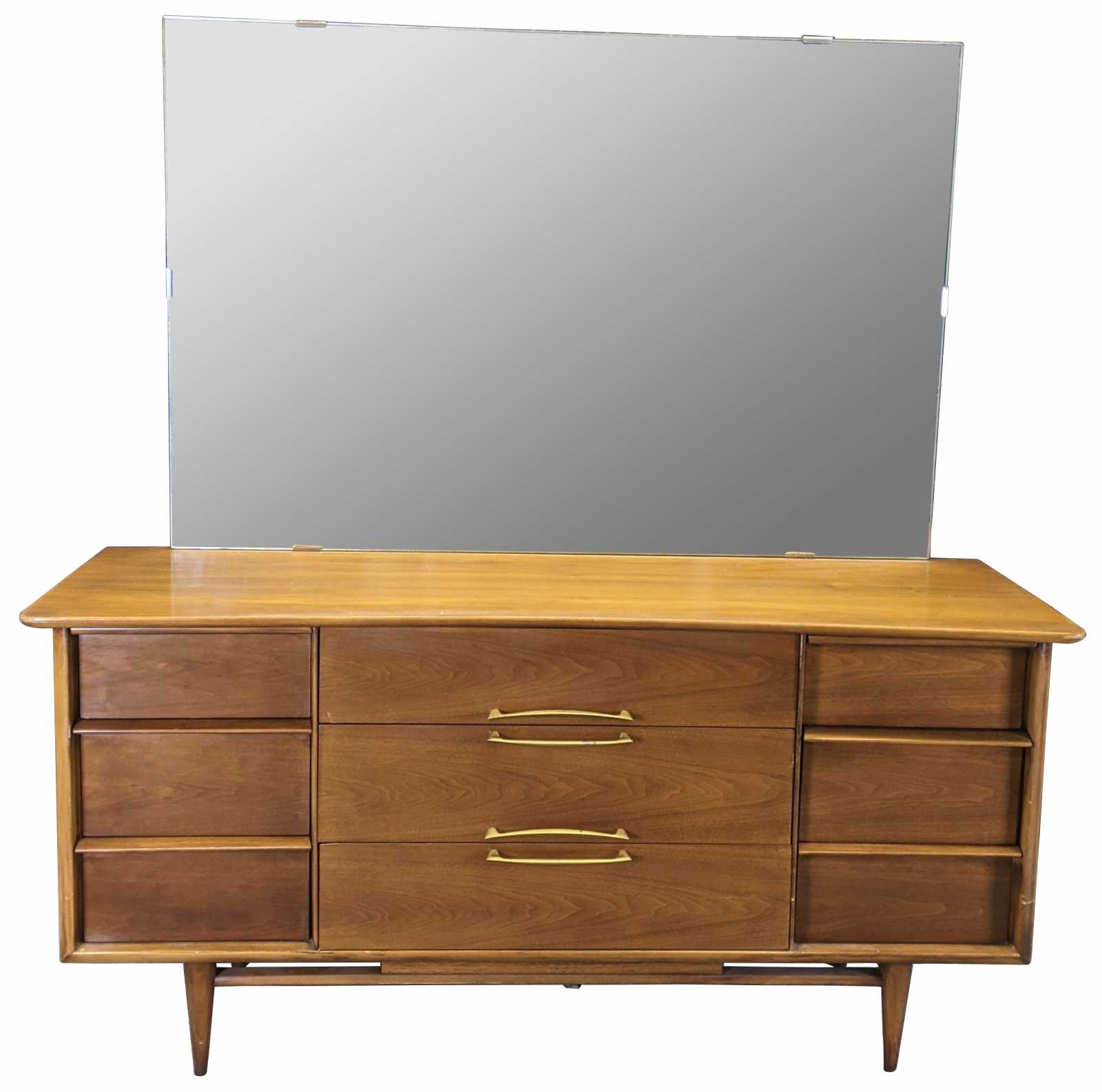 Vintage scuptural shaped mirrored vanity, dresser or buffet by Kent Coffee. Made from continiental walnut with dovetailed drawers, tapered legs and large mirrored back. Circa 1960s. #6902.