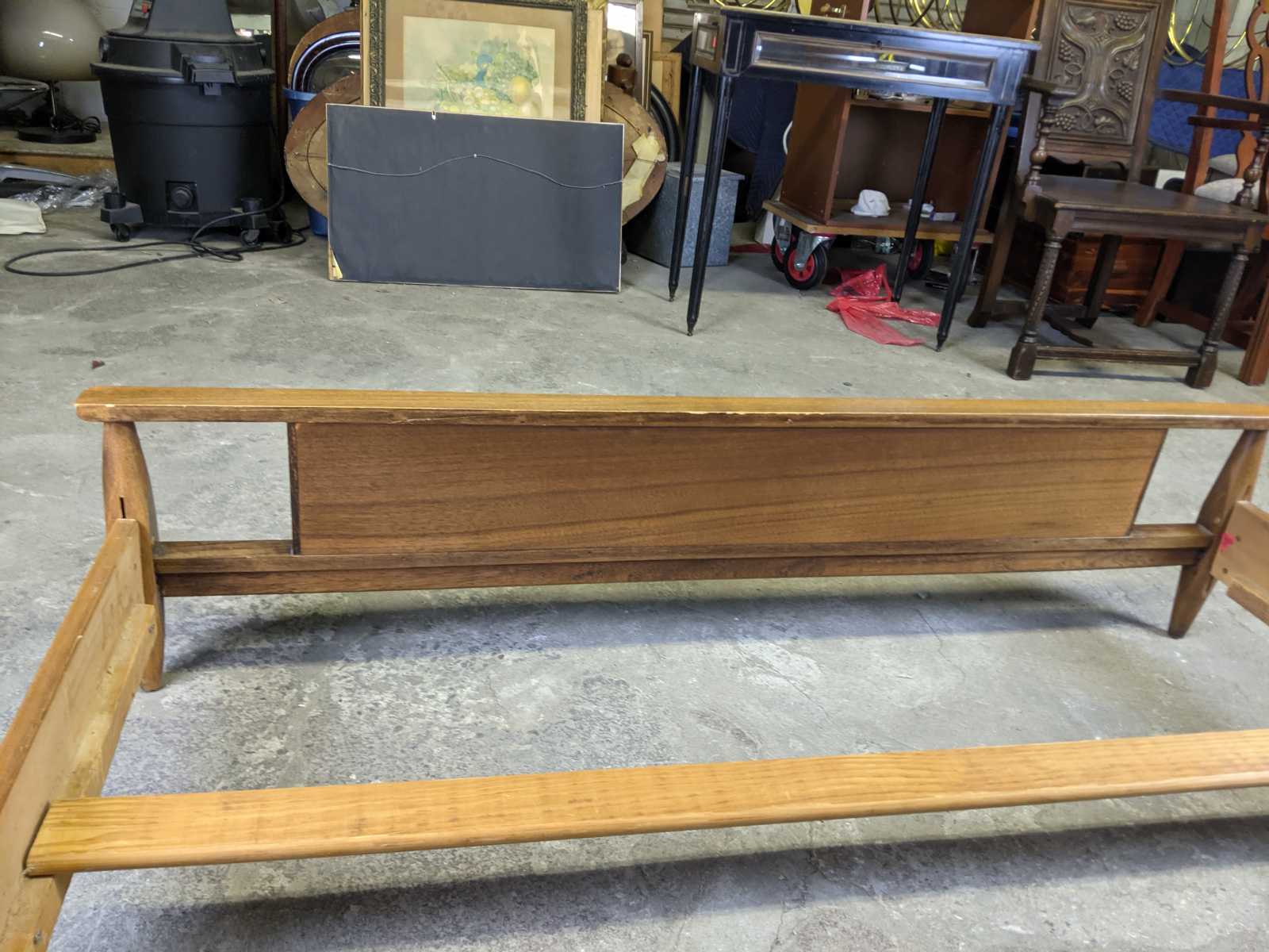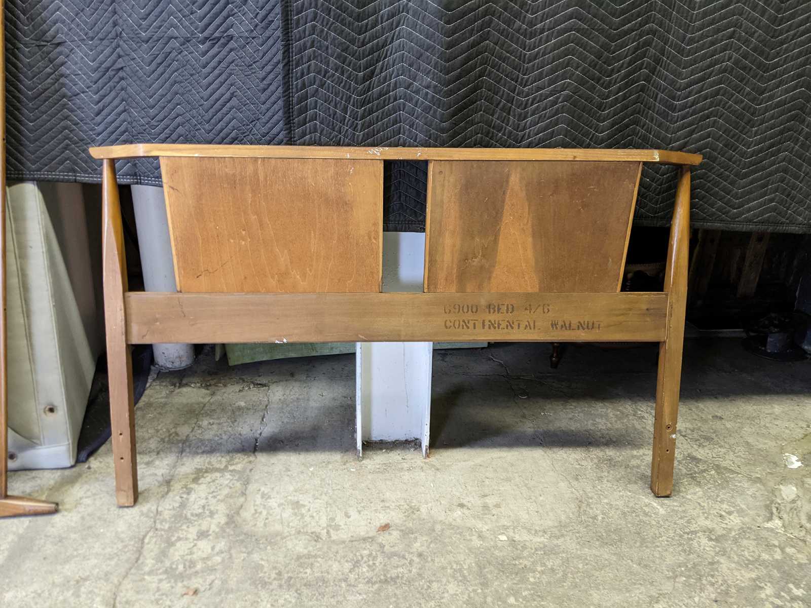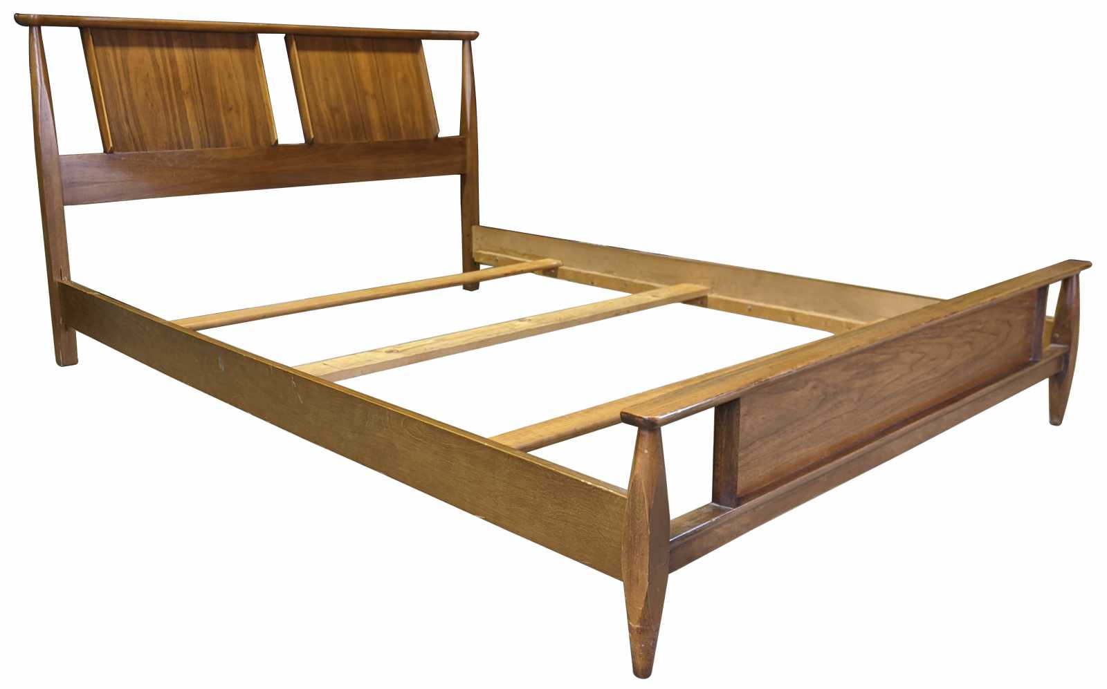 Vintage scuptural shaped full size bed by Kent Coffee. Made from continiental walnut with tapered legs. Circa 1960s. #6900.