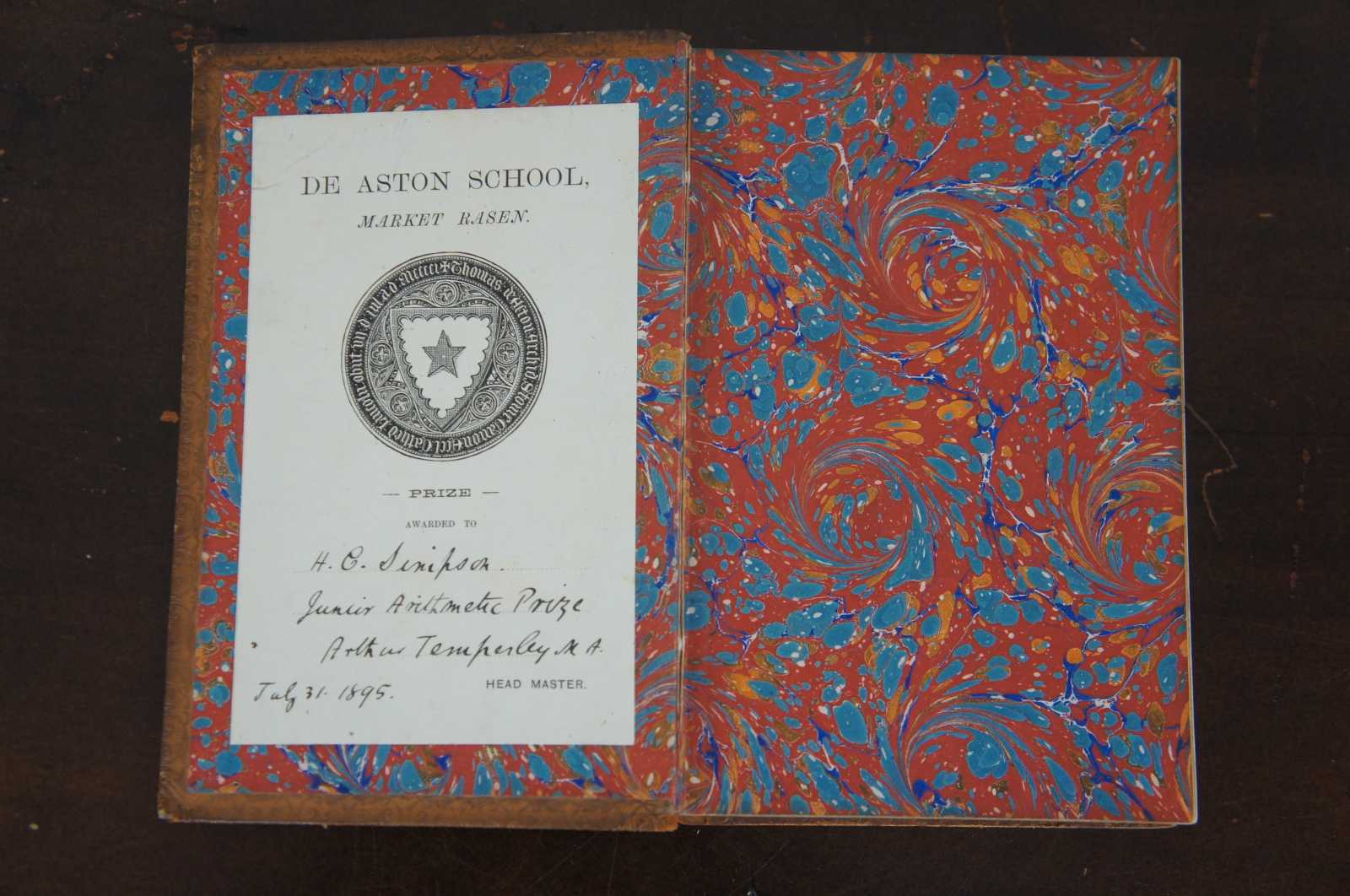 Antique leather bound copy of “The Rob Roy on the Jordan” by J. Macgregor, Seventh Edition with maps and illustrations, published by John Murray, London in 1886, printed by Hazell, Watson, & Viney Ltd, London. Presented in 1895 as an academic prize and cover stamped in gold with the crest of the UK’s De Aston School of Market Rasen.