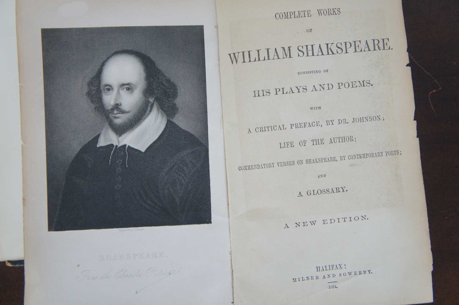 Antique hard back copy of “The Complete Works of William Shakespeare” with a preface by Dr. Johnson, published by Milner & Sowerby, Halifax in 1864.