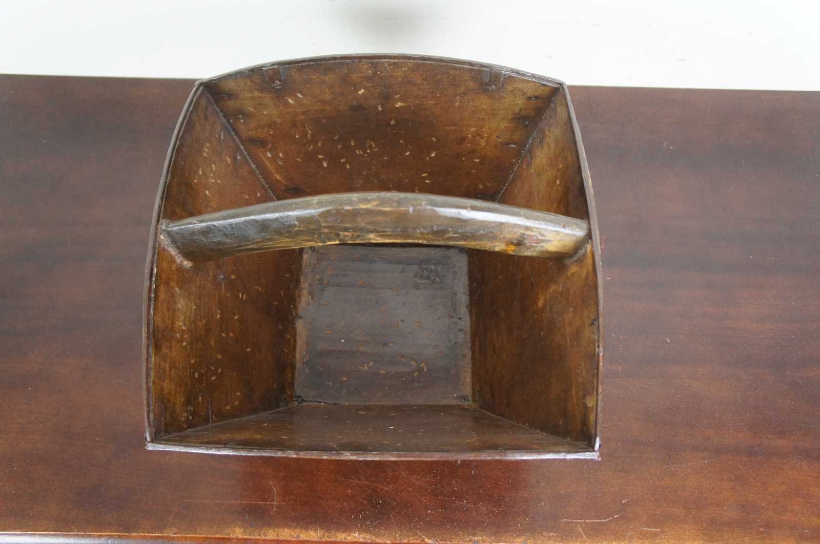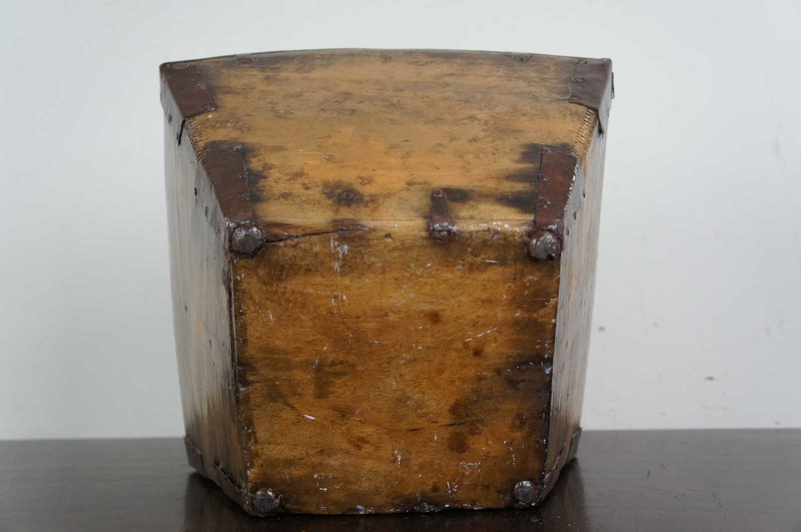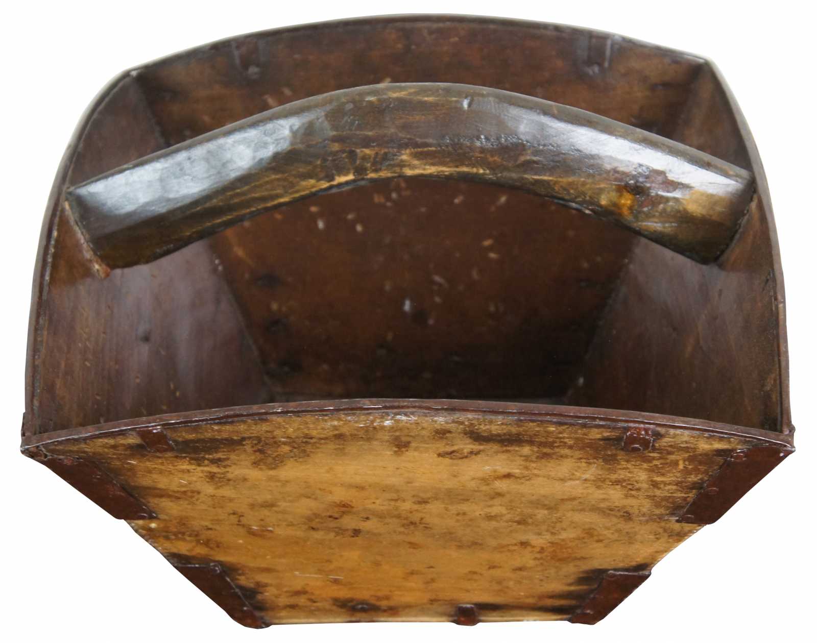 Antique asian wooden rice bucket with metal reinforced corners, tapered square shape and handle across the middle.