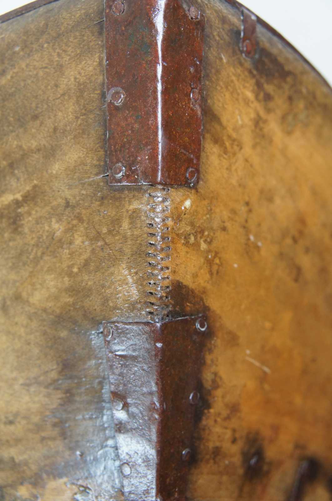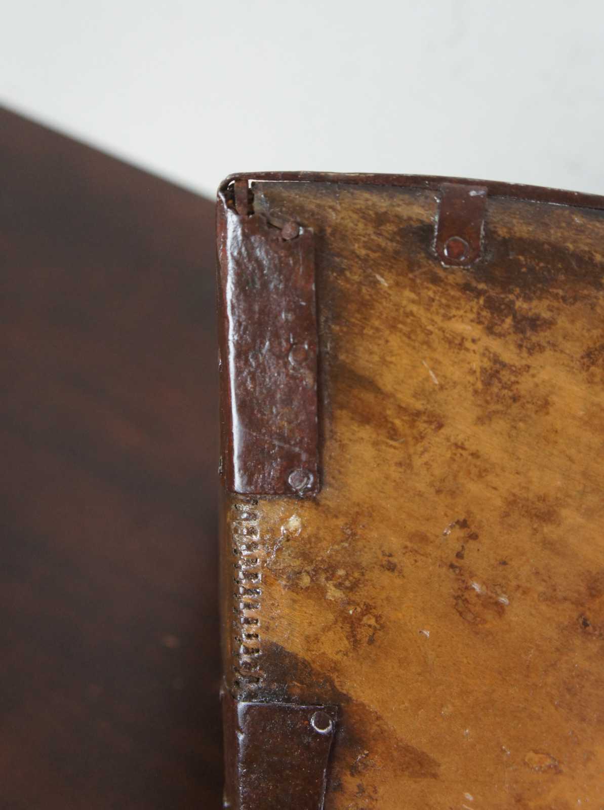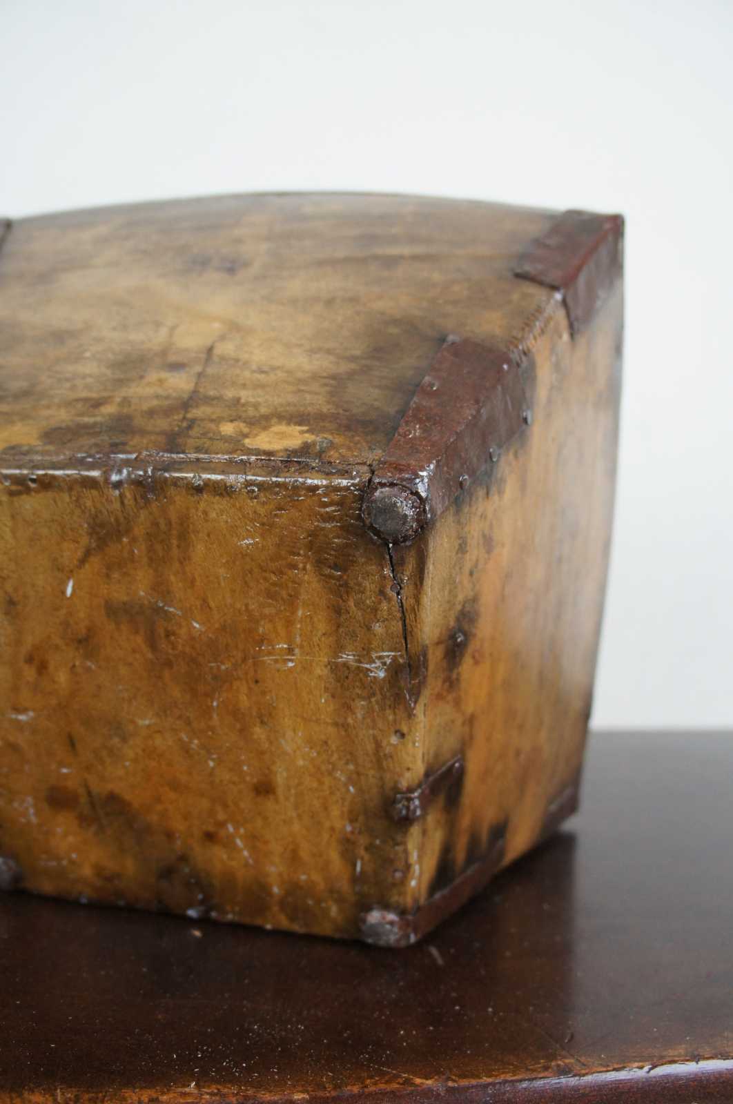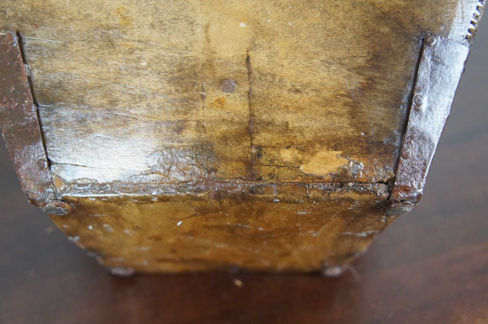 Antique asian wooden rice bucket with metal reinforced corners, tapered square shape and handle across the middle.