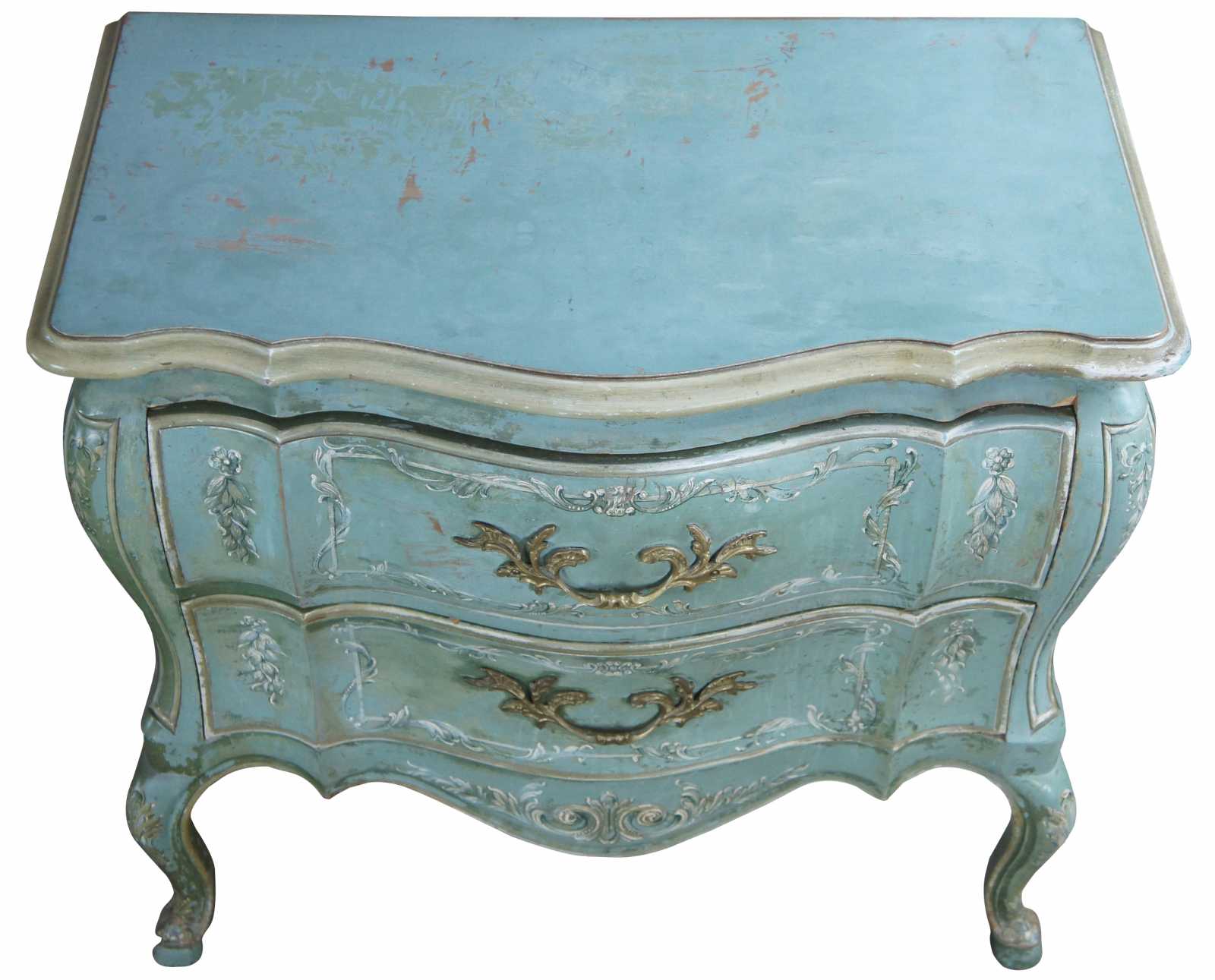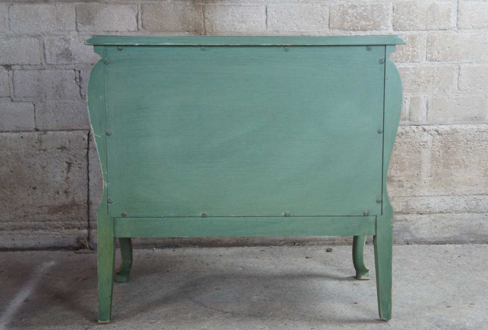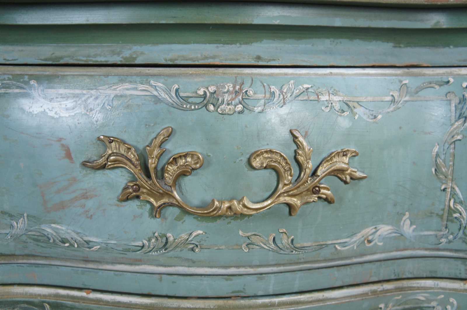 Circa 1960s William A Berkey Chest for John Widdicomb. A stunning serpentine bombe commode chest with a teal / turquoise / blue green finish. Includes hand painted accents, brass hardware, dovetailed drawers and cabriole legs.