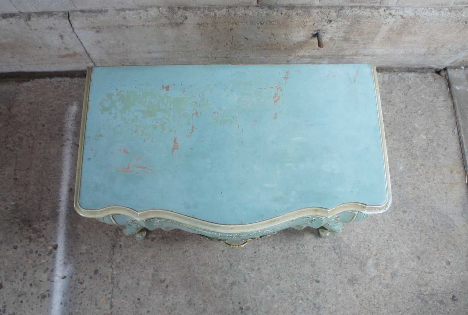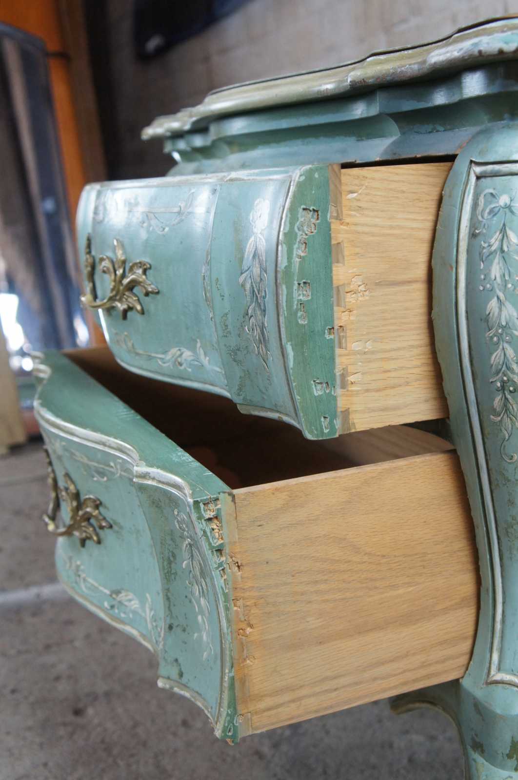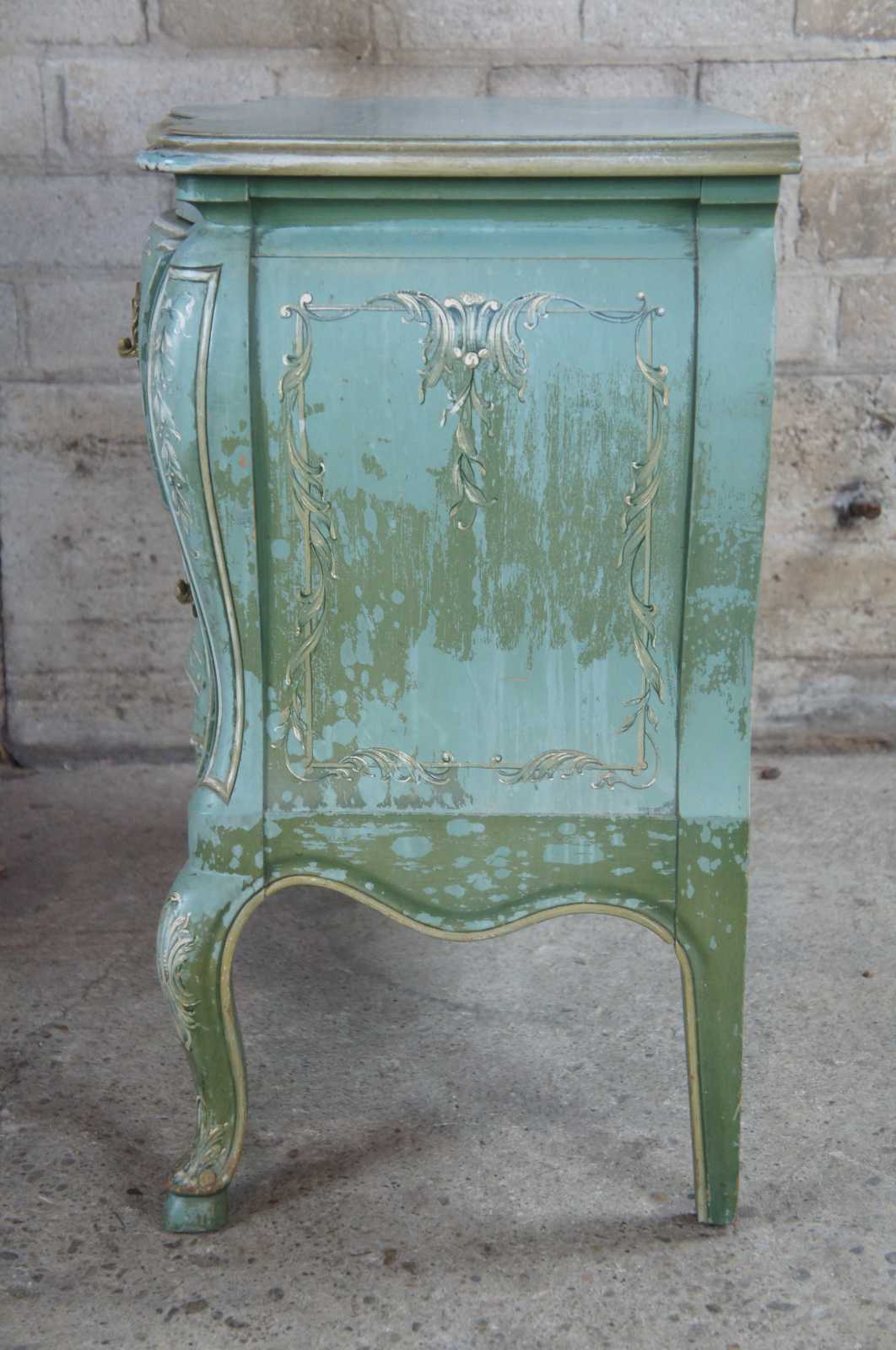 Circa 1960s William A Berkey Chest for John Widdicomb. A stunning serpentine bombe commode chest with a teal / turquoise / blue green finish. Includes hand painted accents, brass hardware, dovetailed drawers and cabriole legs.