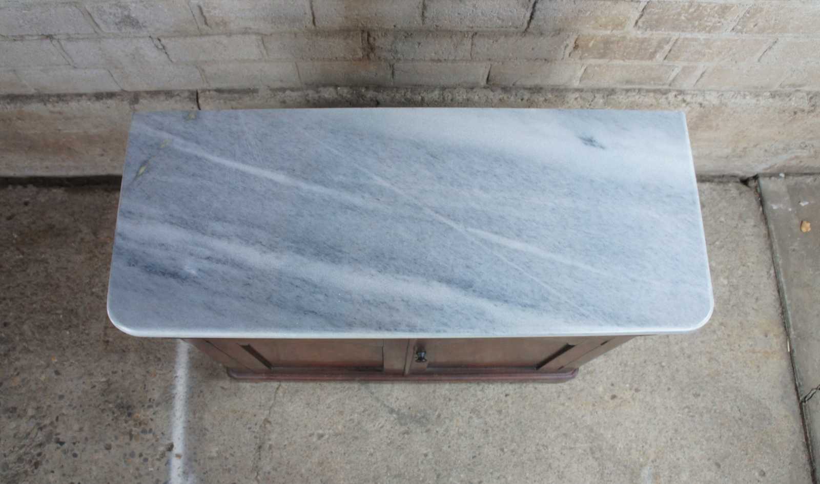 Good antique condition, some distressing and wear commensurate with age and use, light veneer loss / chipping, marble not original and has wear / damaged / repair on back left, see pictures.