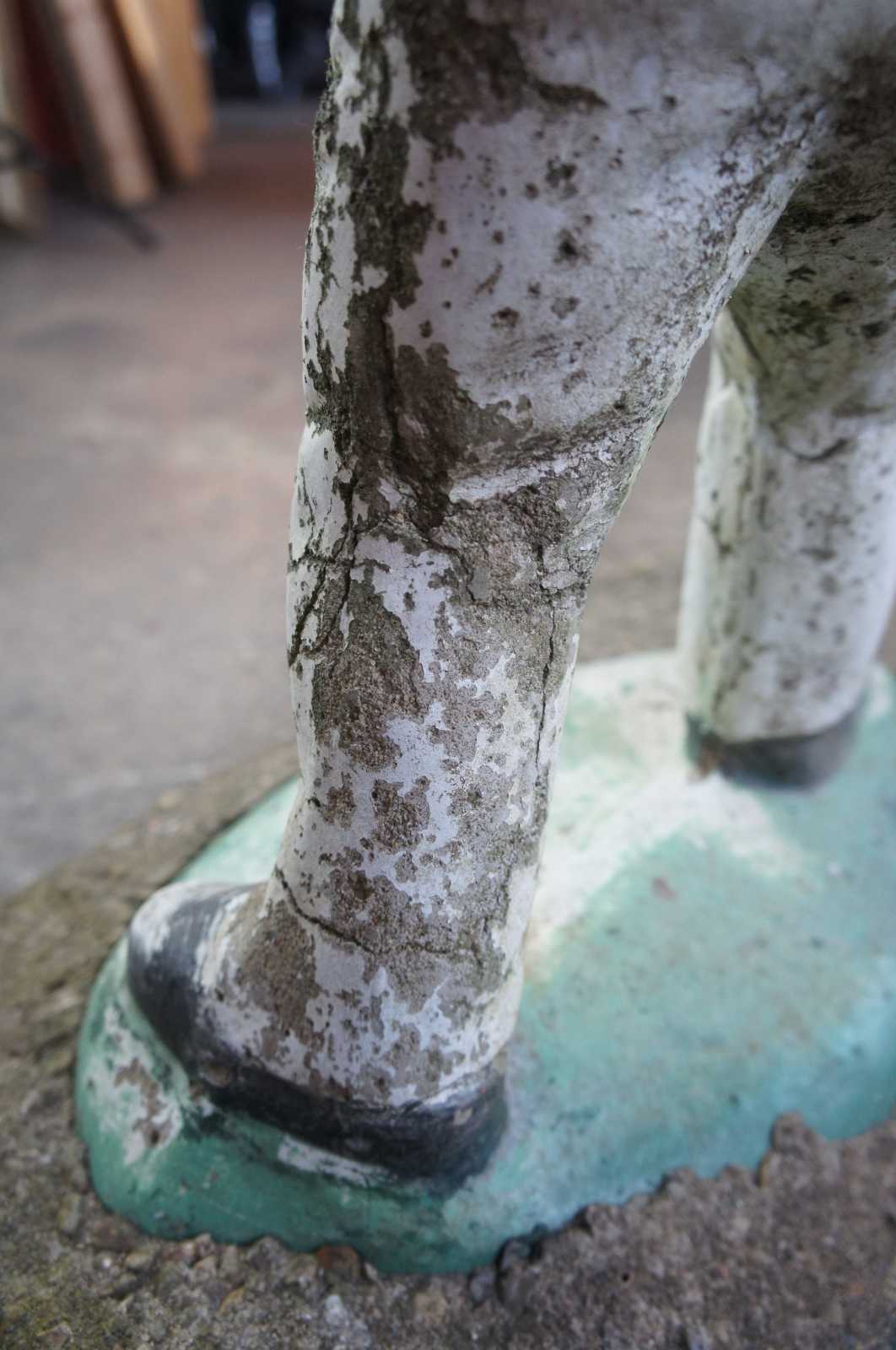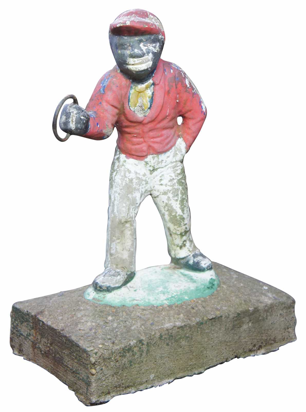 Vintage concrete lawn or garden statue. Features a little boy dressed in lawn jockey attire, holding what used to be a lantern, but now is just a ring.