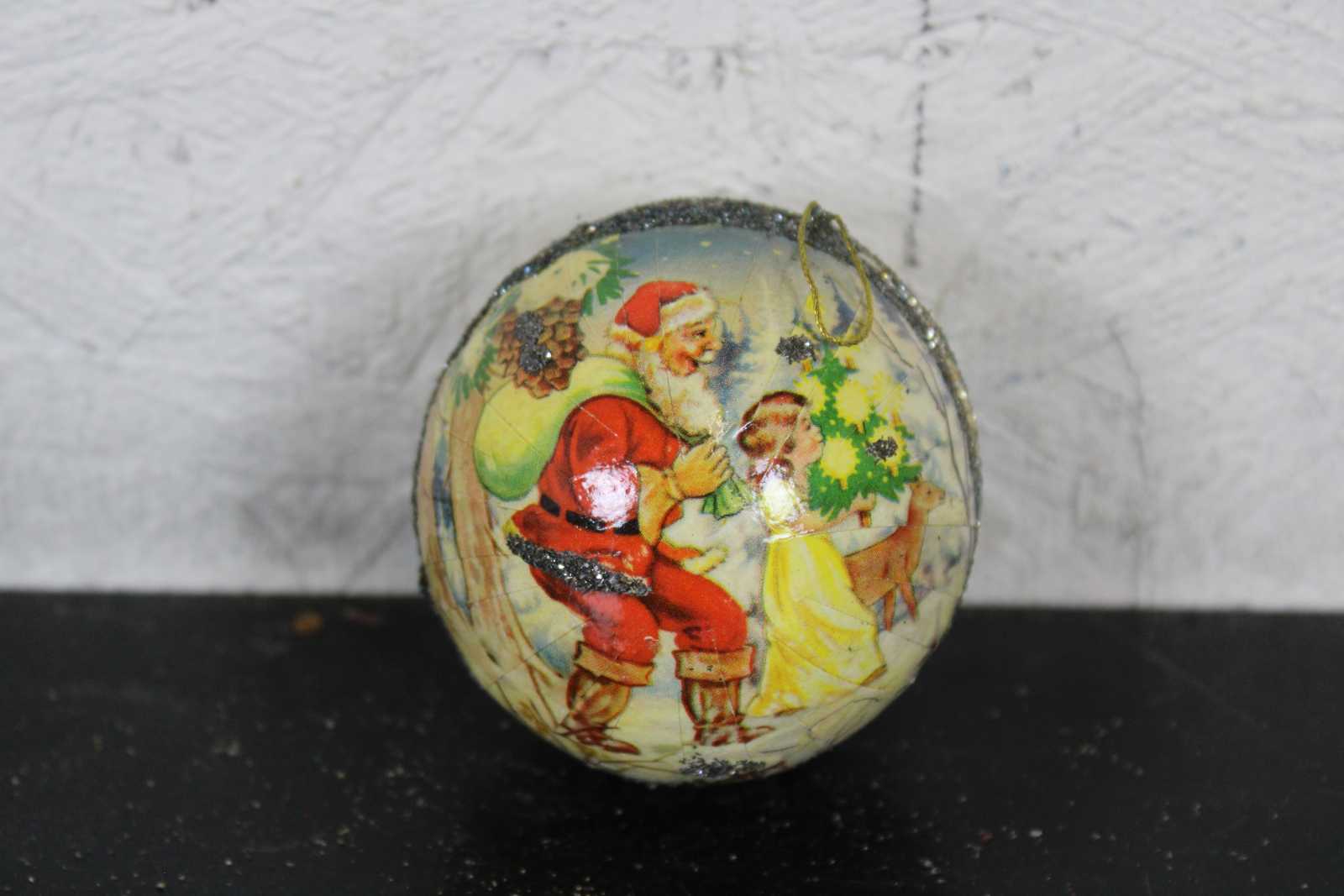 Lot of fifteen vintage West German paper mache Christmas ornament ball candy containers, eight featuring three different lithograph scenes of Santa Claus, children and angels; the remaining seven are painted in solid colors accented with silver glitter. Attributed to Kurt S Adler.