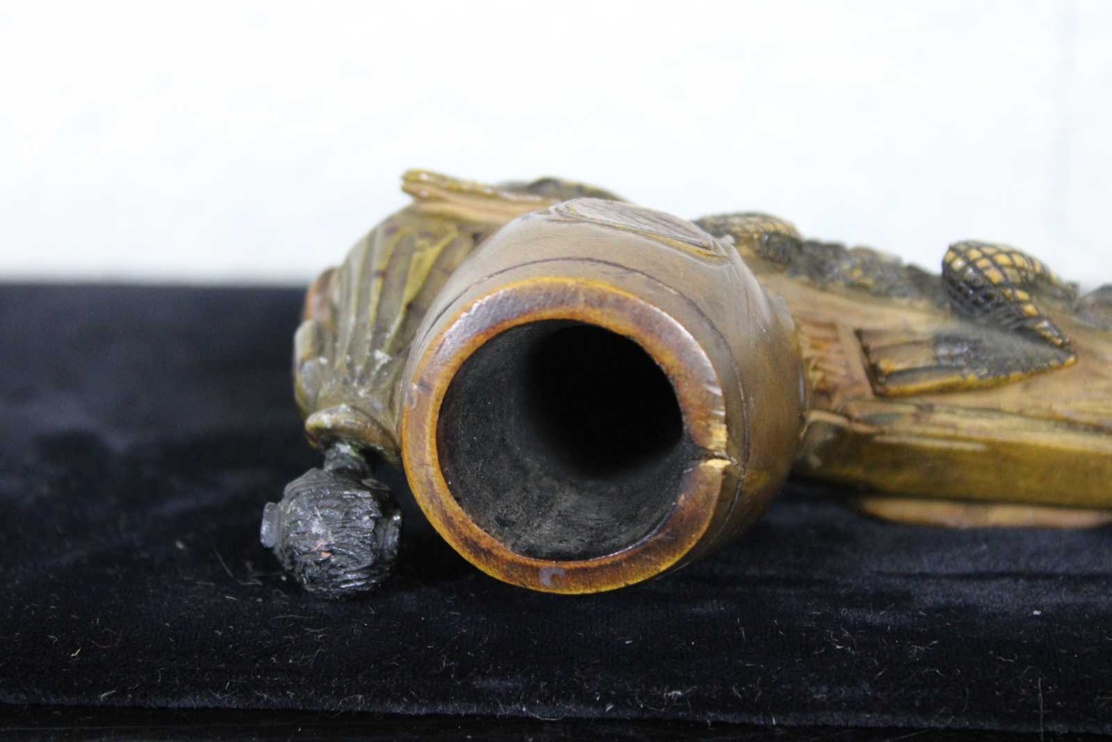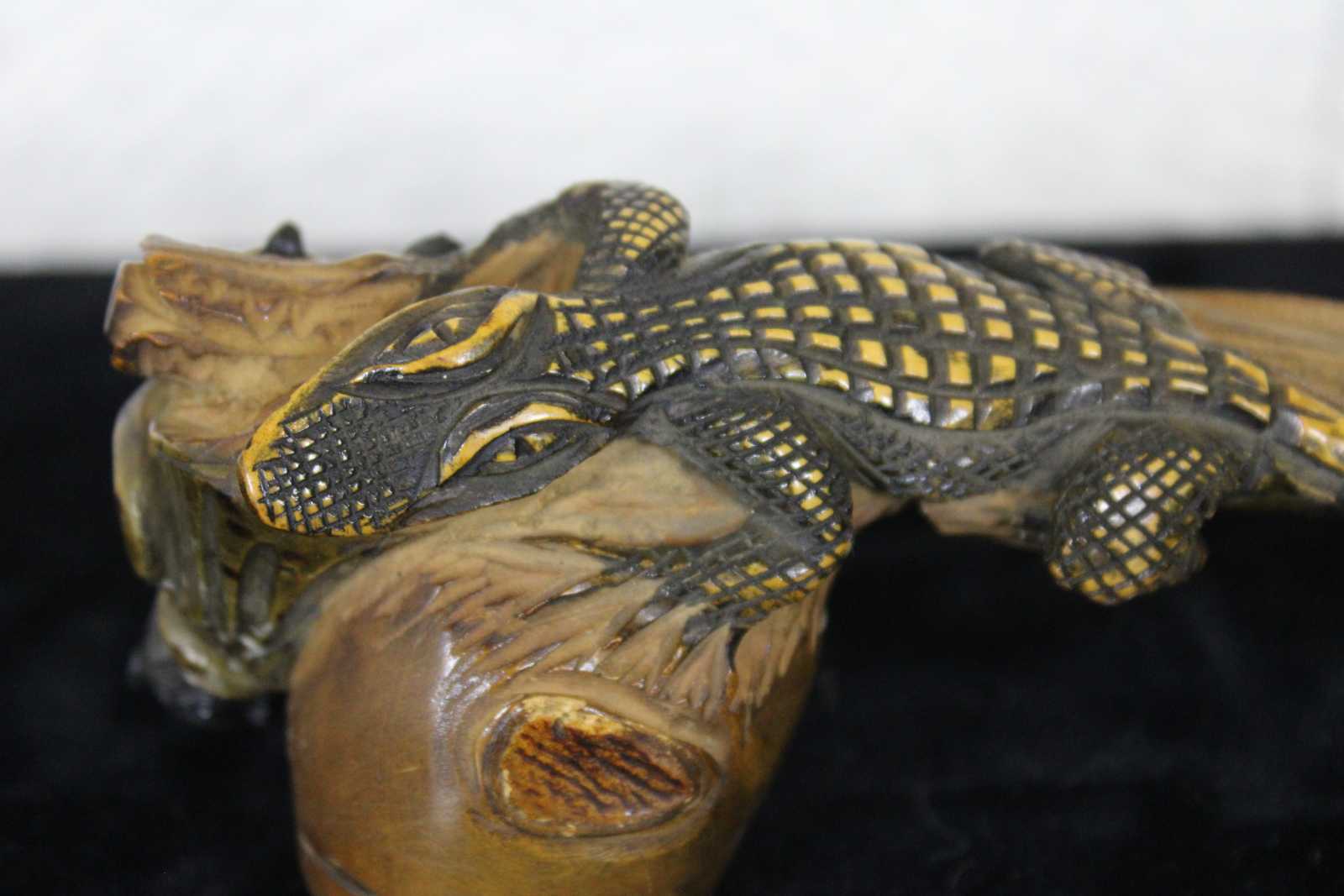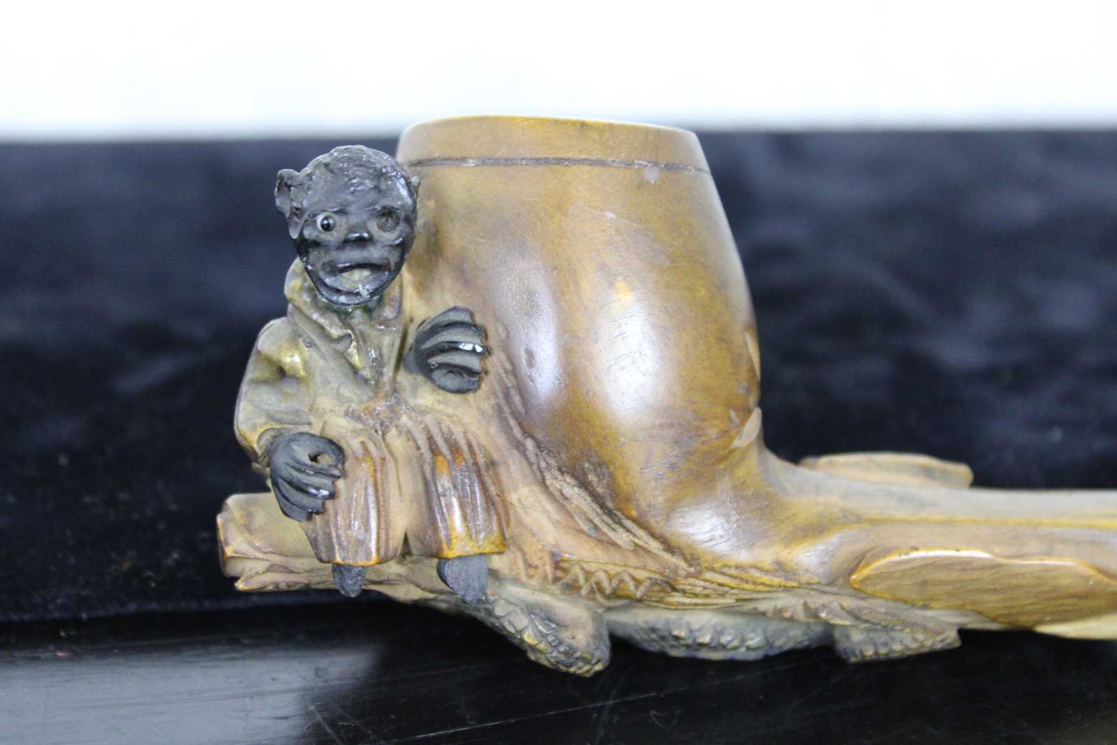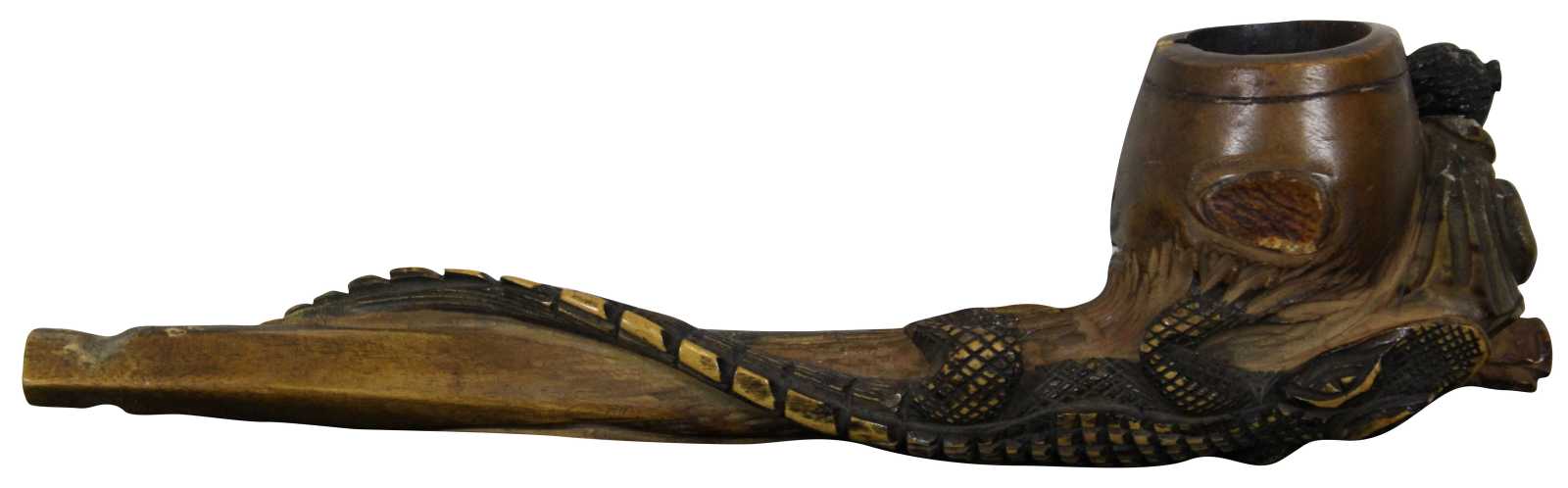 Antique Americana folk art carved wood pipe featuring an man or boy in formal attire seated on a log with an alligator / lizard / crocodile stalking / biting his jacket as a look of bewilderment sets in.