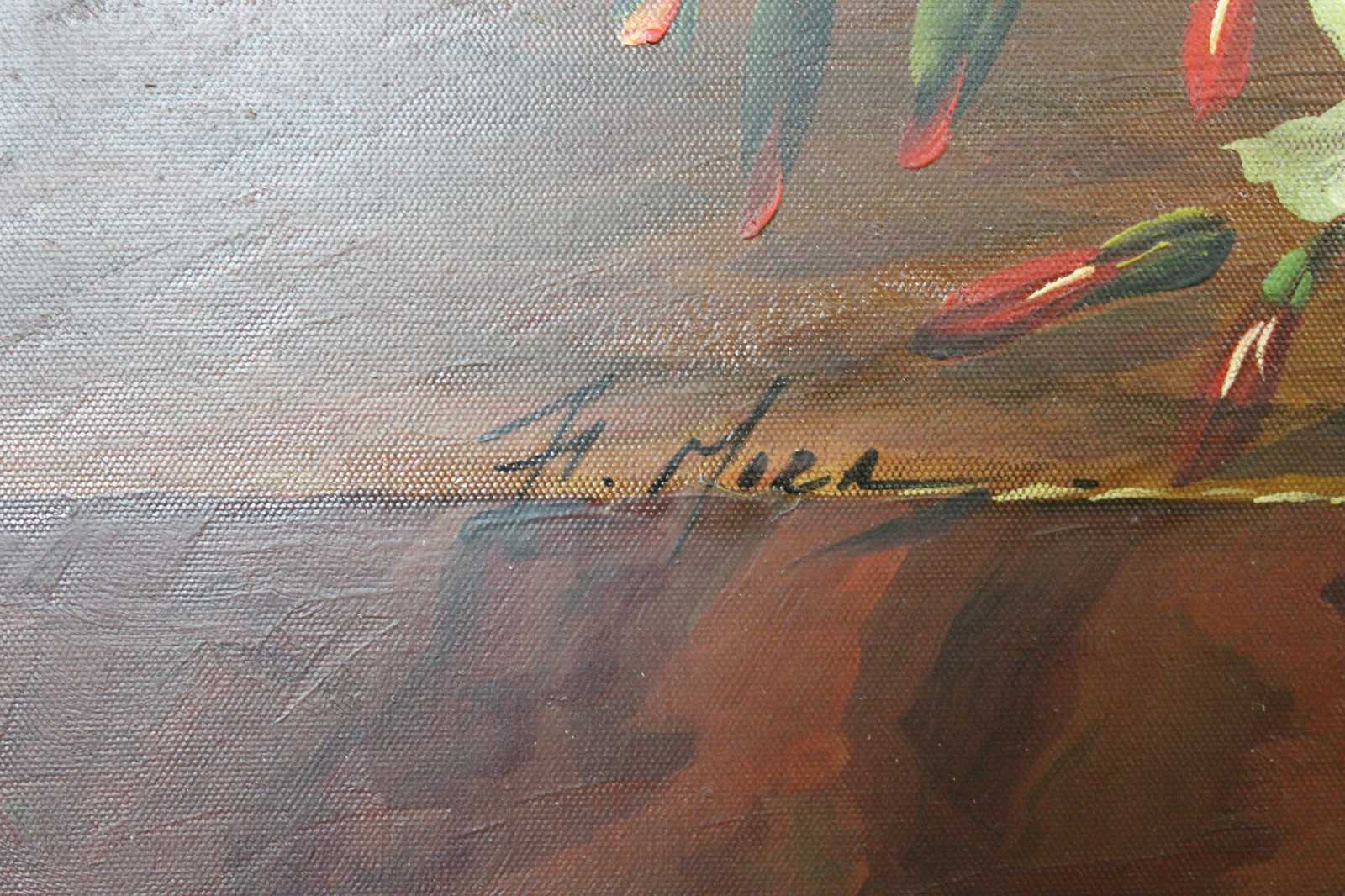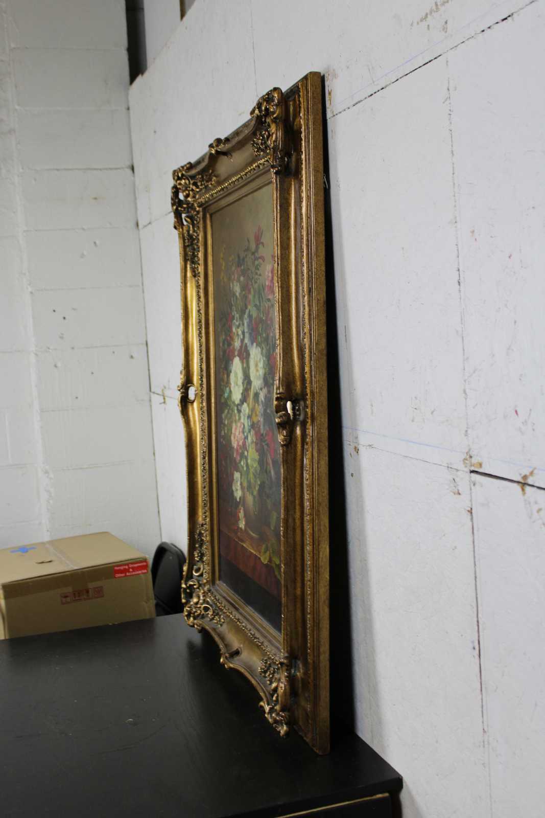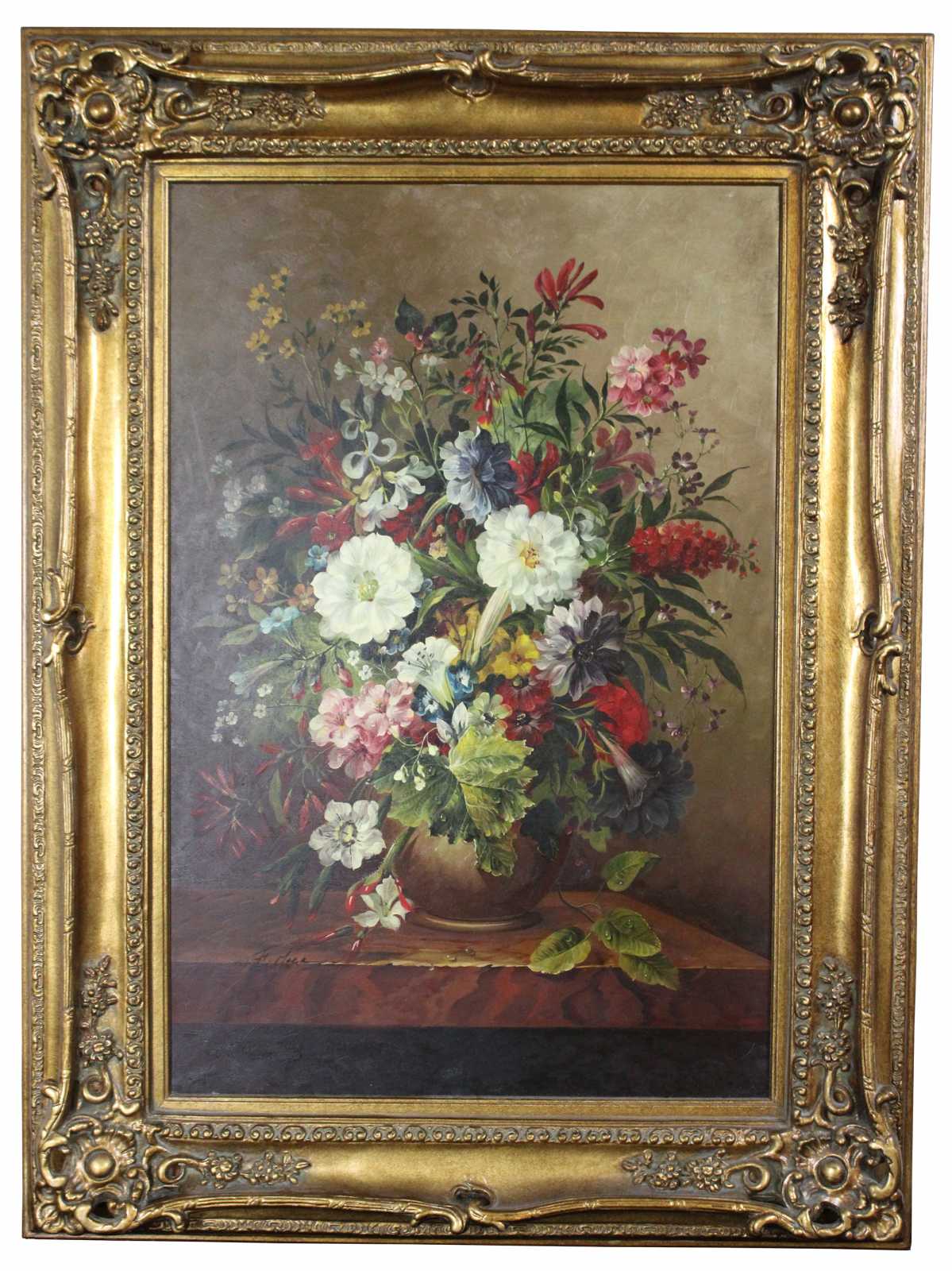 Late 20th century still life oil painting. Signed Mora lower right. Features a coloful bouquet in vase displayed on a console table. Framed in a gold toned baroque inspired frame.