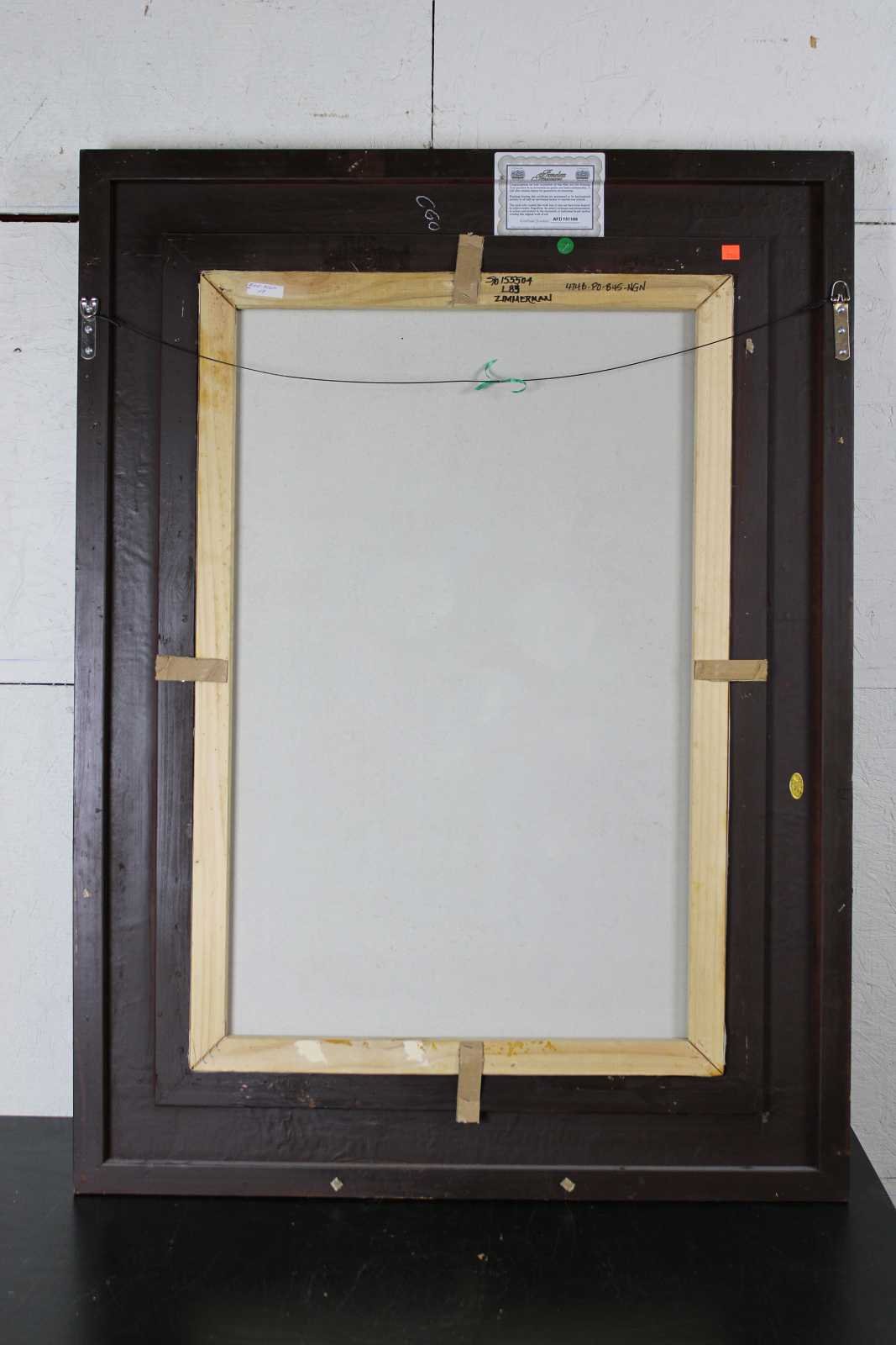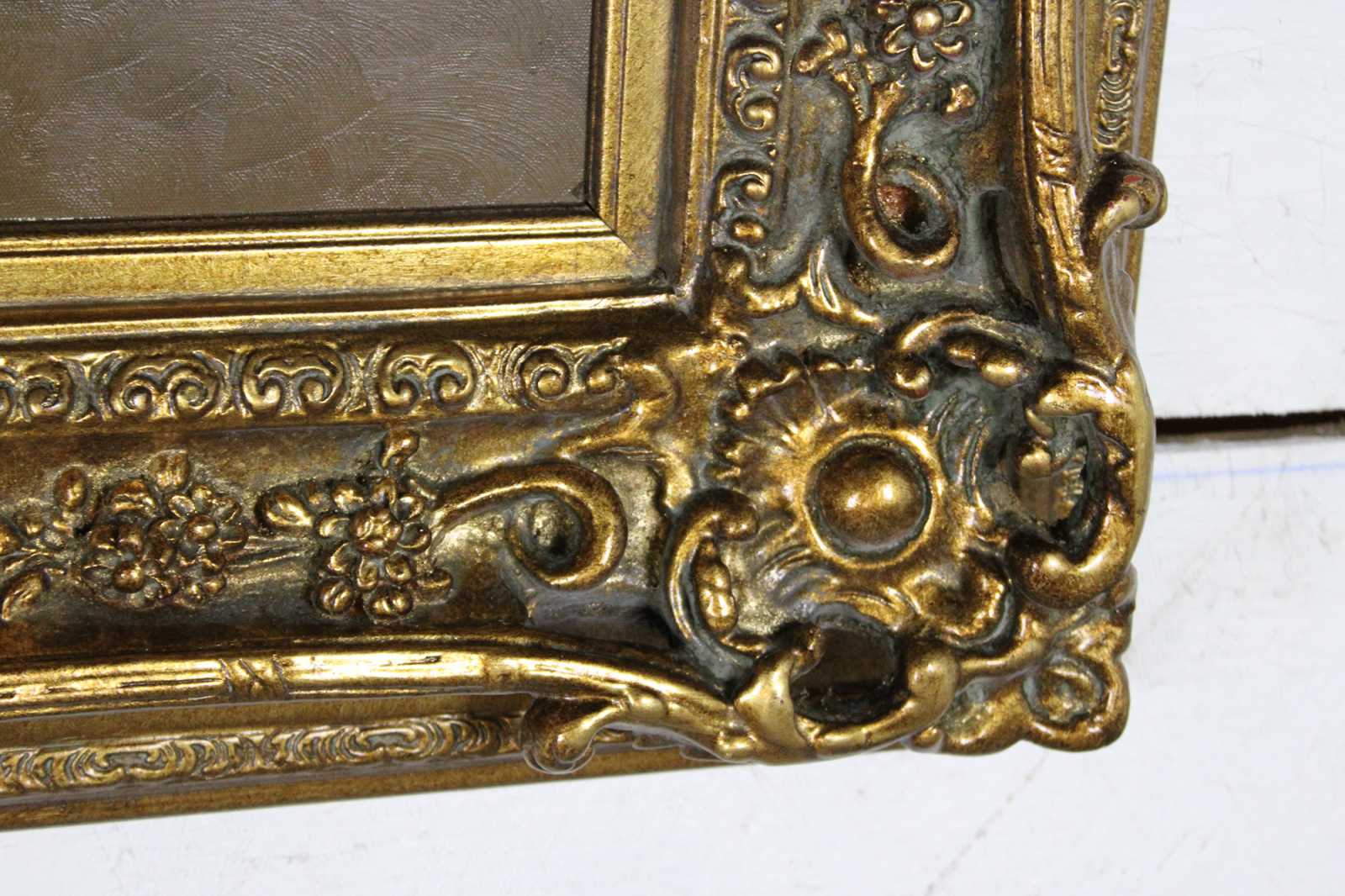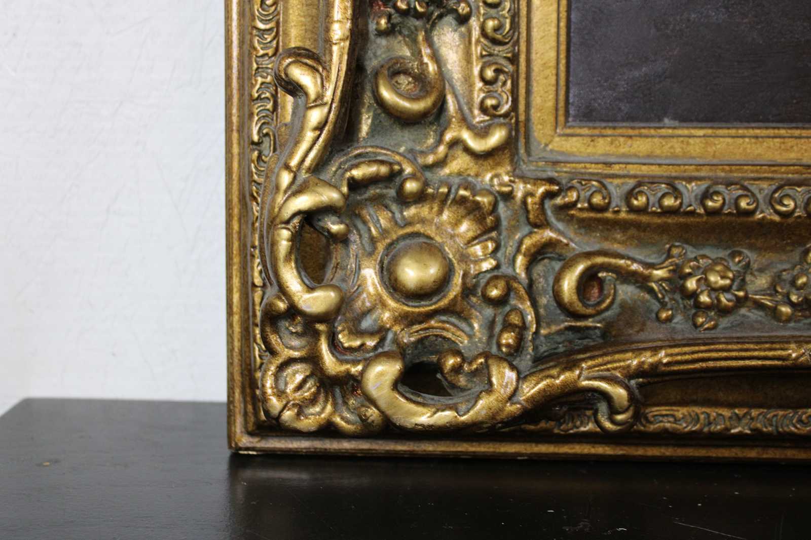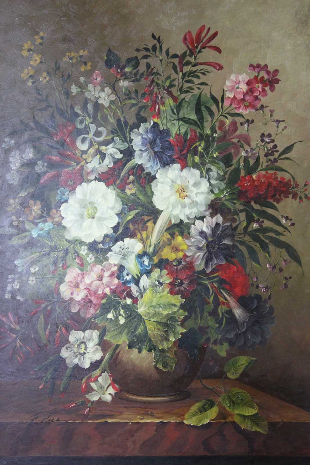 Late 20th century still life oil painting. Signed Mora lower right. Features a coloful bouquet in vase displayed on a console table. Framed in a gold toned baroque inspired frame.