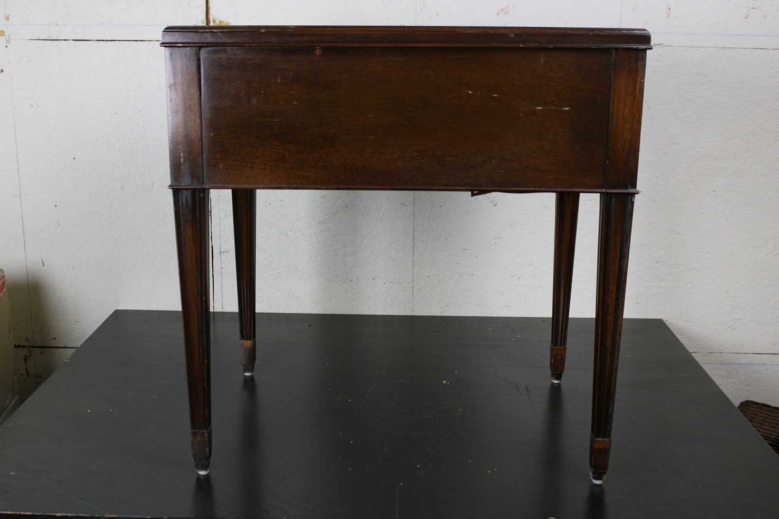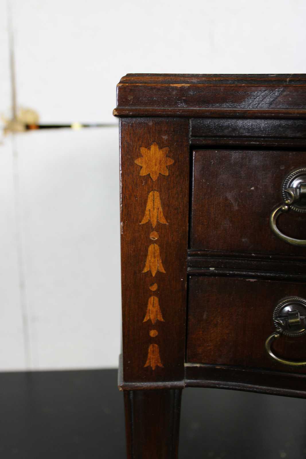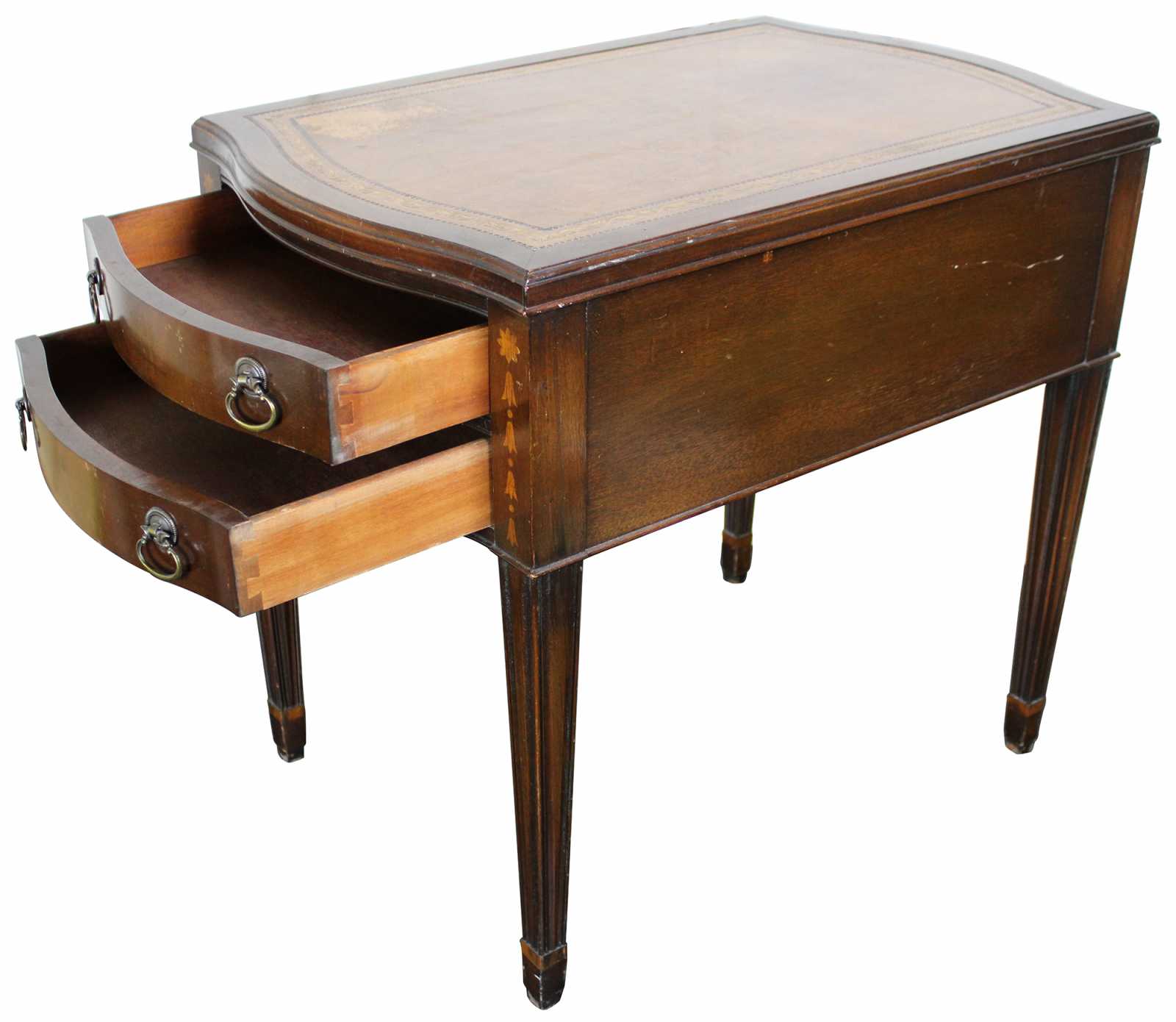 Mid Century Hepplewhite/ Sheraton end table. Made from mahogany with tooled leather top. Features a serpentine front of two dovetailed drawer and inlay. The table is supported by square tapered and fluted legs. Sold by F & R Lazarus & Co in Columbus Ohio. Constructed from wood from the Carolina Panel Company from Lexington, N.C. Circa 1950.