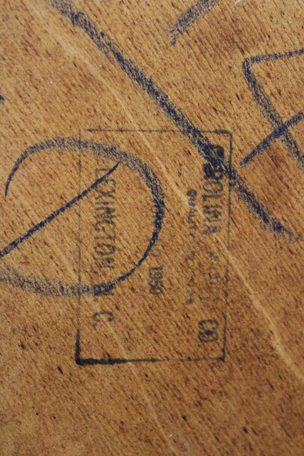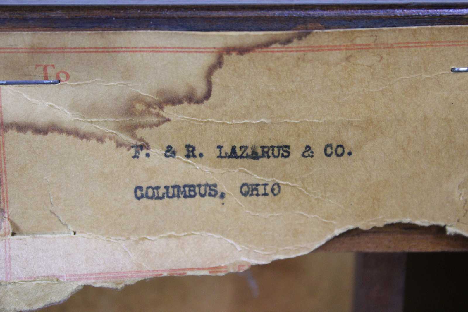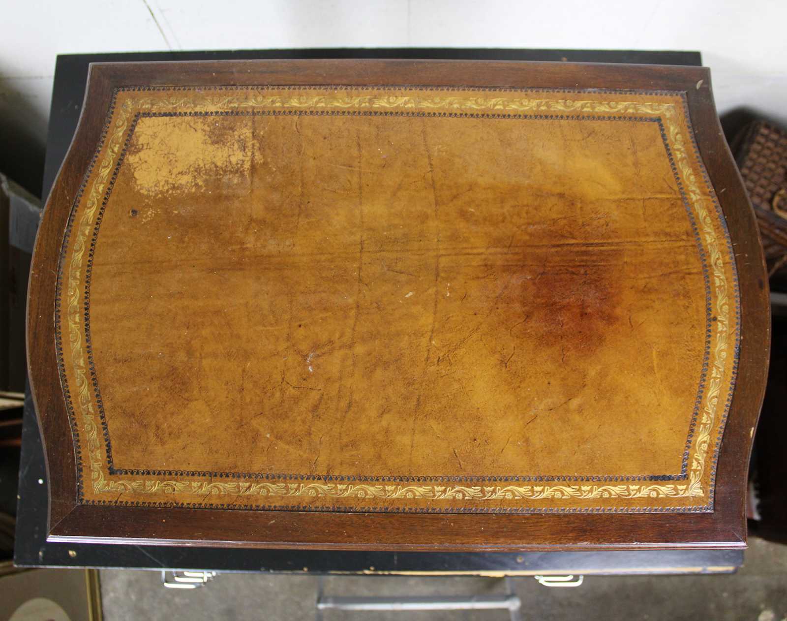 Mid Century Hepplewhite/ Sheraton end table. Made from mahogany with tooled leather top. Features a serpentine front of two dovetailed drawer and inlay. The table is supported by square tapered and fluted legs. Sold by F & R Lazarus & Co in Columbus Ohio. Constructed from wood from the Carolina Panel Company from Lexington, N.C. Circa 1950.