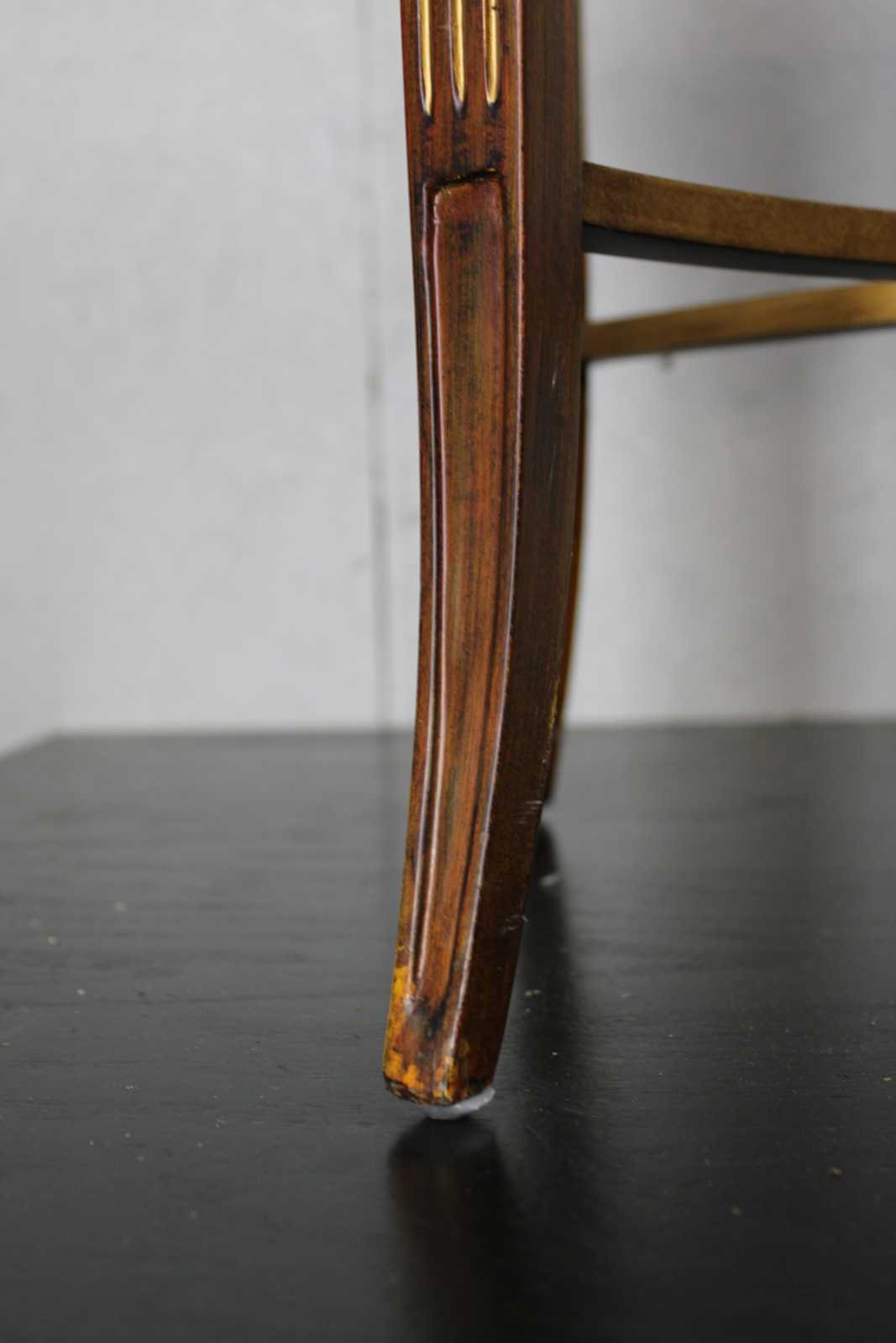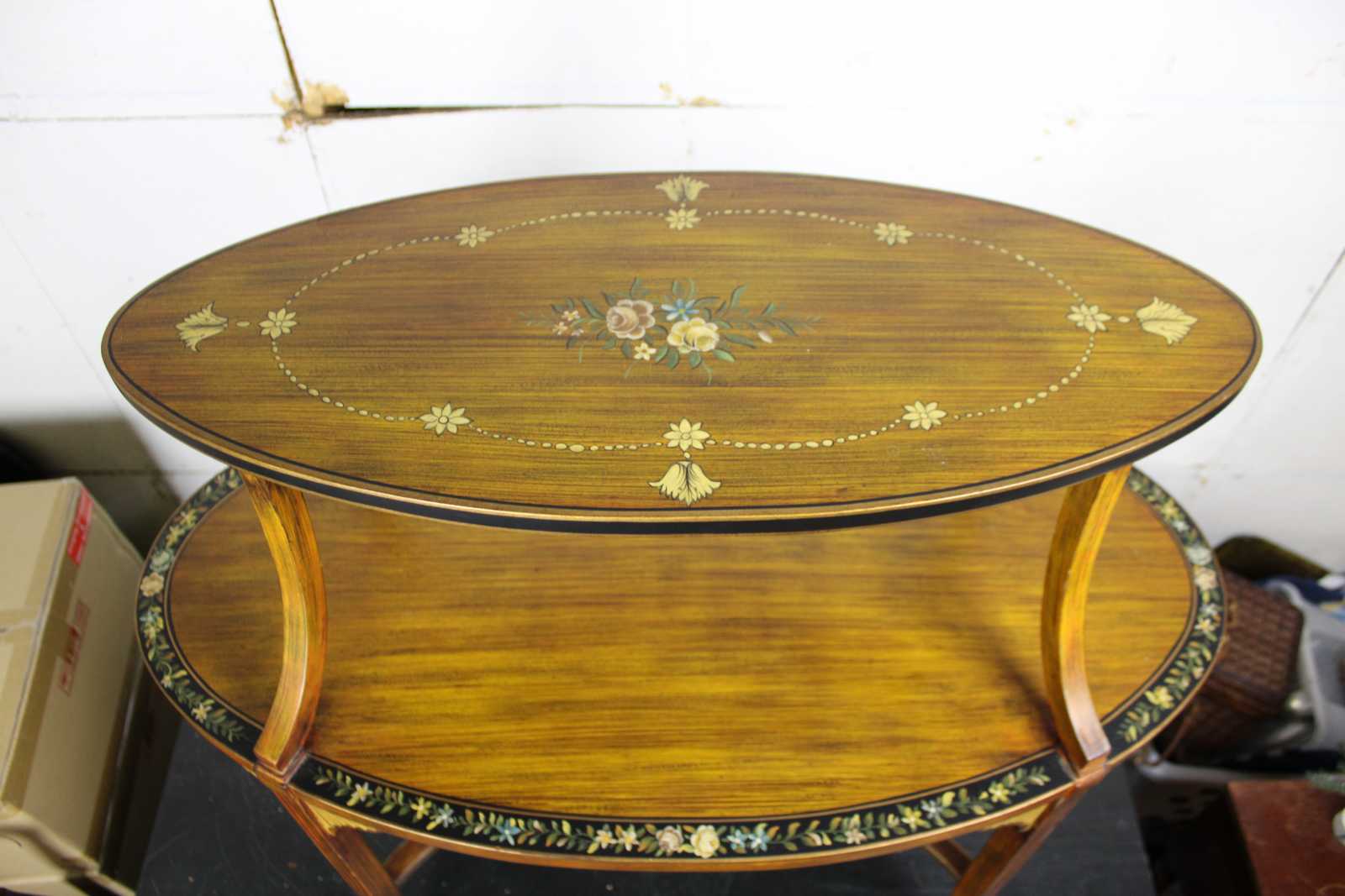 Late 20th century Edwardian inspired tray top Étagère by Sarreid Ltd. Features oval surfaces with a painted grain, black trim and floral painted detail. Incudes a neoclassincal inspired x stretcher, fluted legs and winged trim in the style of inlay.