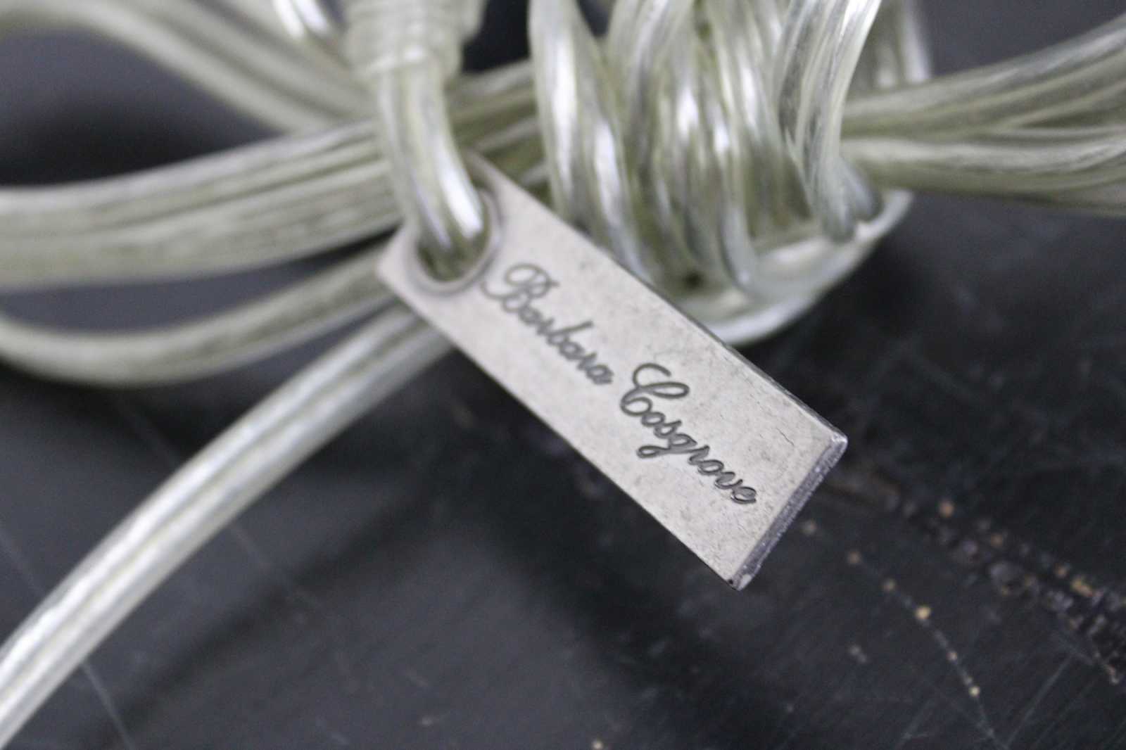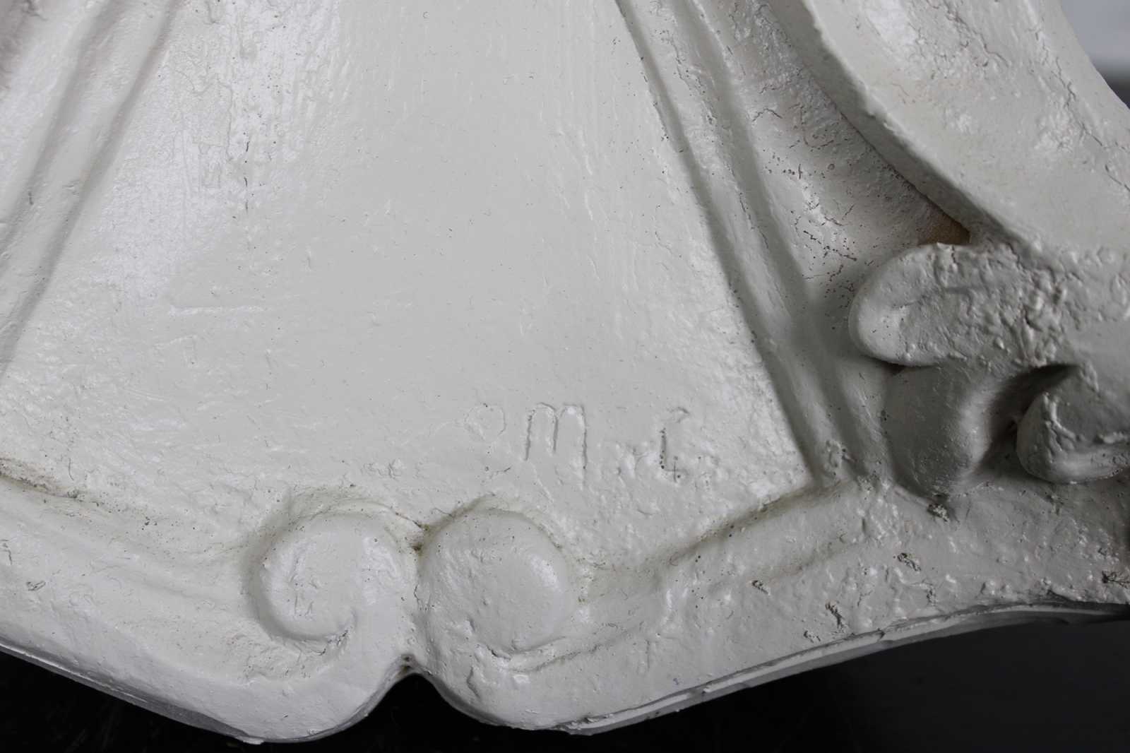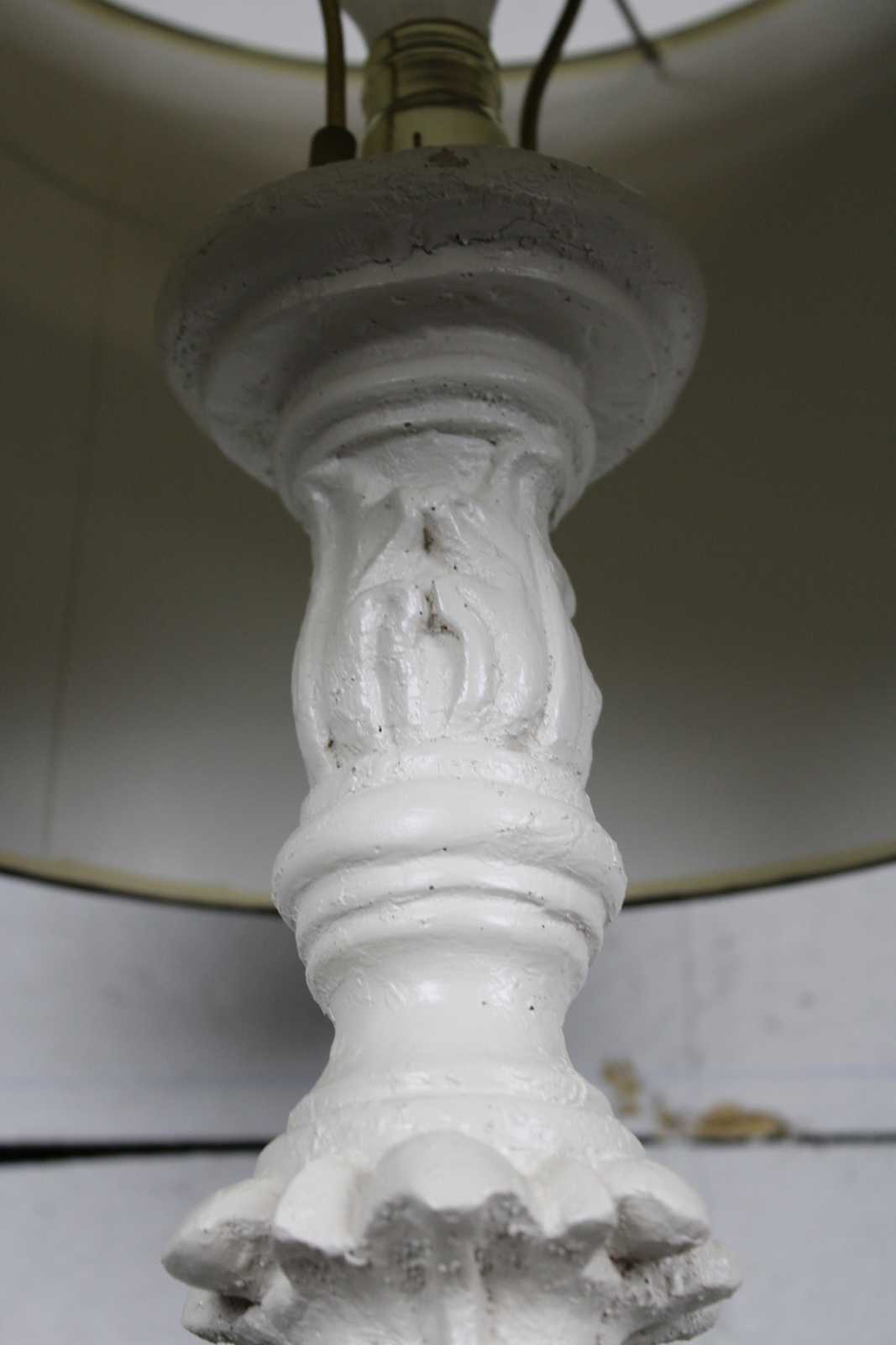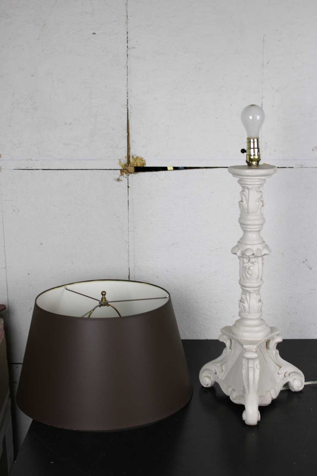 Vintage Barbara Cosgrove lamp. Features a baroque styling with white painted finish, footed tripod base and black shade.