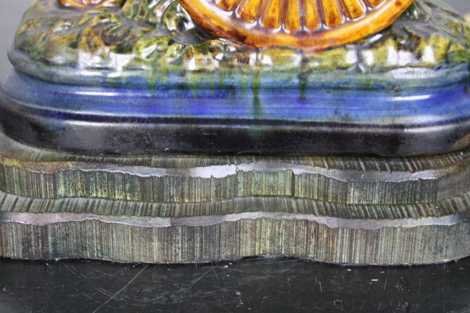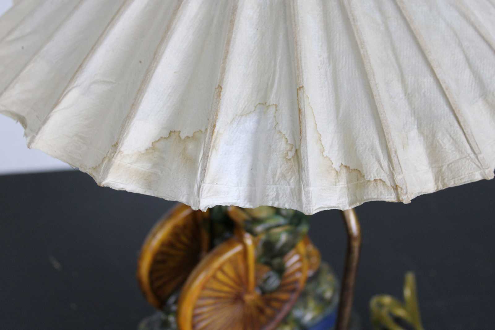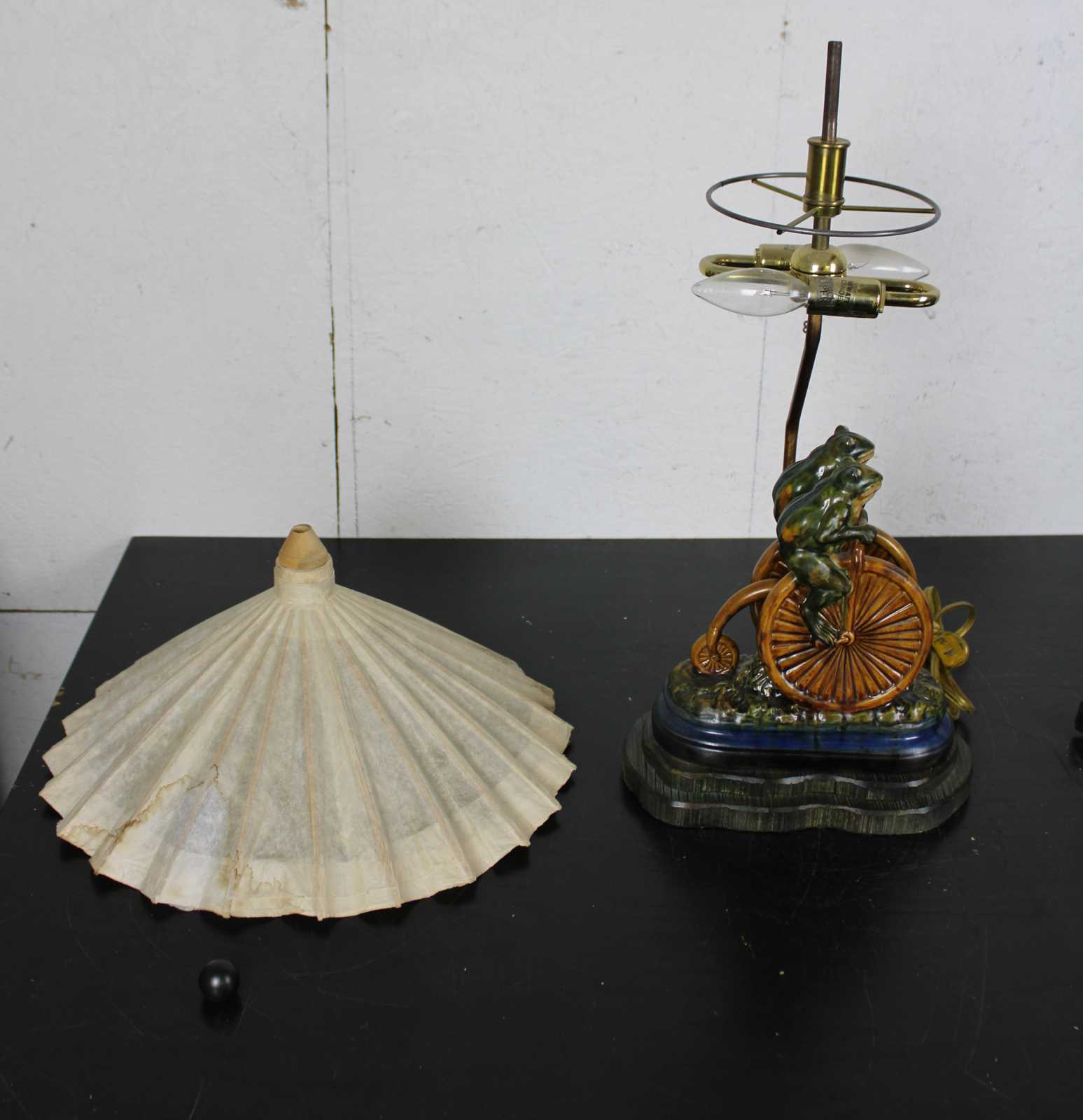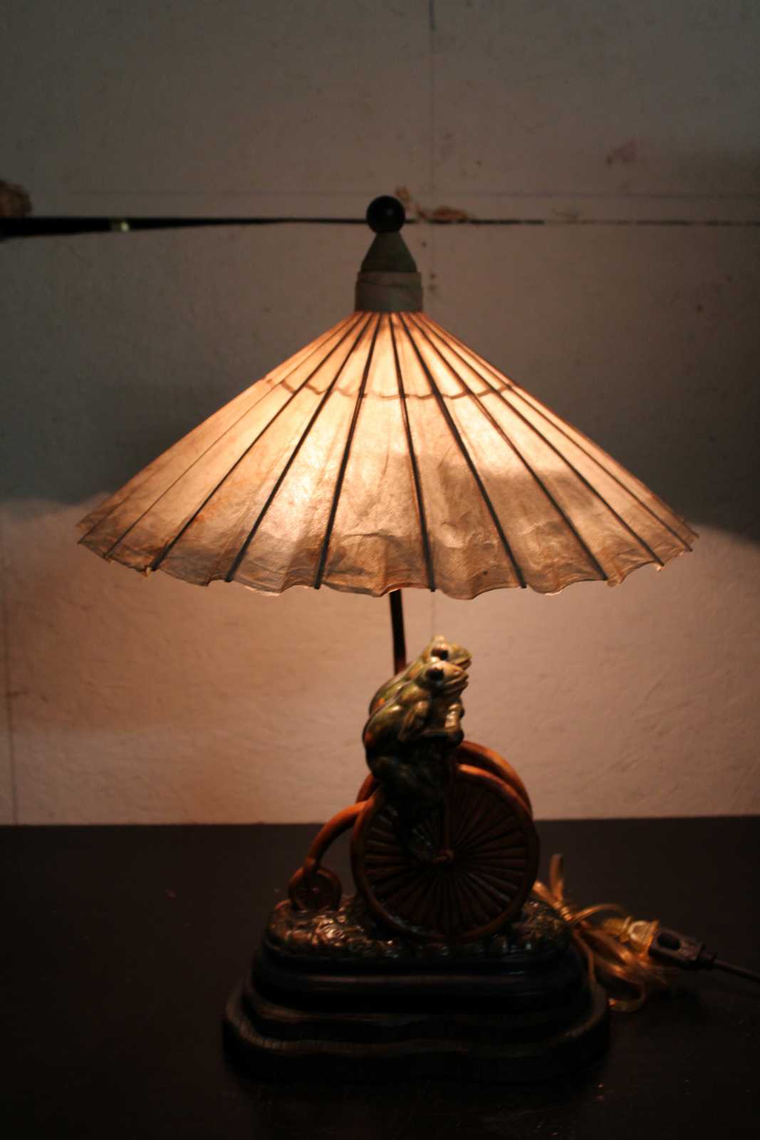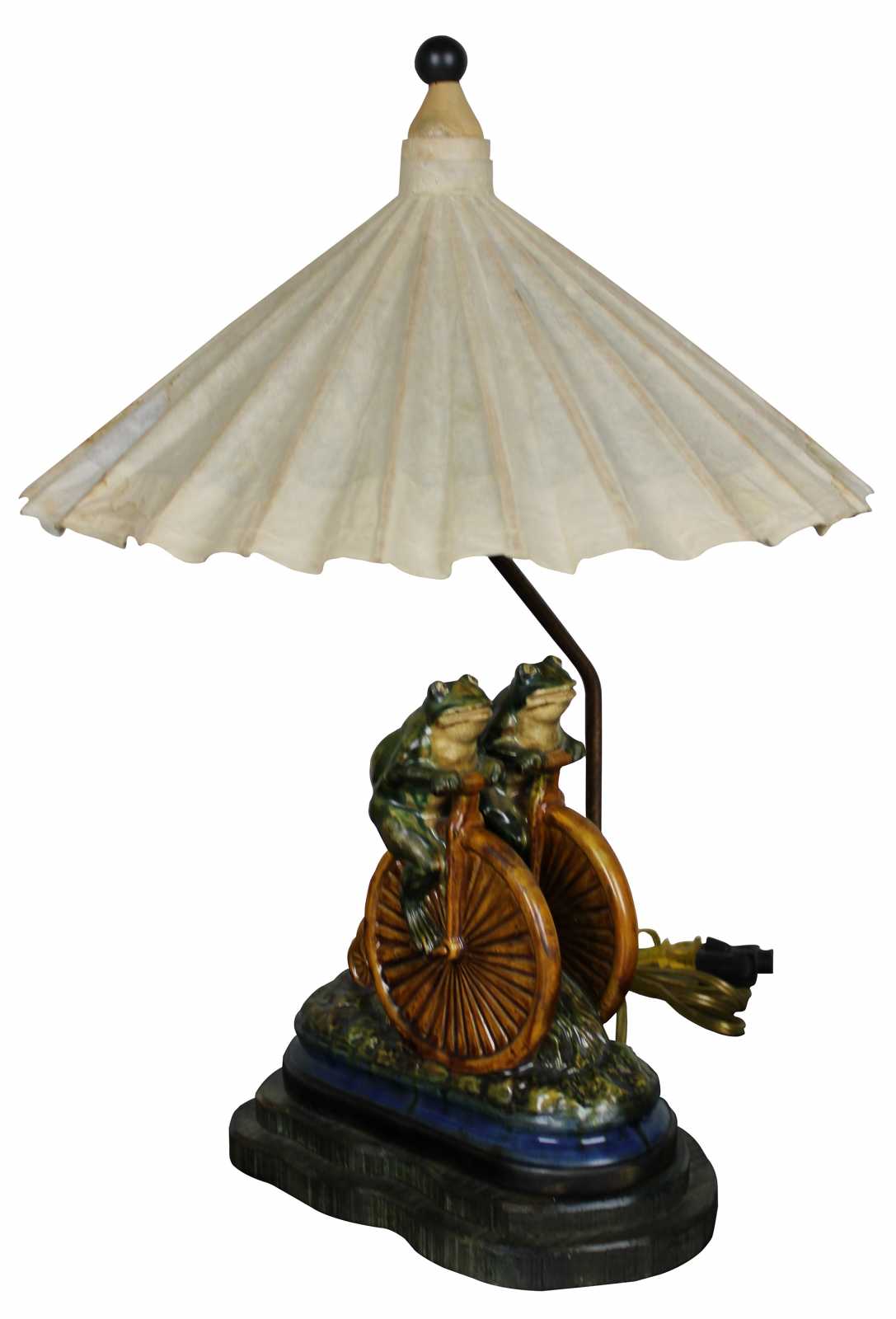Late 20th century Frederick Cooper desk lamp. A figural design in ceramic feautiring two frogs riding a penny farthing bicycle over wood cut base. Includes two way lights and a parasoul shade.