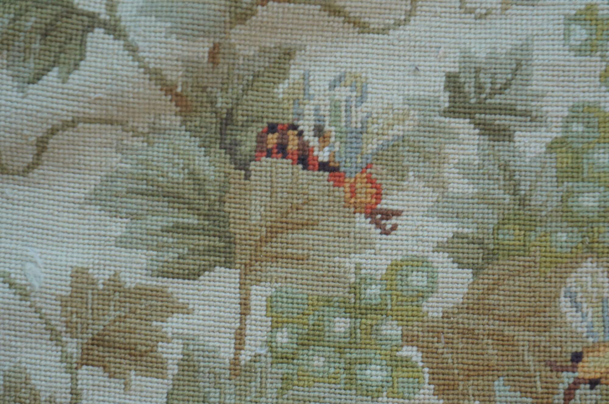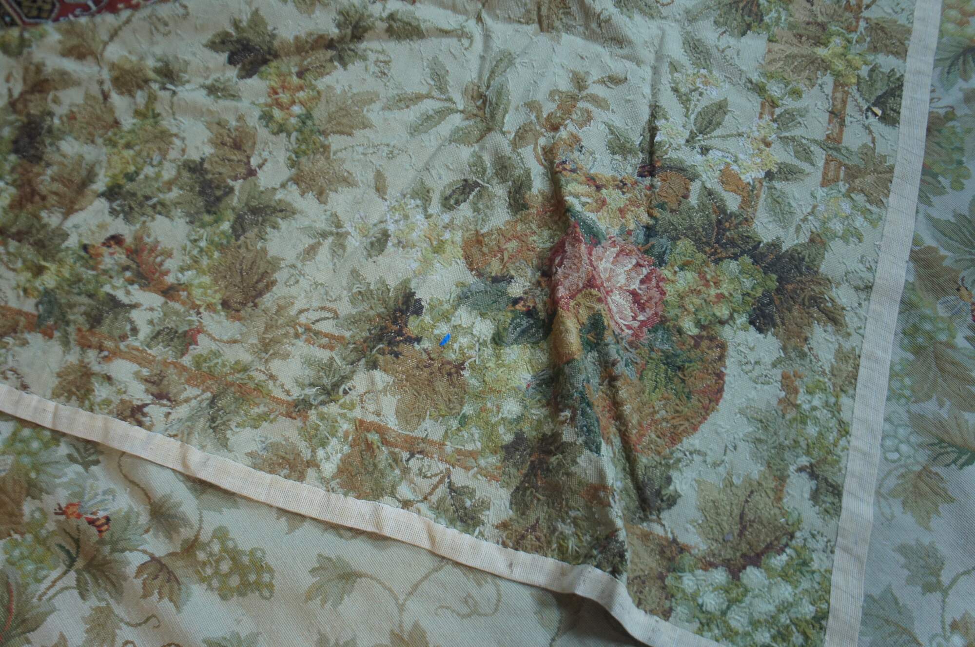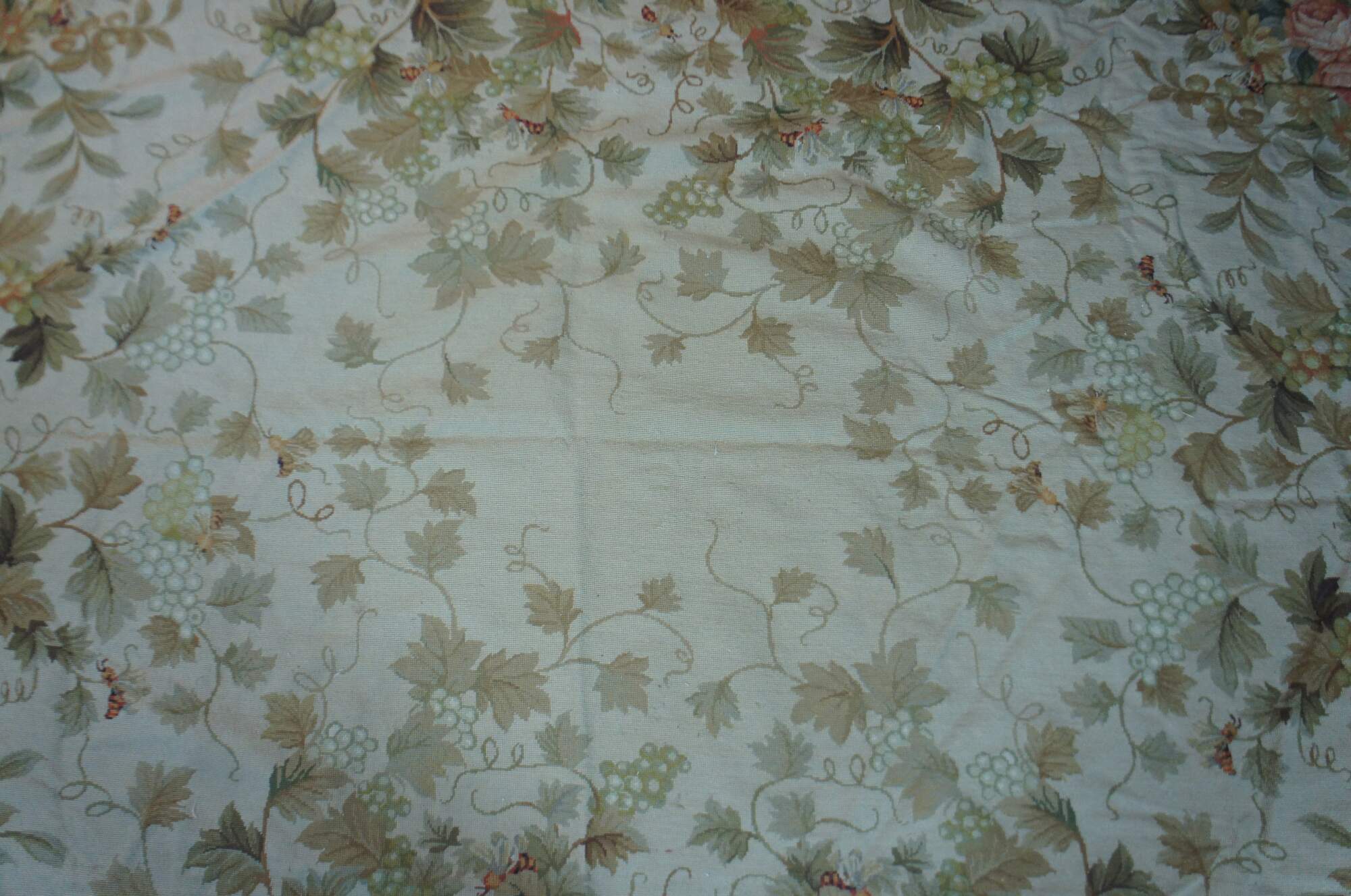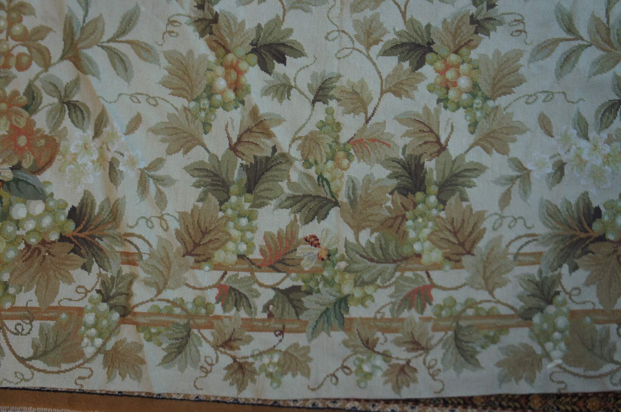 Large antique French aubusson needlepoint tapestry featuring a design of grape vines and leaves, with bees buzzing among the foliage and baskets of roses at the corners.