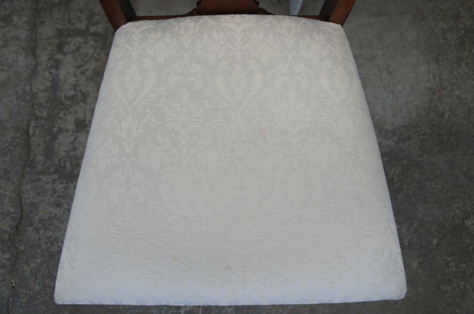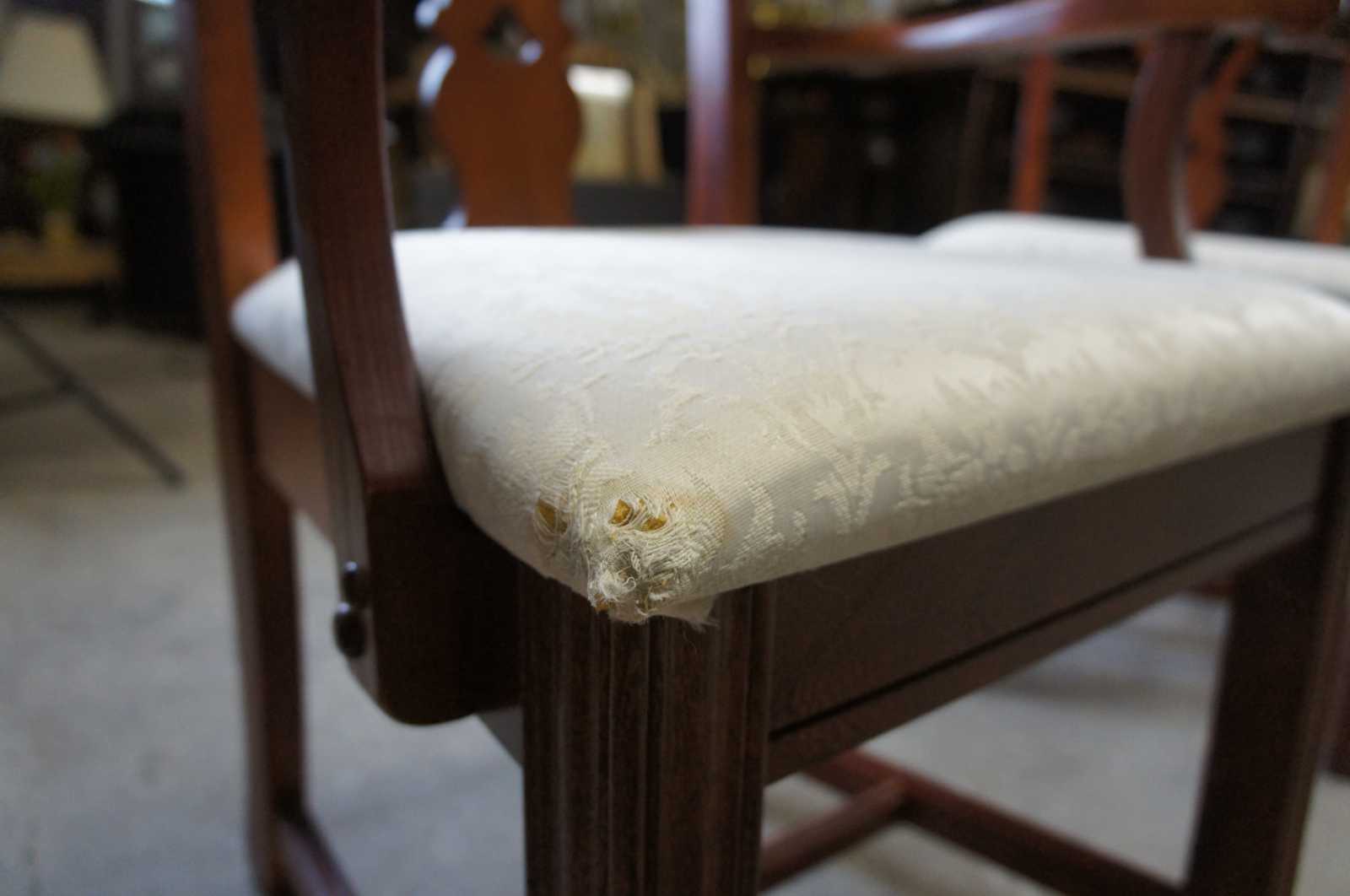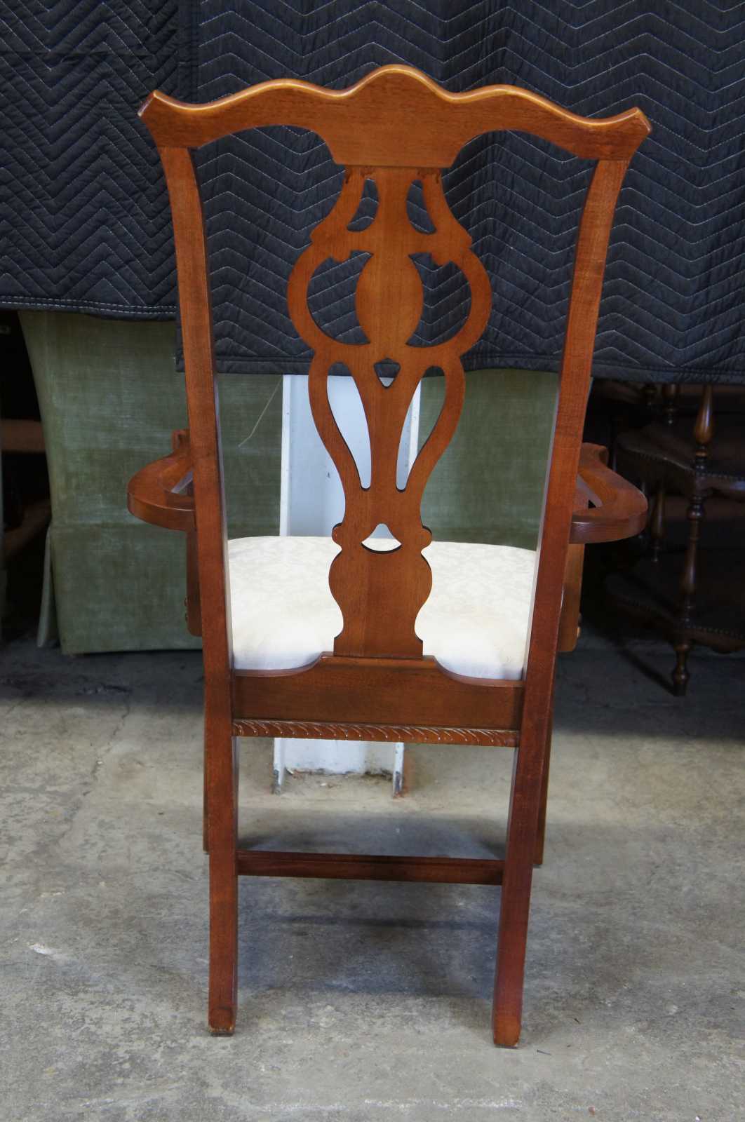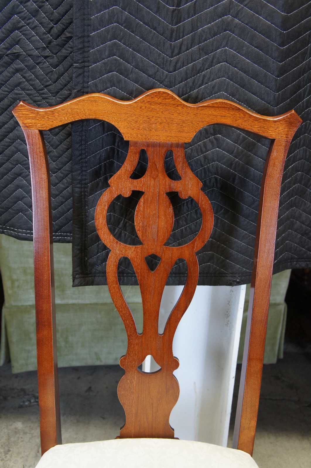 6 Broyhill dining chairs. Made from Mahogany with a serpentine rail over a pierced back. Features straight front legs with a fluted design. Seats are upholstered in a white french floral design. 5265-81