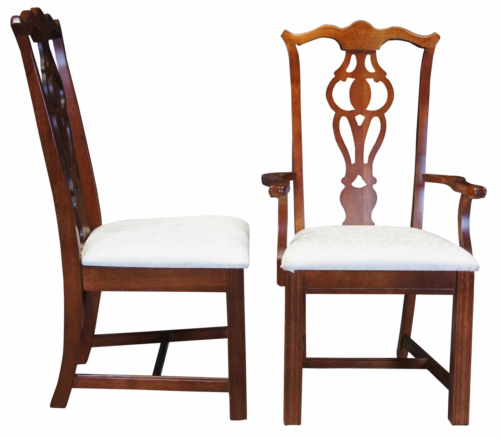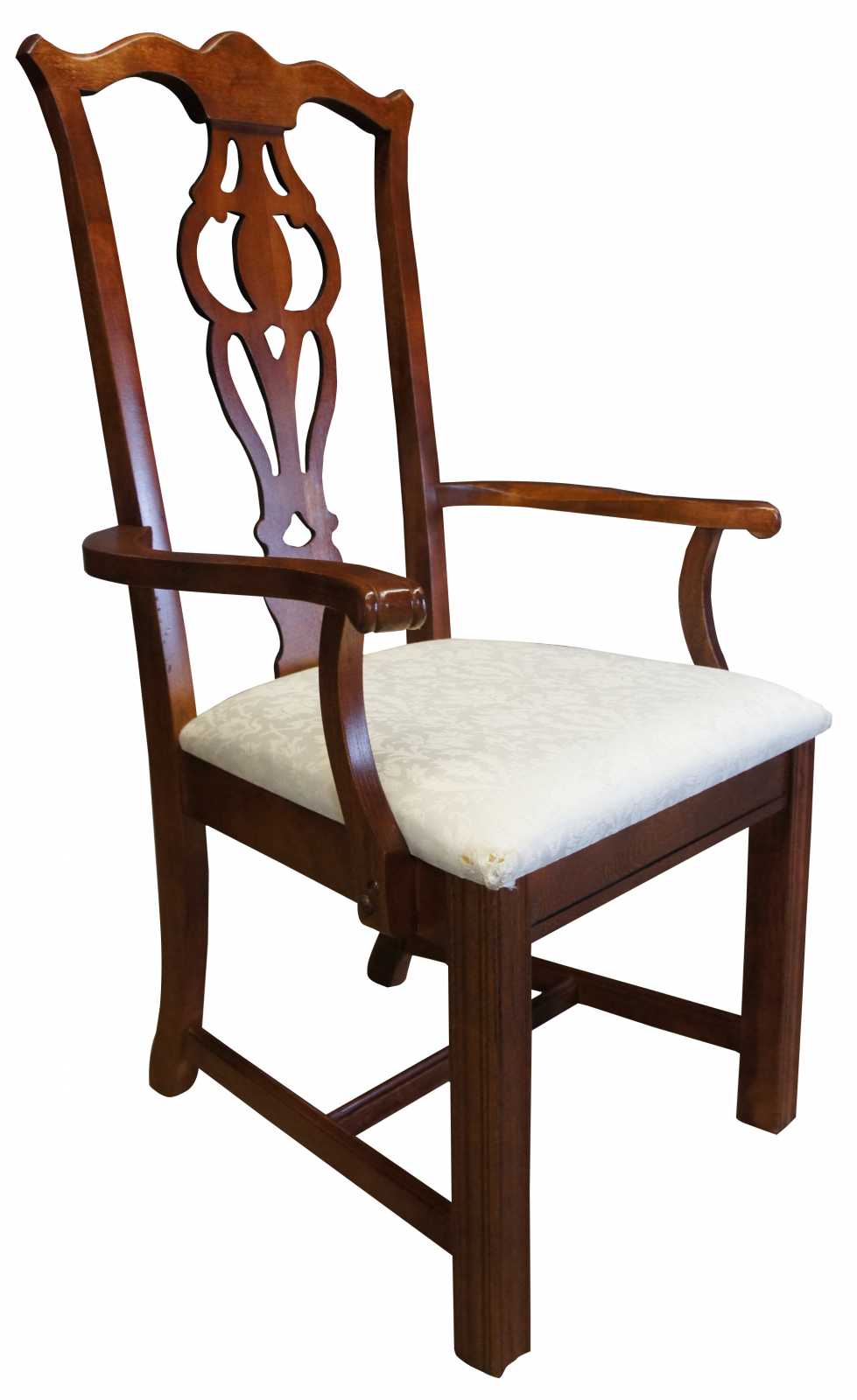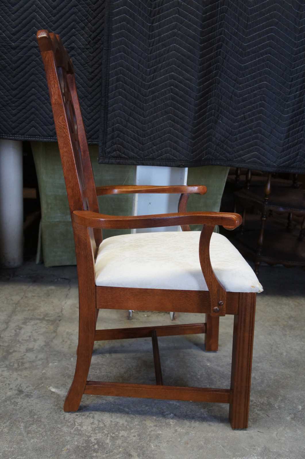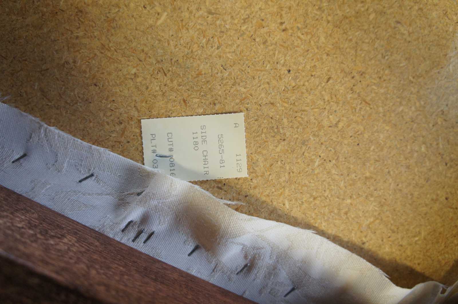 6 Broyhill dining chairs. Made from Mahogany with a serpentine rail over a pierced back. Features straight front legs with a fluted design. Seats are upholstered in a white french floral design. 5265-81