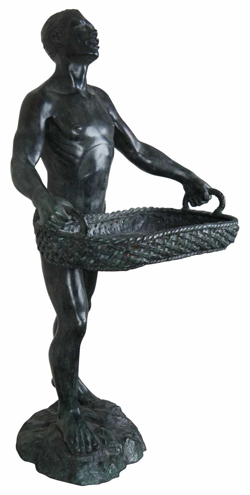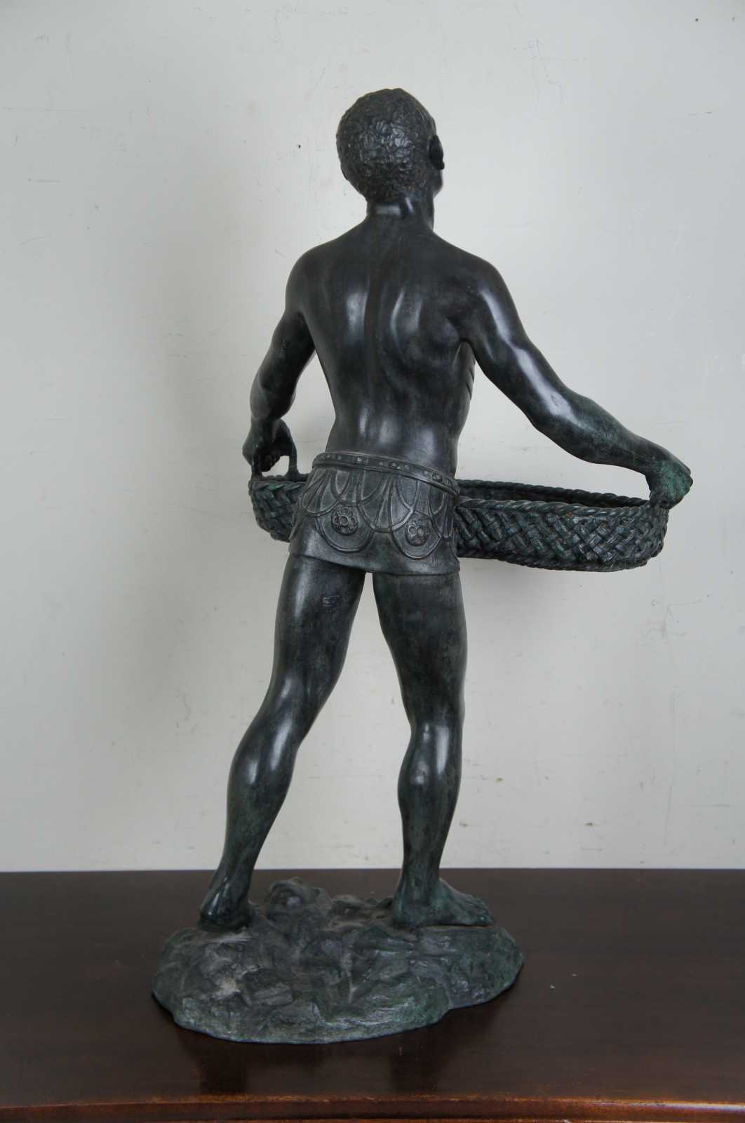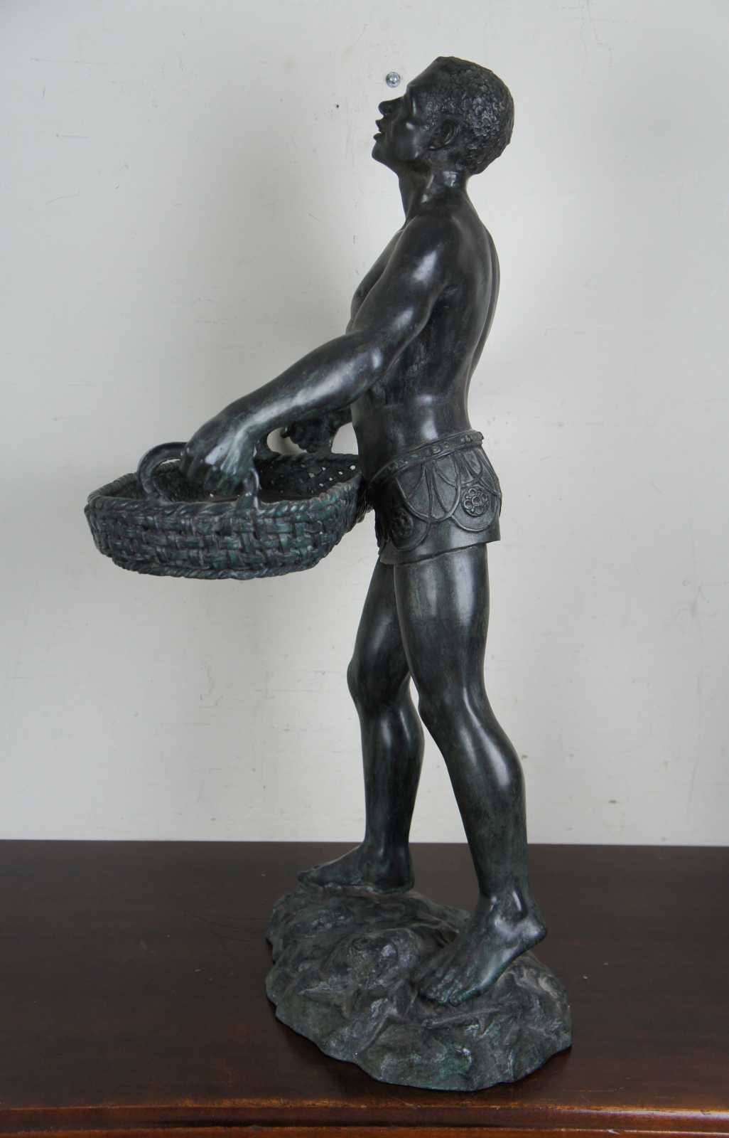 Maitland Smith figural bronze statue, late 20th Century. Features a toned African man in ancient greek inspired lower garment holding a woven basket. Marked along underside. Perfect for use as dumbwaiter, stand or to hold your curiosities.
