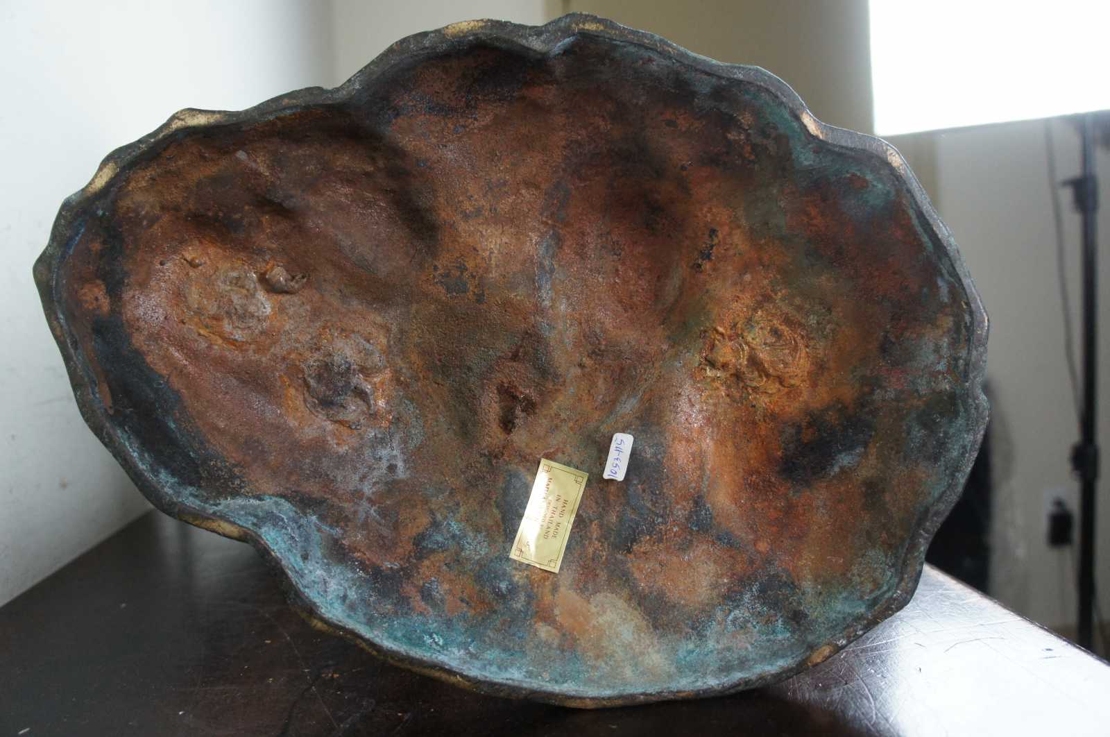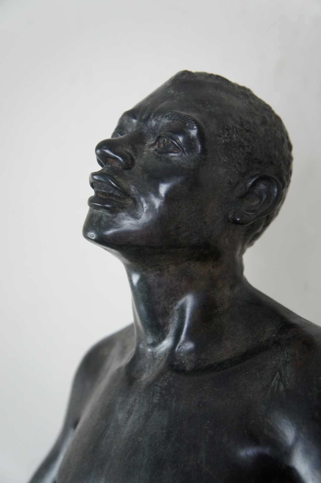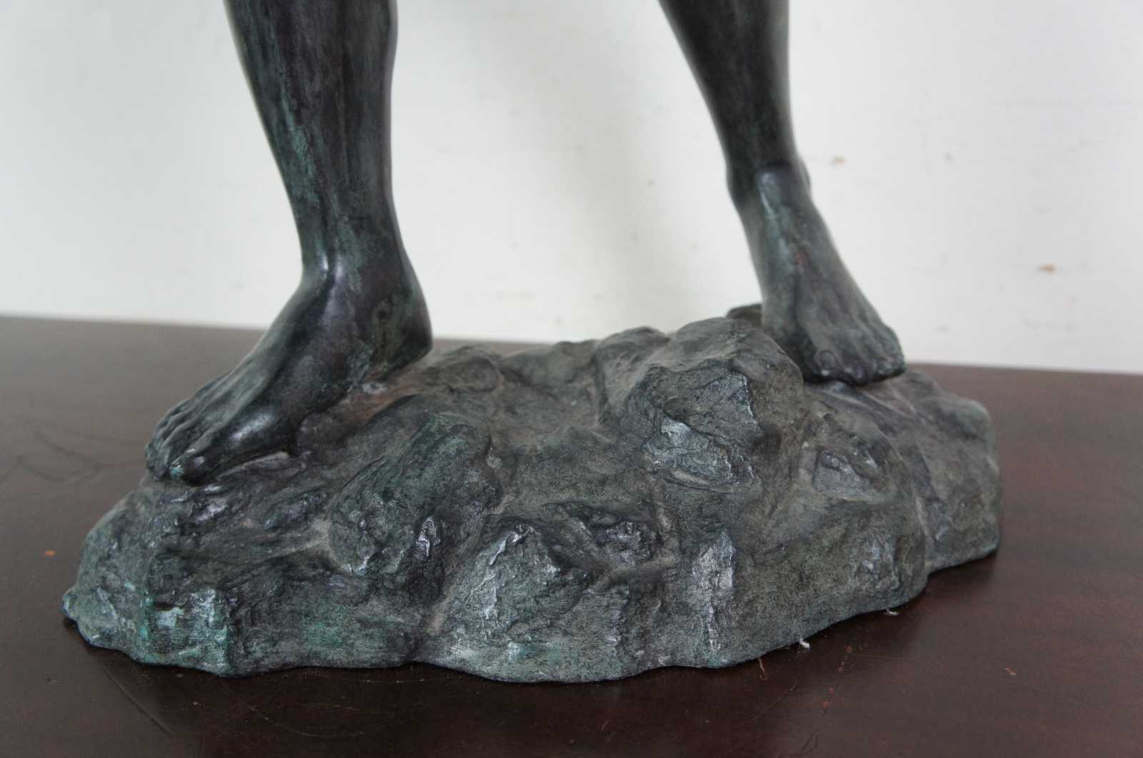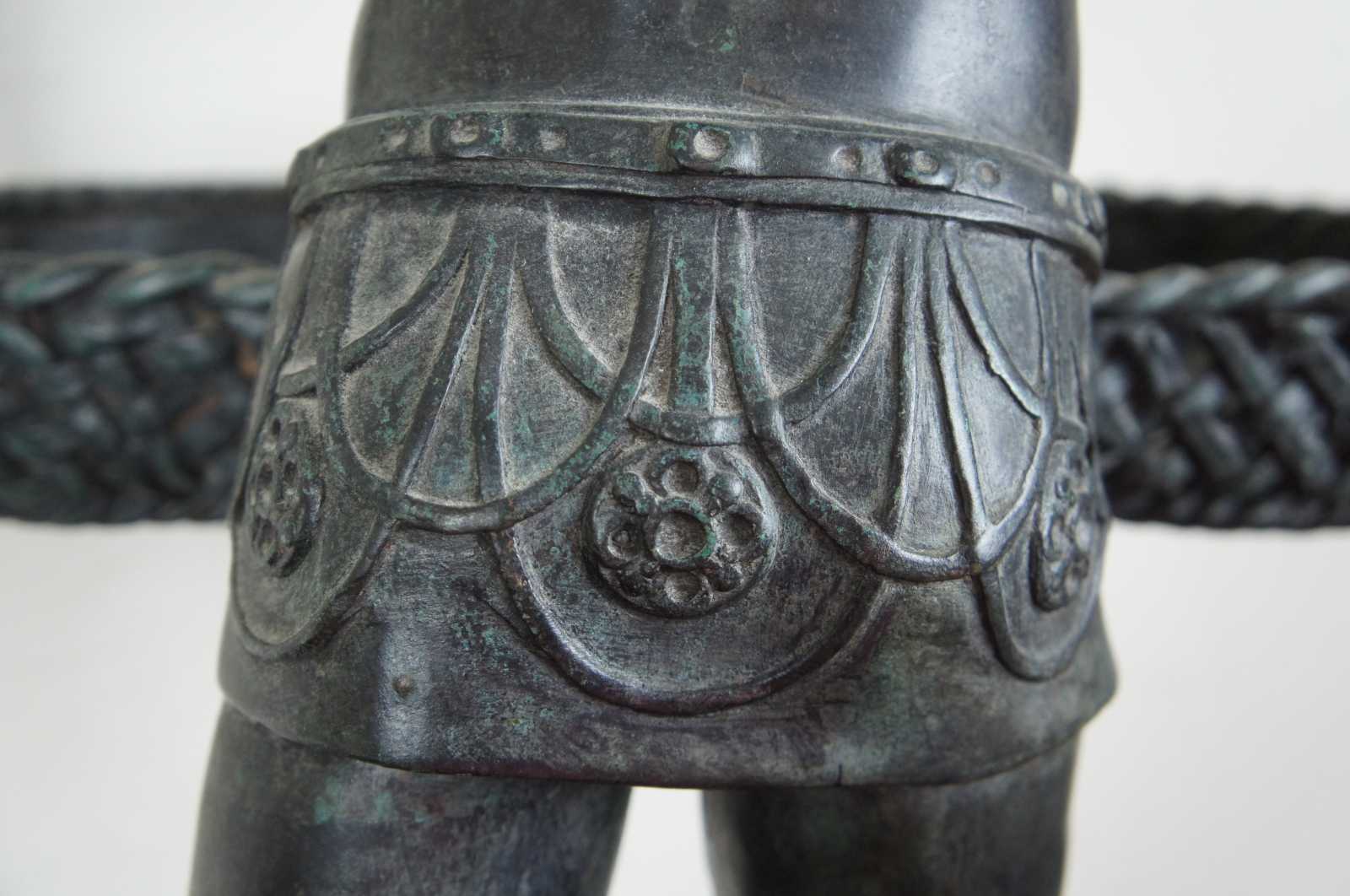 Maitland Smith figural bronze statue, late 20th Century. Features a toned African man in ancient greek inspired lower garment holding a woven basket. Marked along underside. Perfect for use as dumbwaiter, stand or to hold your curiosities.