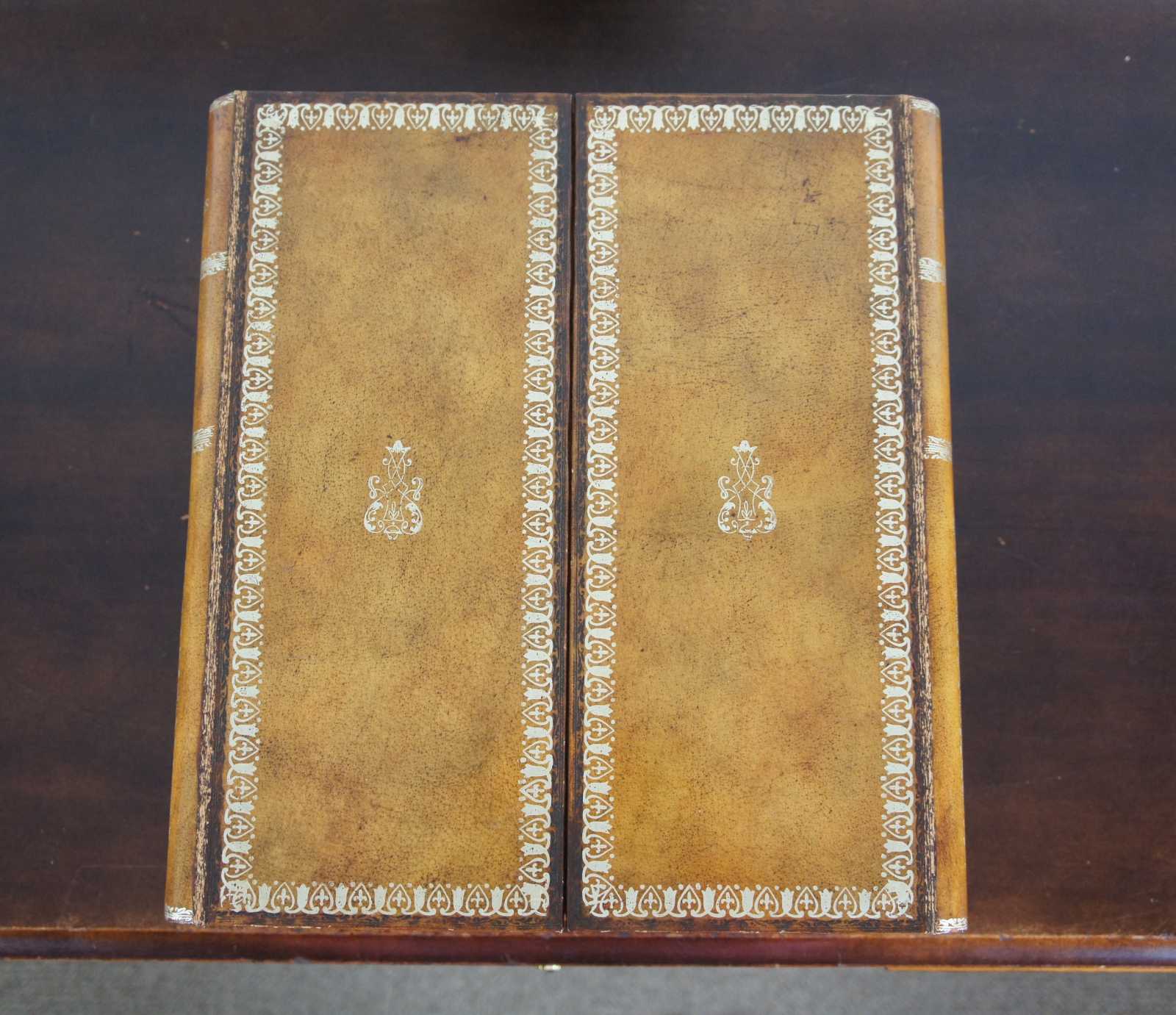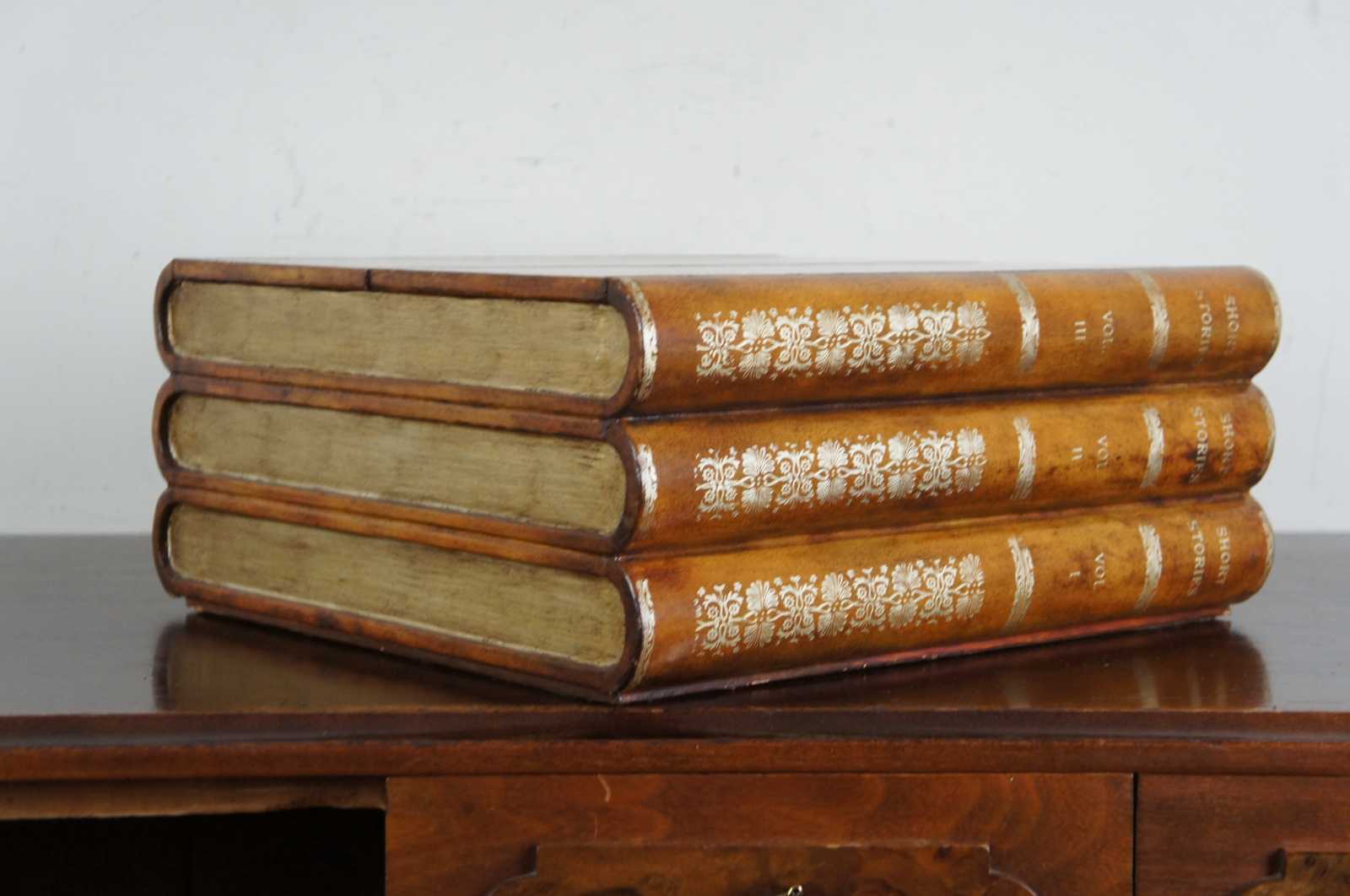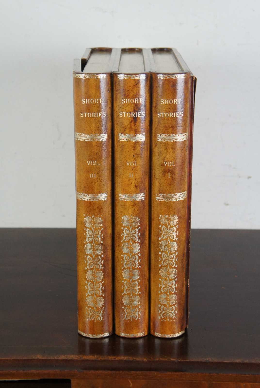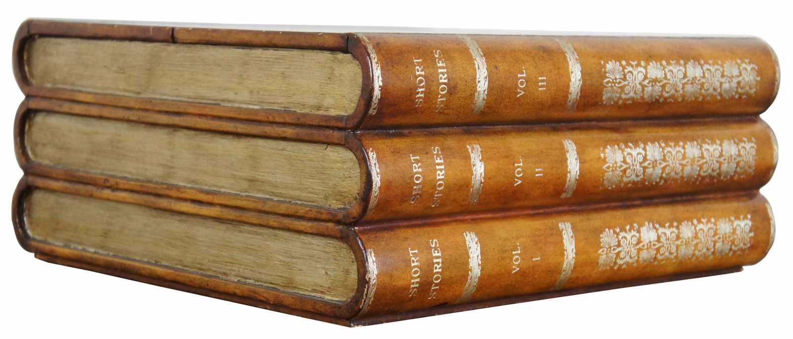 Large tooled leather triple book box by Maitland Smith, late 20th century. Features Volumes I, II and III of Short Stories. Interior opens to a lined and diveded two compartment storage area.