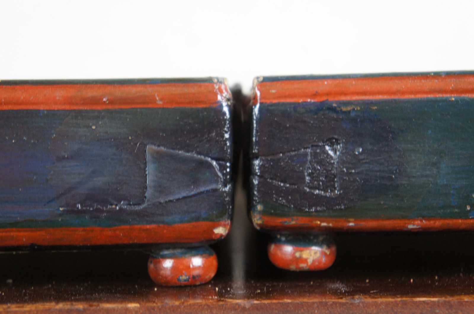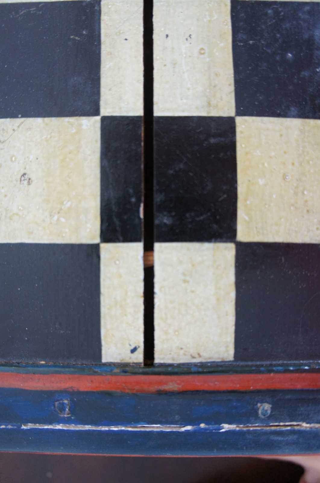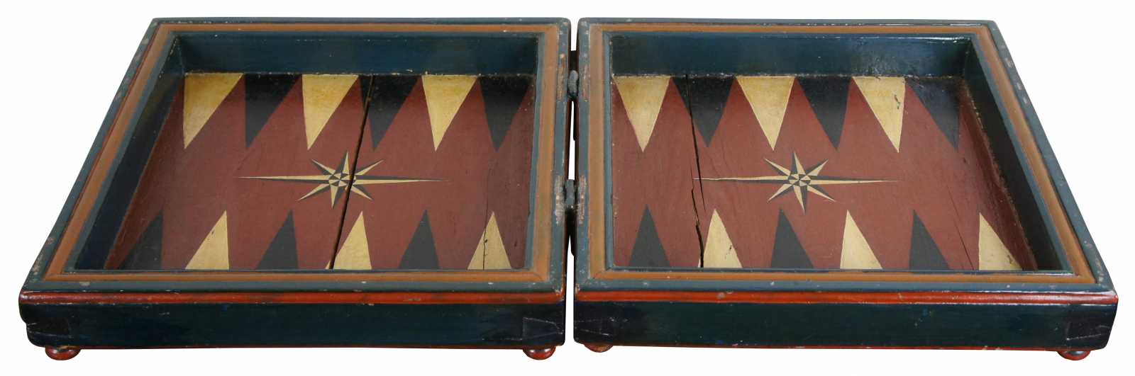 Primitive 19th Century antique game board featuring chess, checkers, backgammon and nine man morris. The board is hand painted and detailed anno 1817, footed on both sides with bun feet and opens to backgammon playing surface.