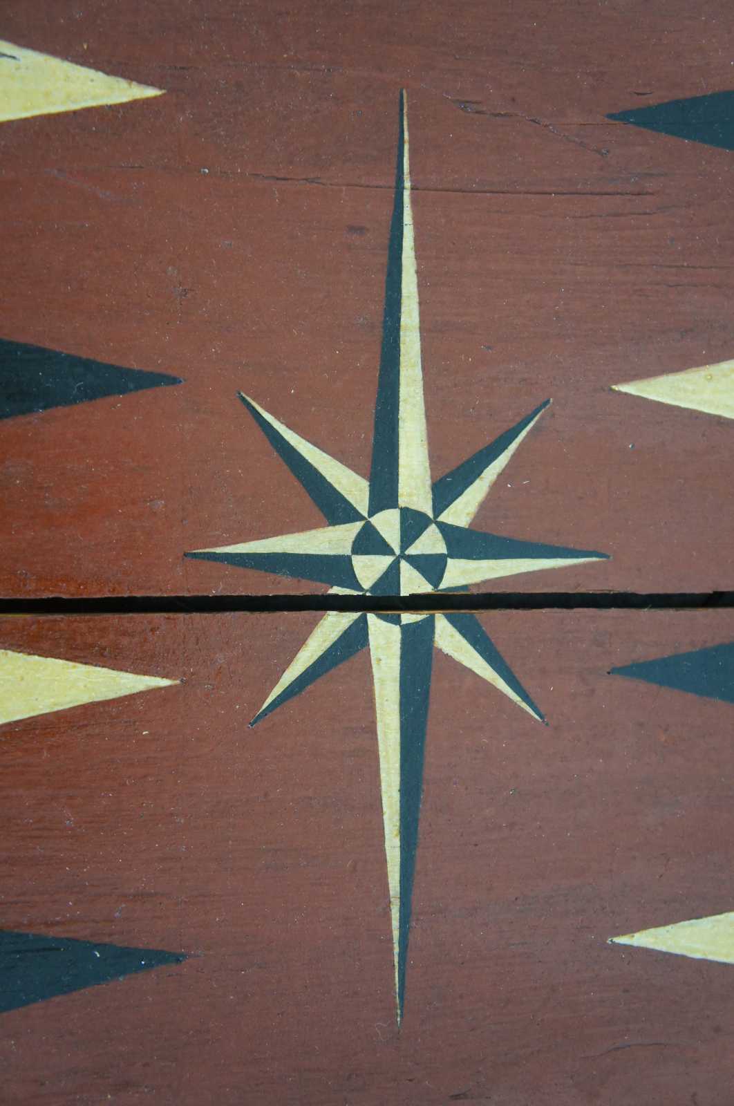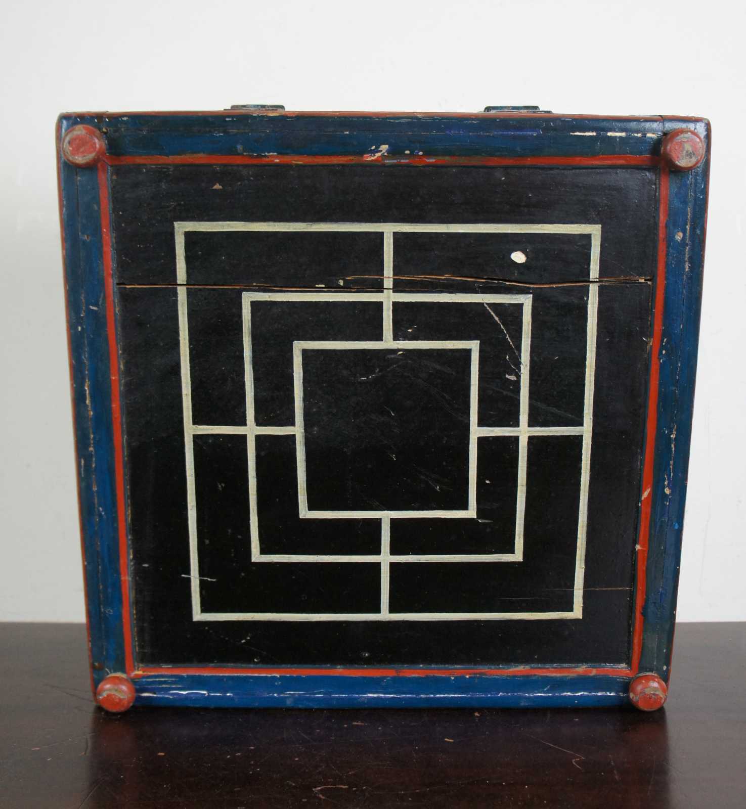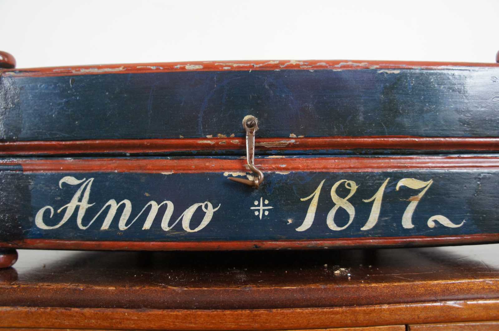 Primitive 19th Century antique game board featuring chess, checkers, backgammon and nine man morris. The board is hand painted and detailed anno 1817, footed on both sides with bun feet and opens to backgammon playing surface.