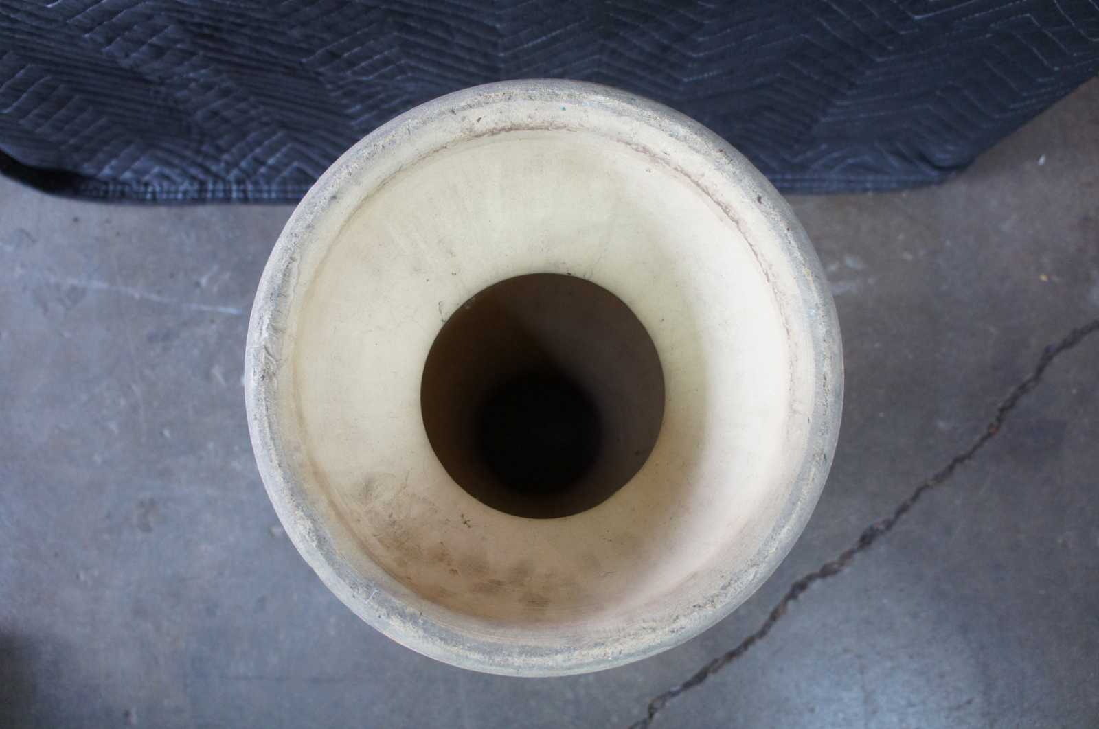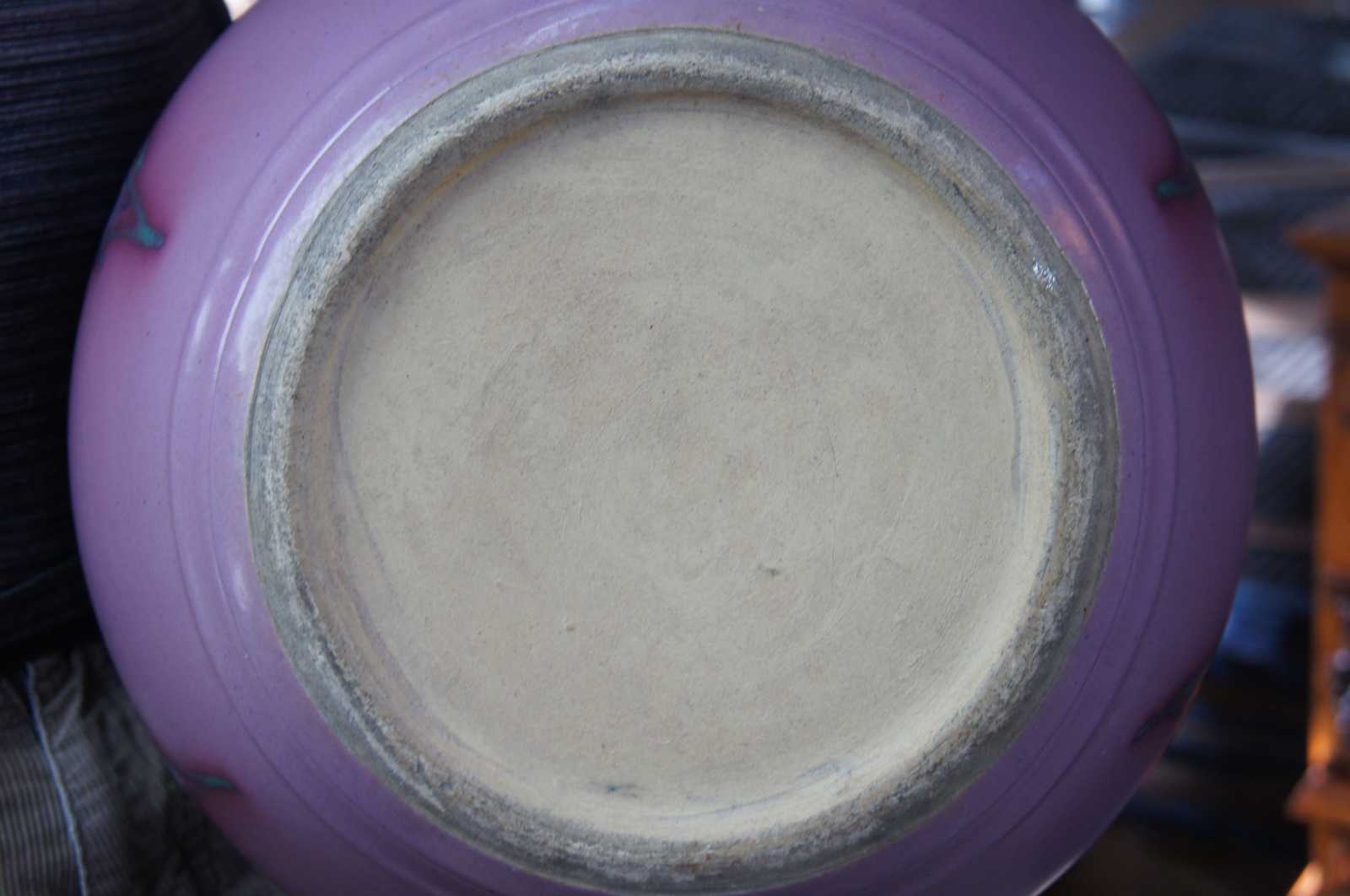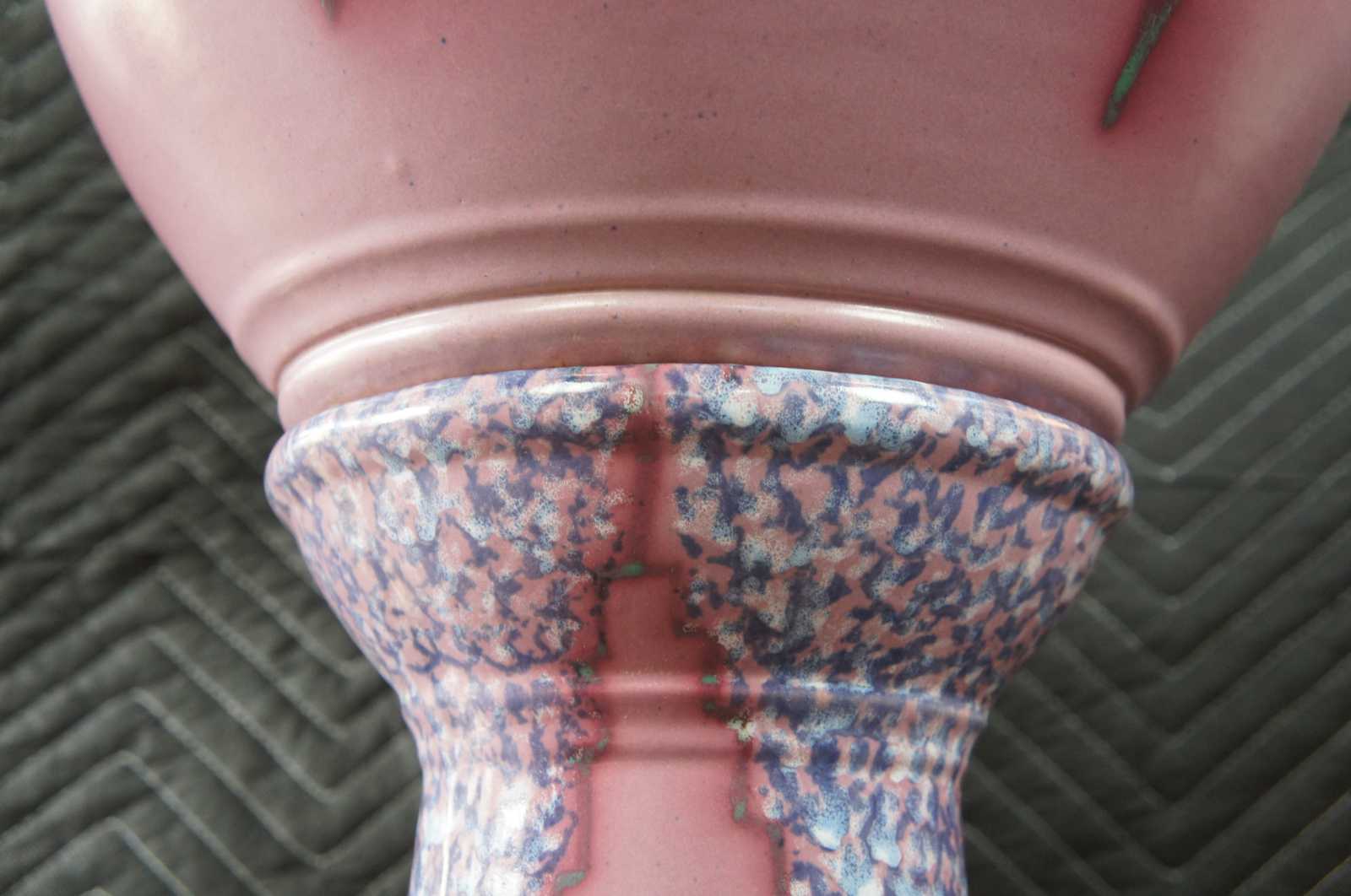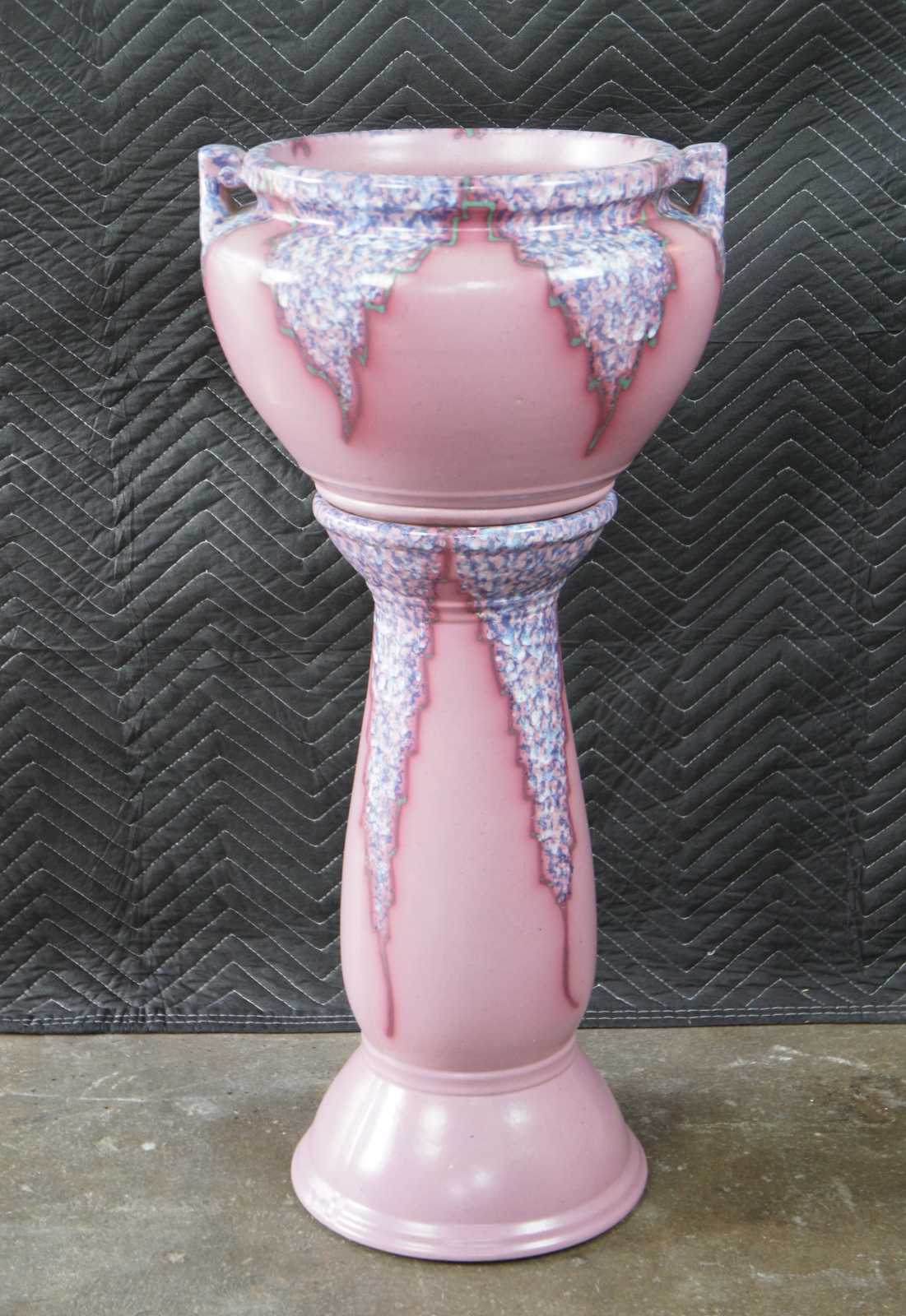 An exquisite antique ceramic art pottery handled jardiniere and pedestal. Features a mottled purple southwestern design throughout.