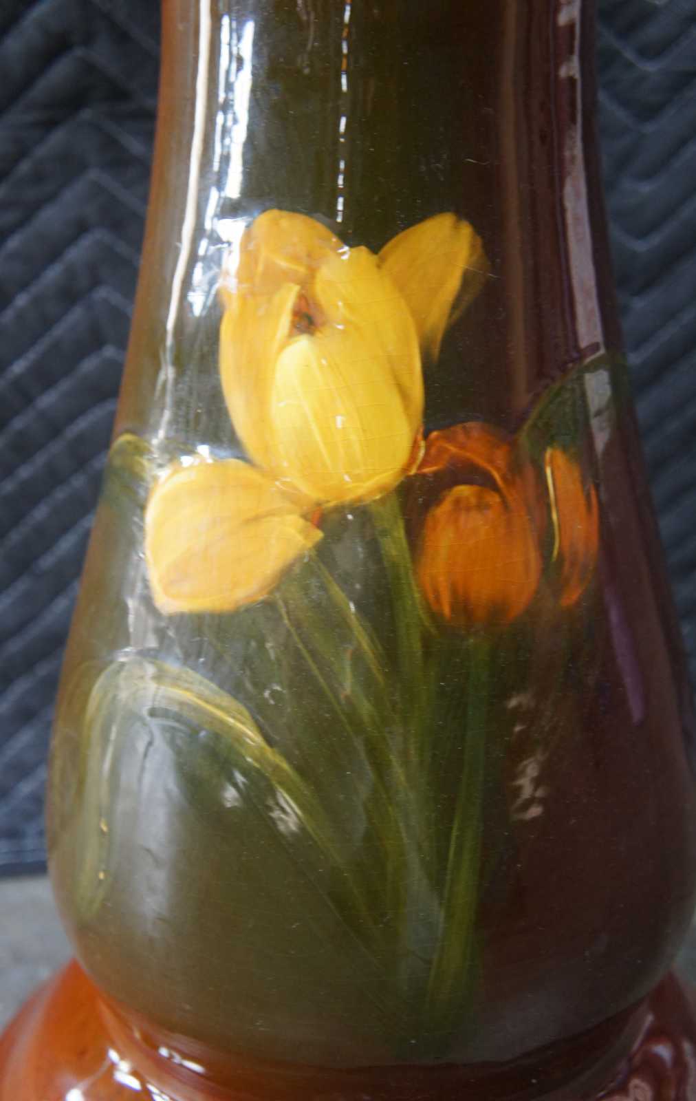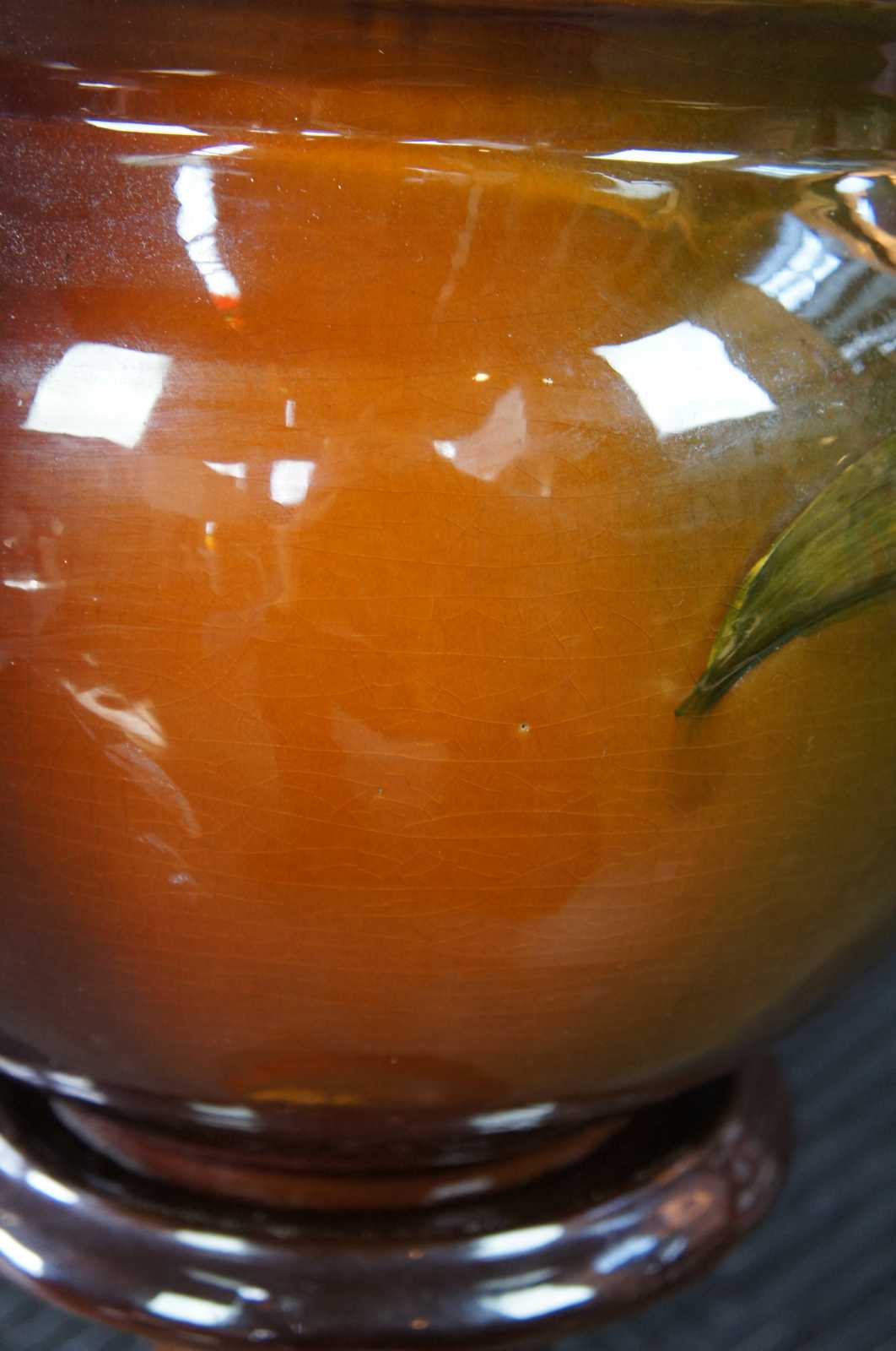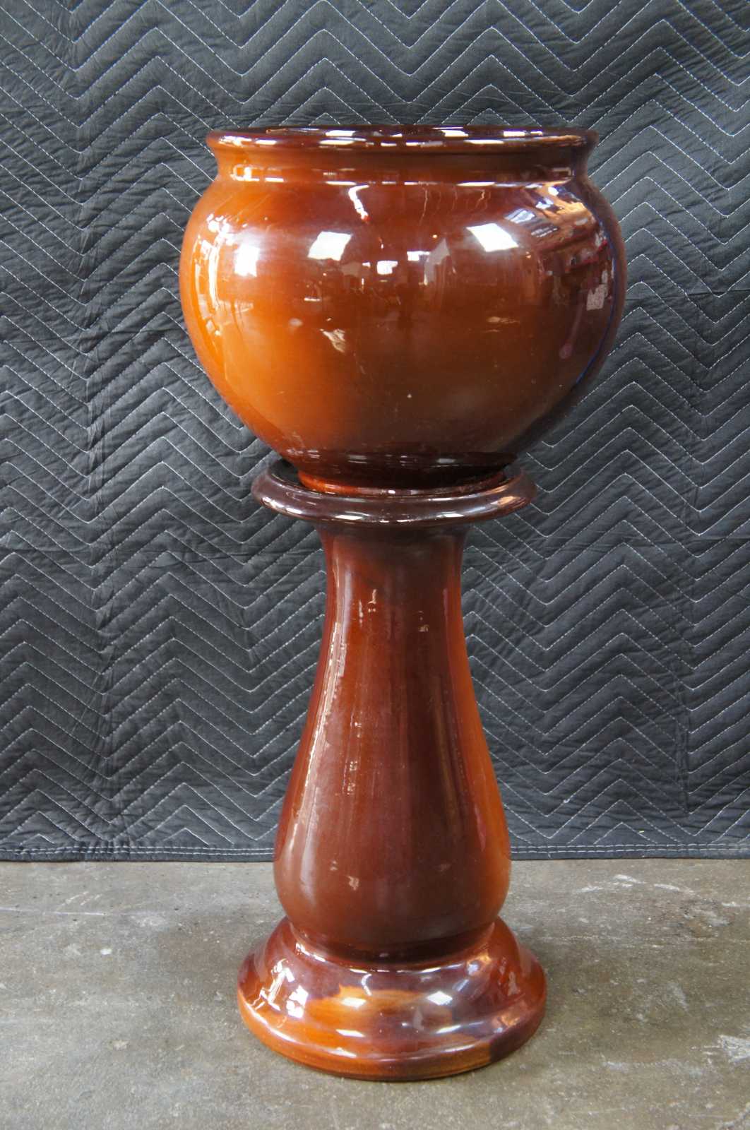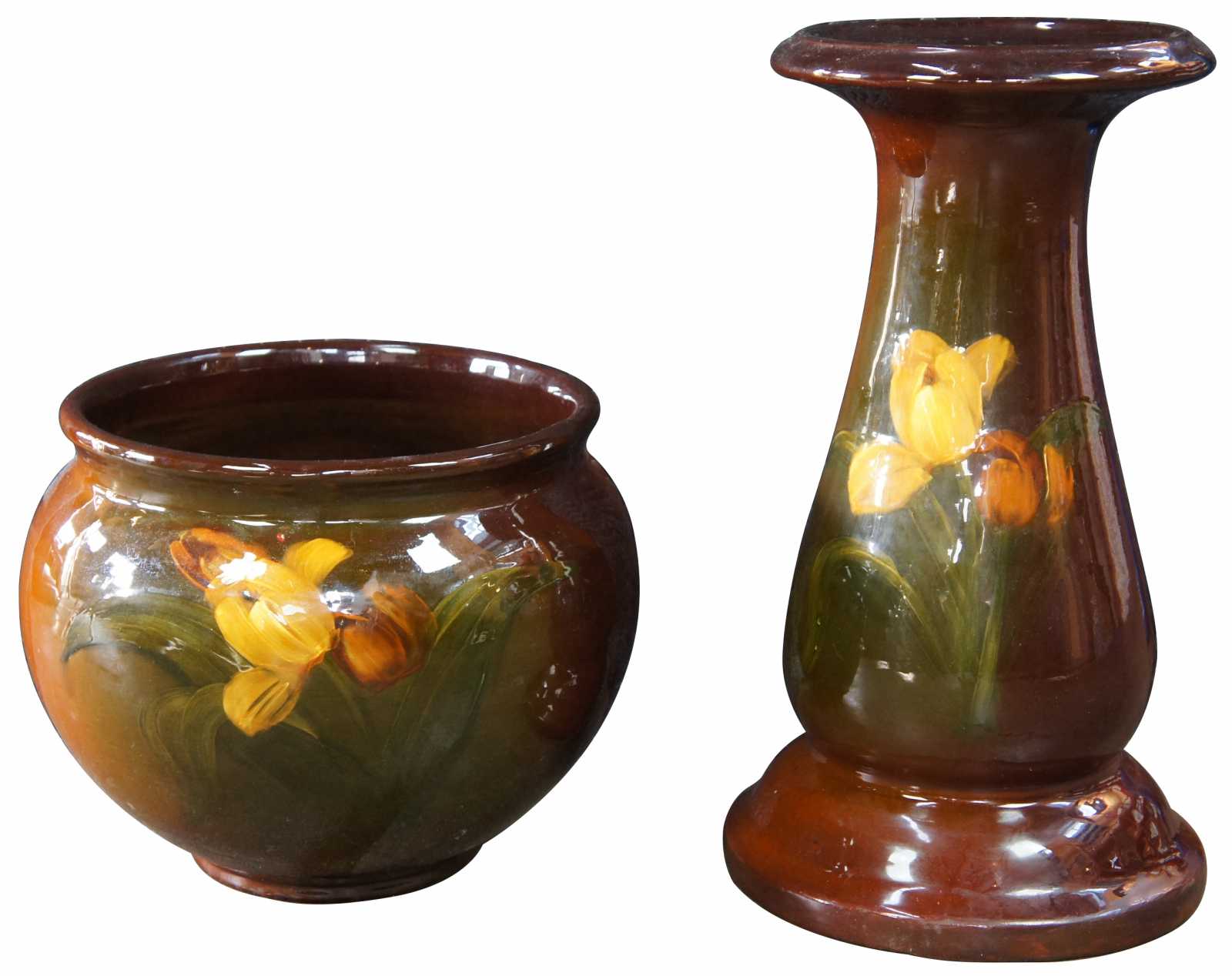 A stunning antique glazed ceramic jardiniere and pedestal. Features a brown glaze with hand painted roses. Attributed to Weeler or Owens Pottery, but unmarked along base.