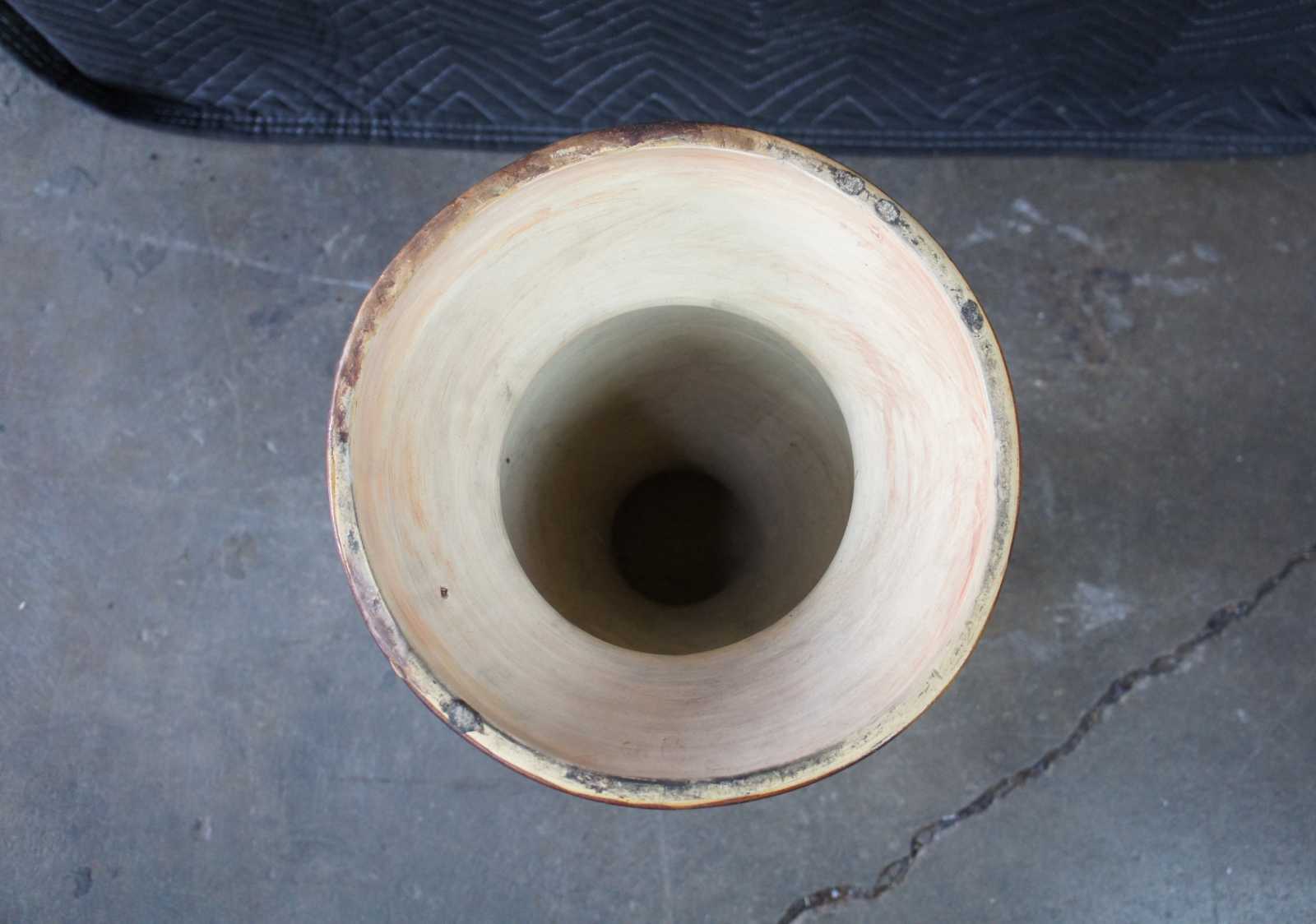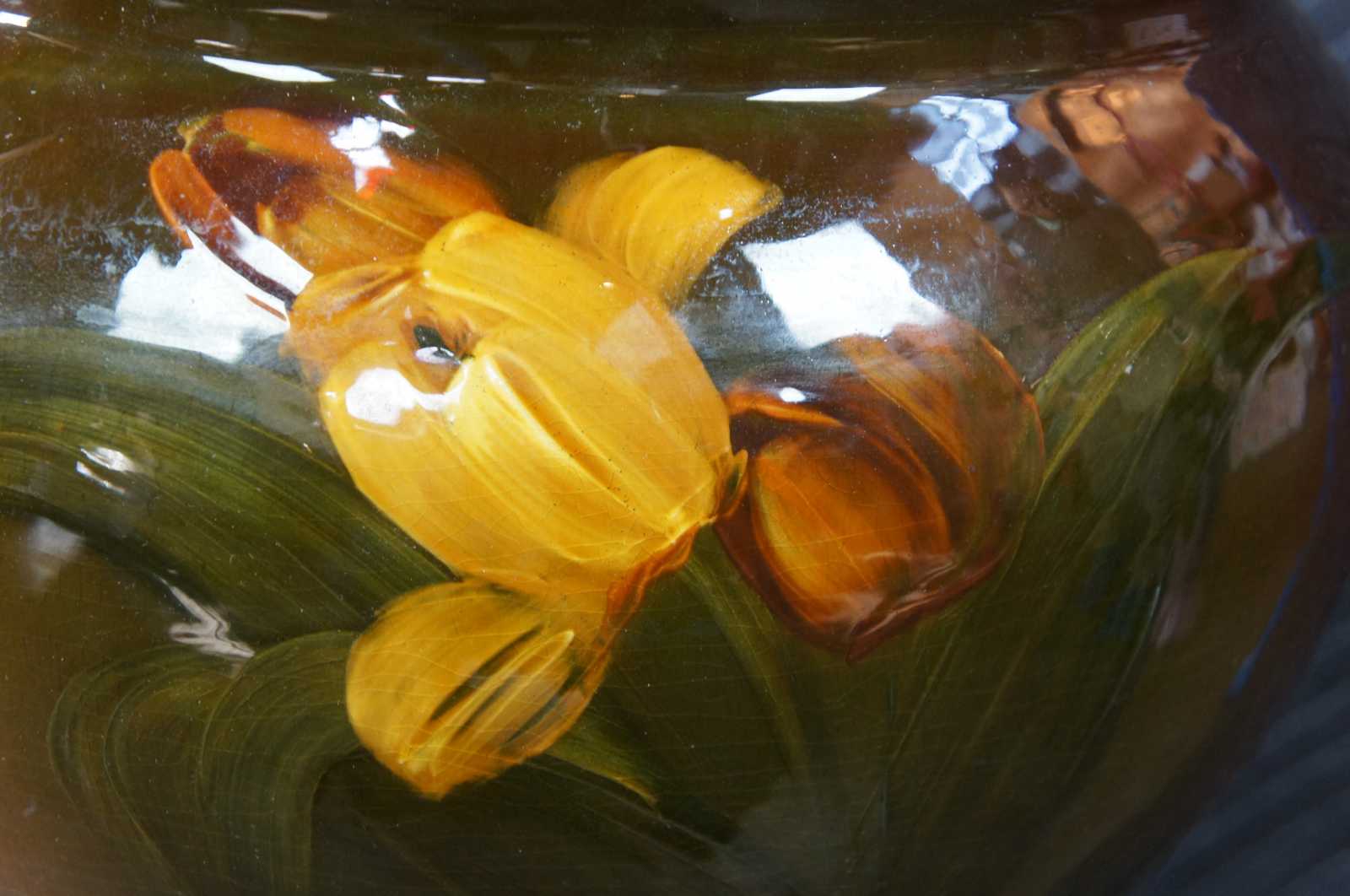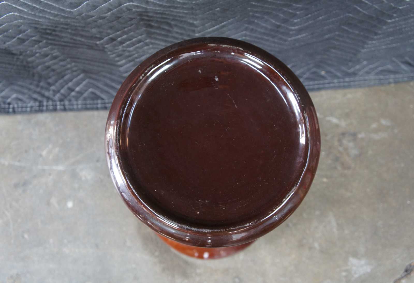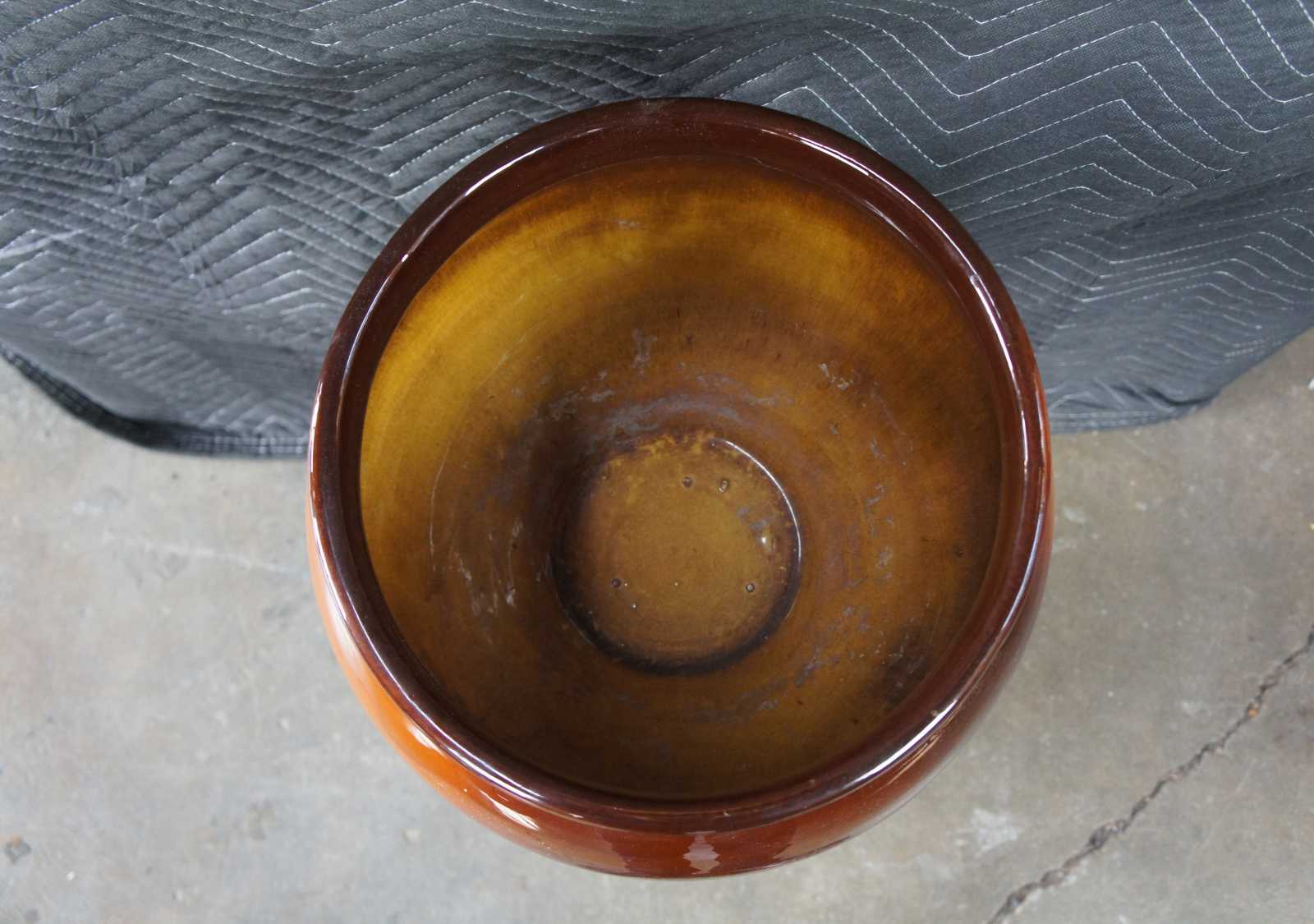 A stunning antique glazed ceramic jardiniere and pedestal. Features a brown glaze with hand painted roses. Attributed to Weeler or Owens Pottery, but unmarked along base.