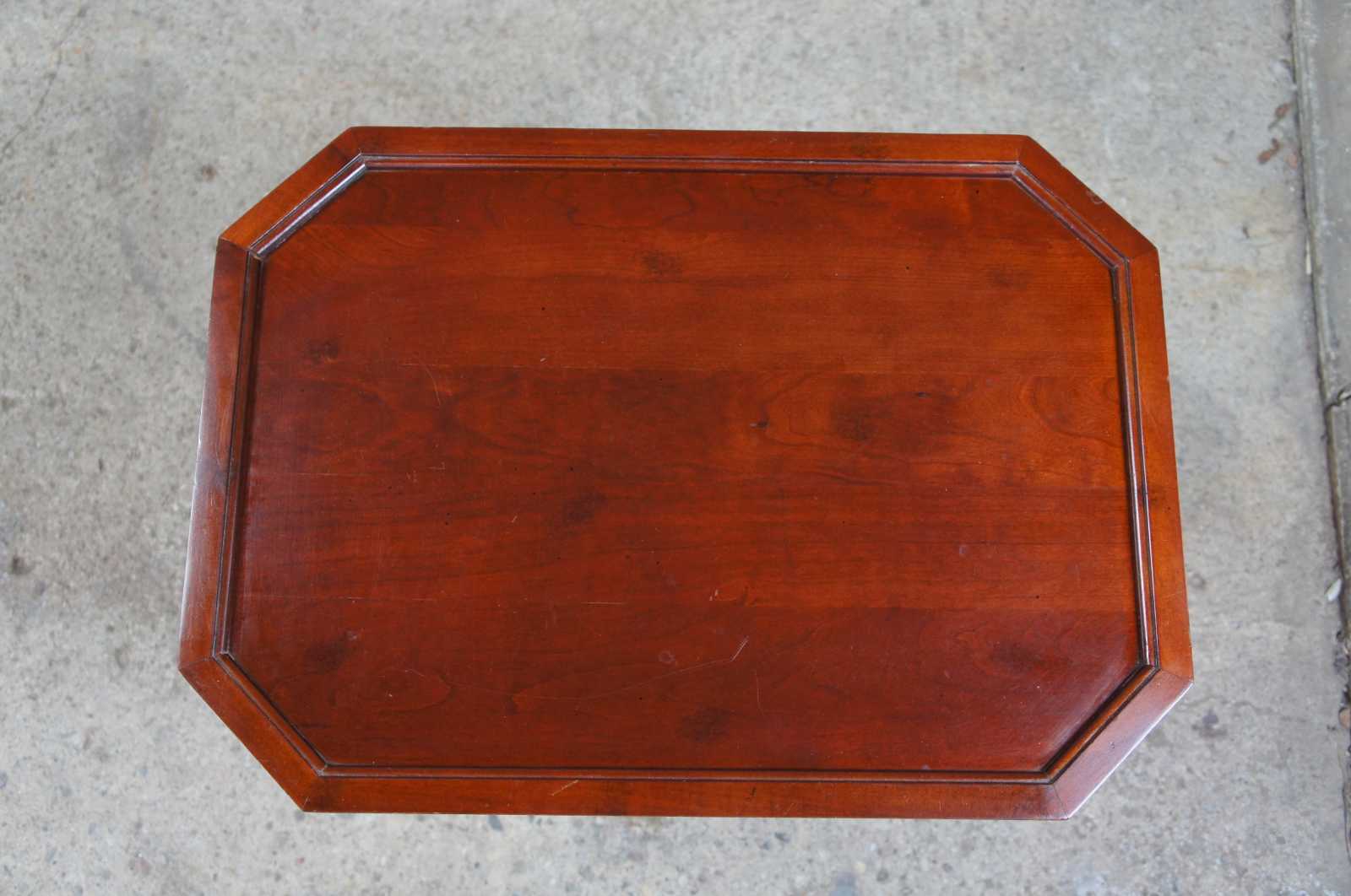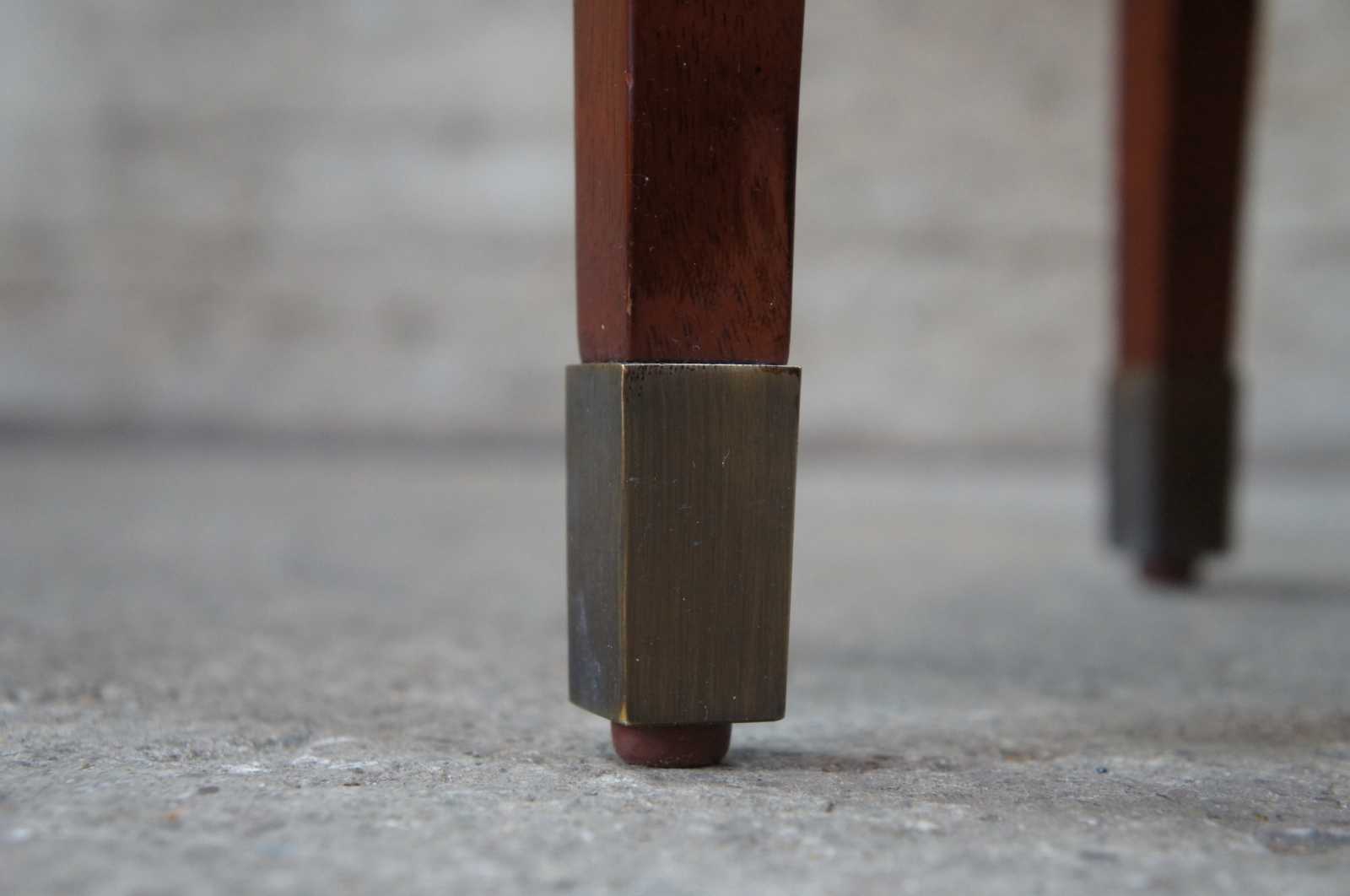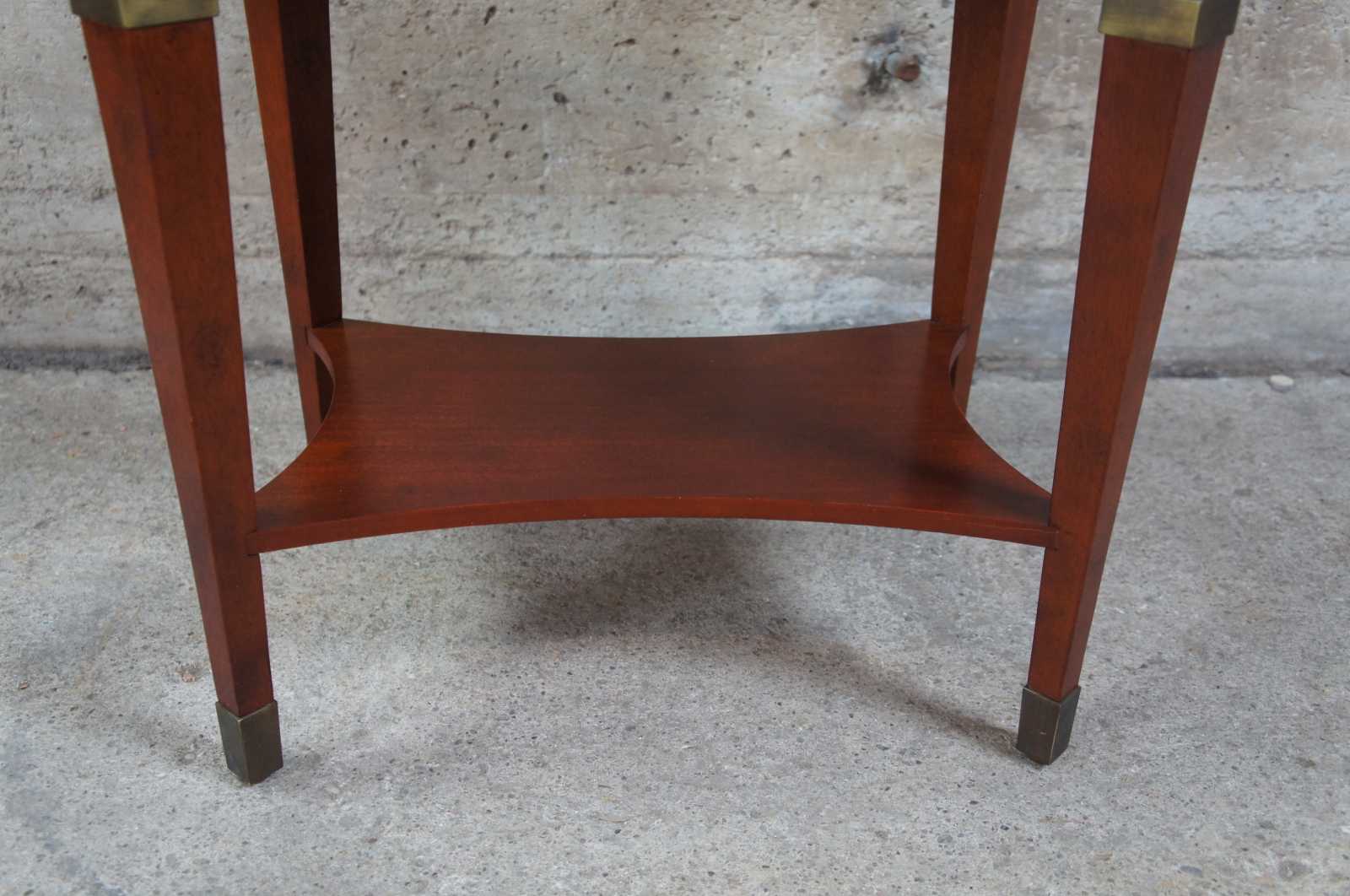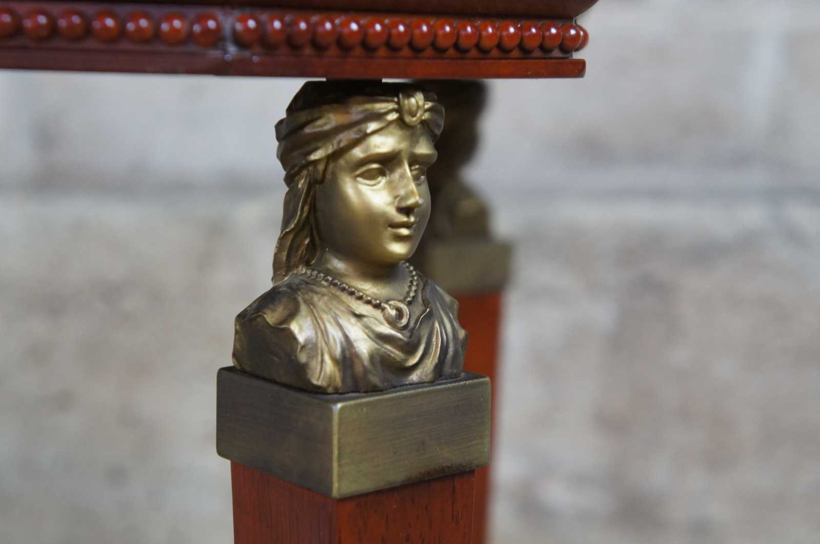 Bombay Company egyptian revival end table. Made from cherry with an octagon shape inset top and beeded trim. The table is supported by square tapered legs topped with glowing figural brass caryatid mounts. Legs terminate into brass capped feet.