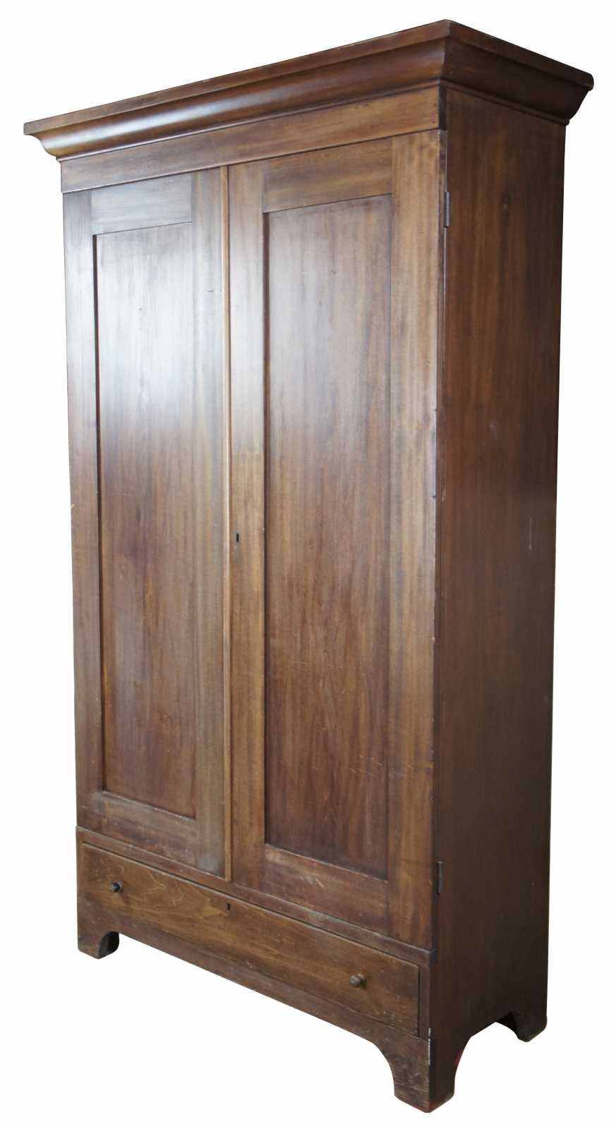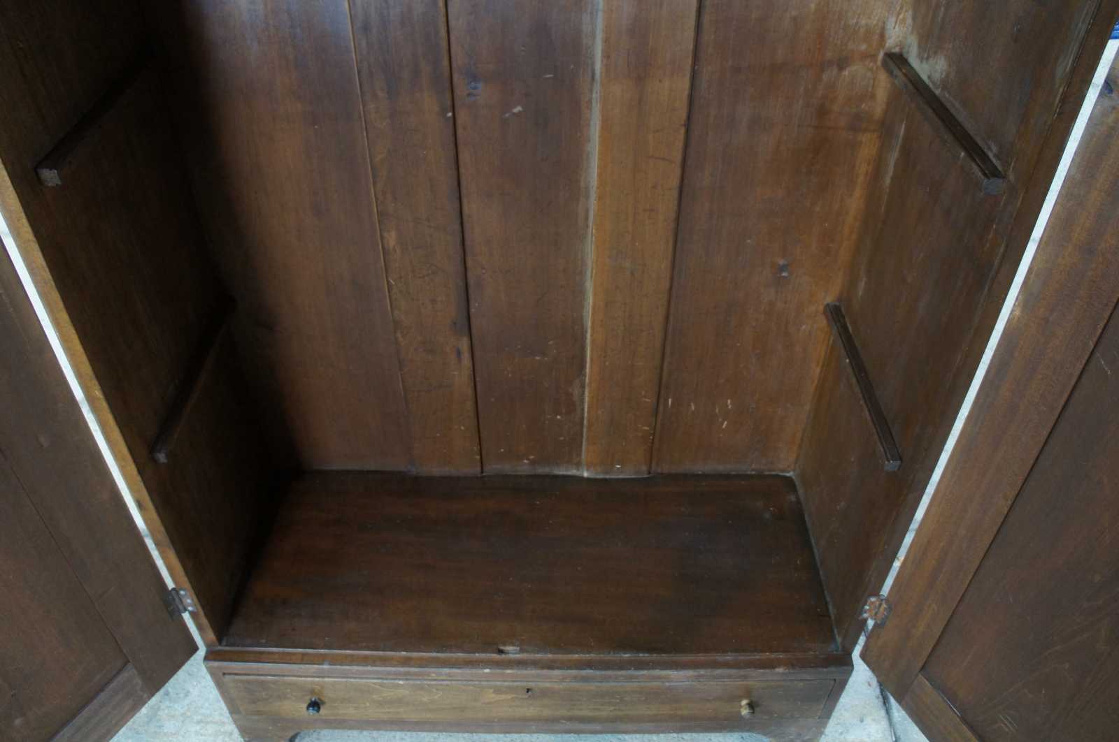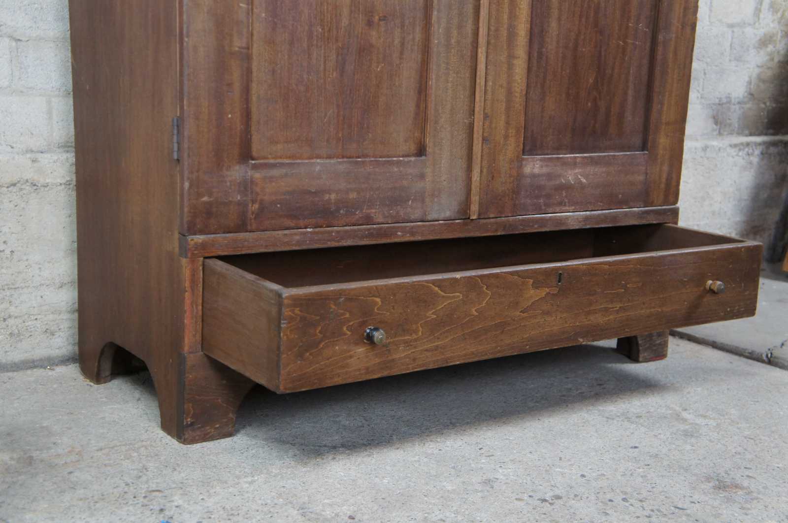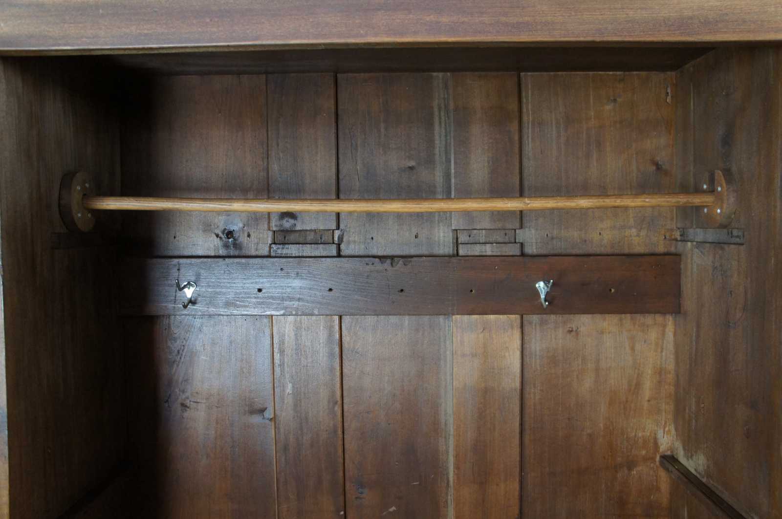 Primitive Early American farmhouse style clothing armoire. Made of walnut, featuring a hanging bar and one central lower drawer. Circa 1870s.