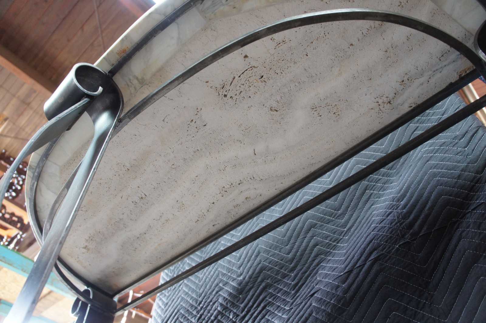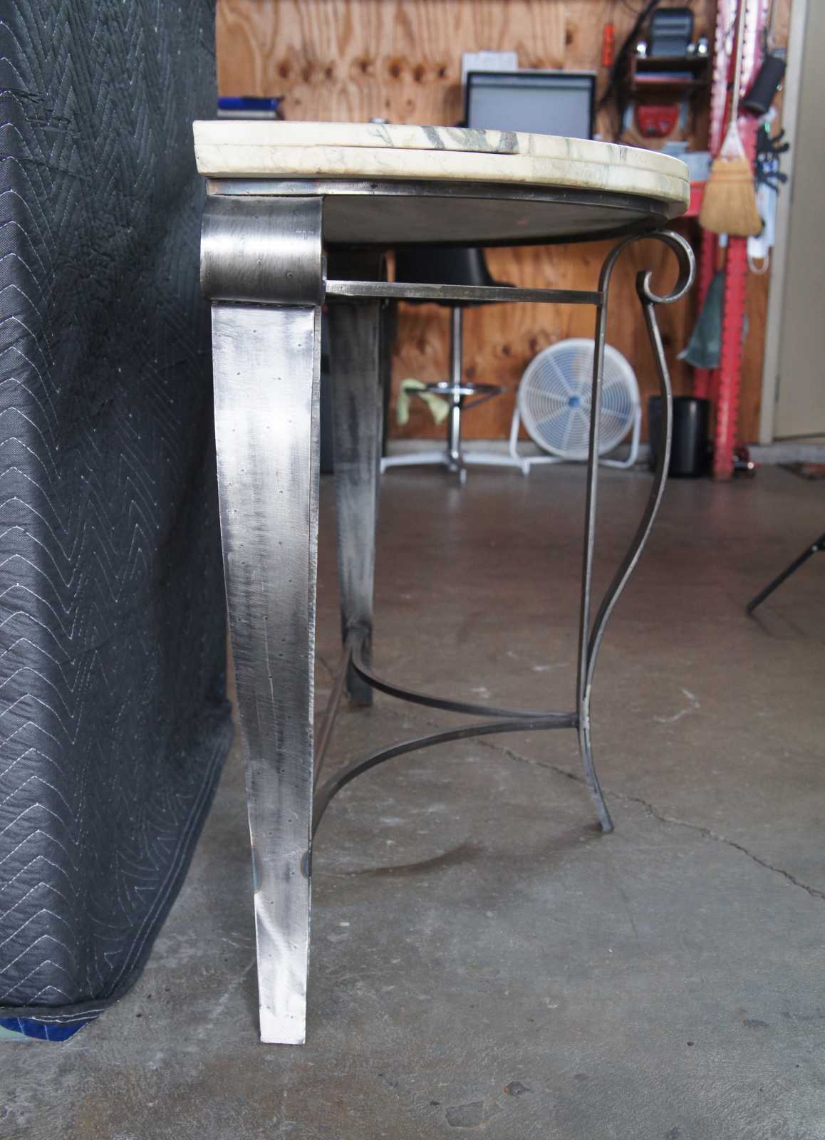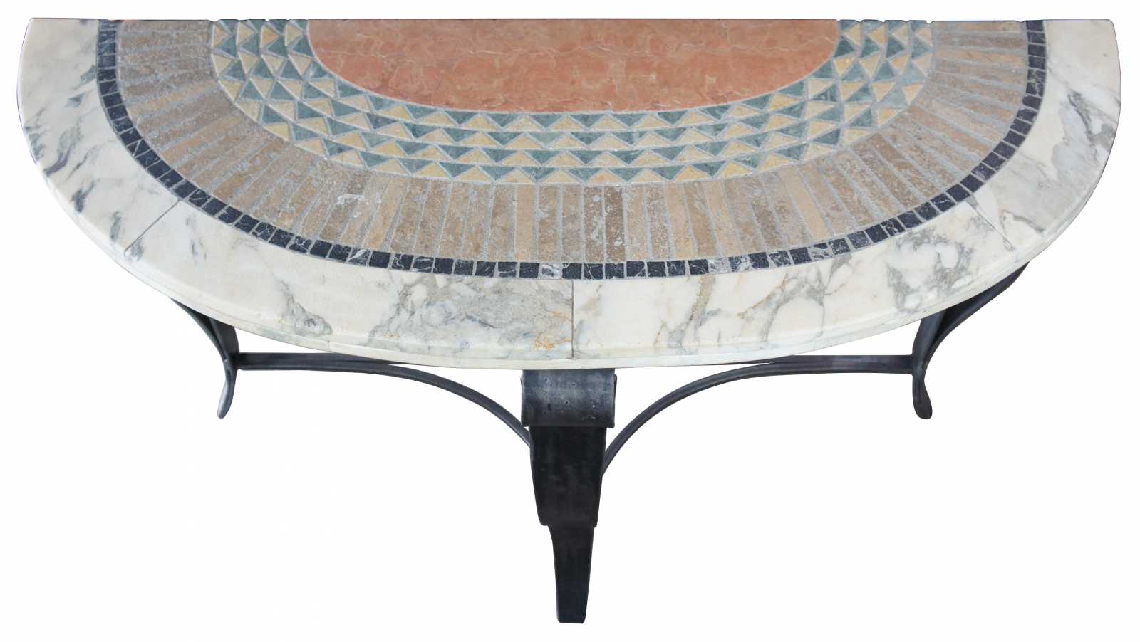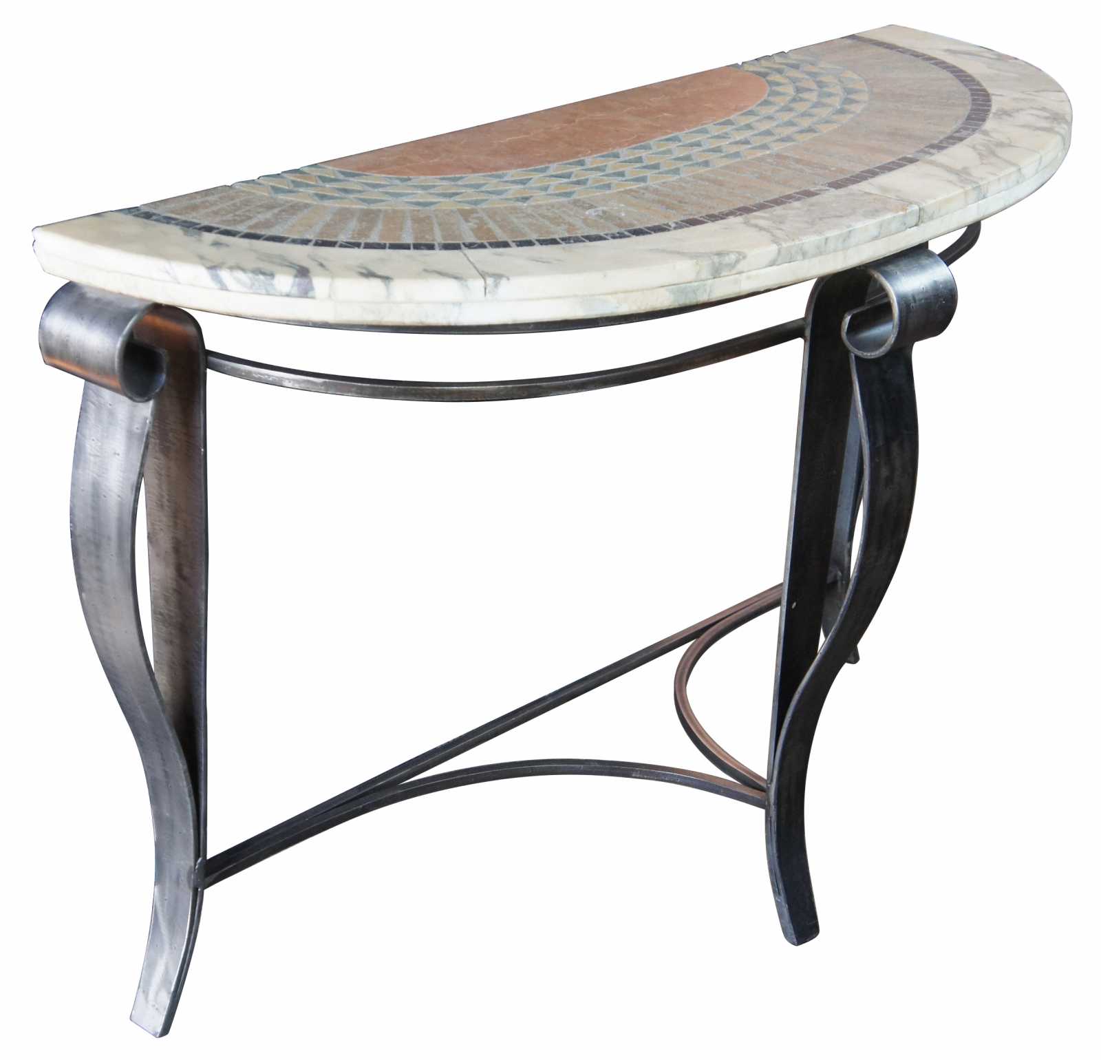 Vintage Southwestern style demilune console or entry table. Features a half round shape with geometric mosaic tiled stone top and scrolled iron base. Very heavy.