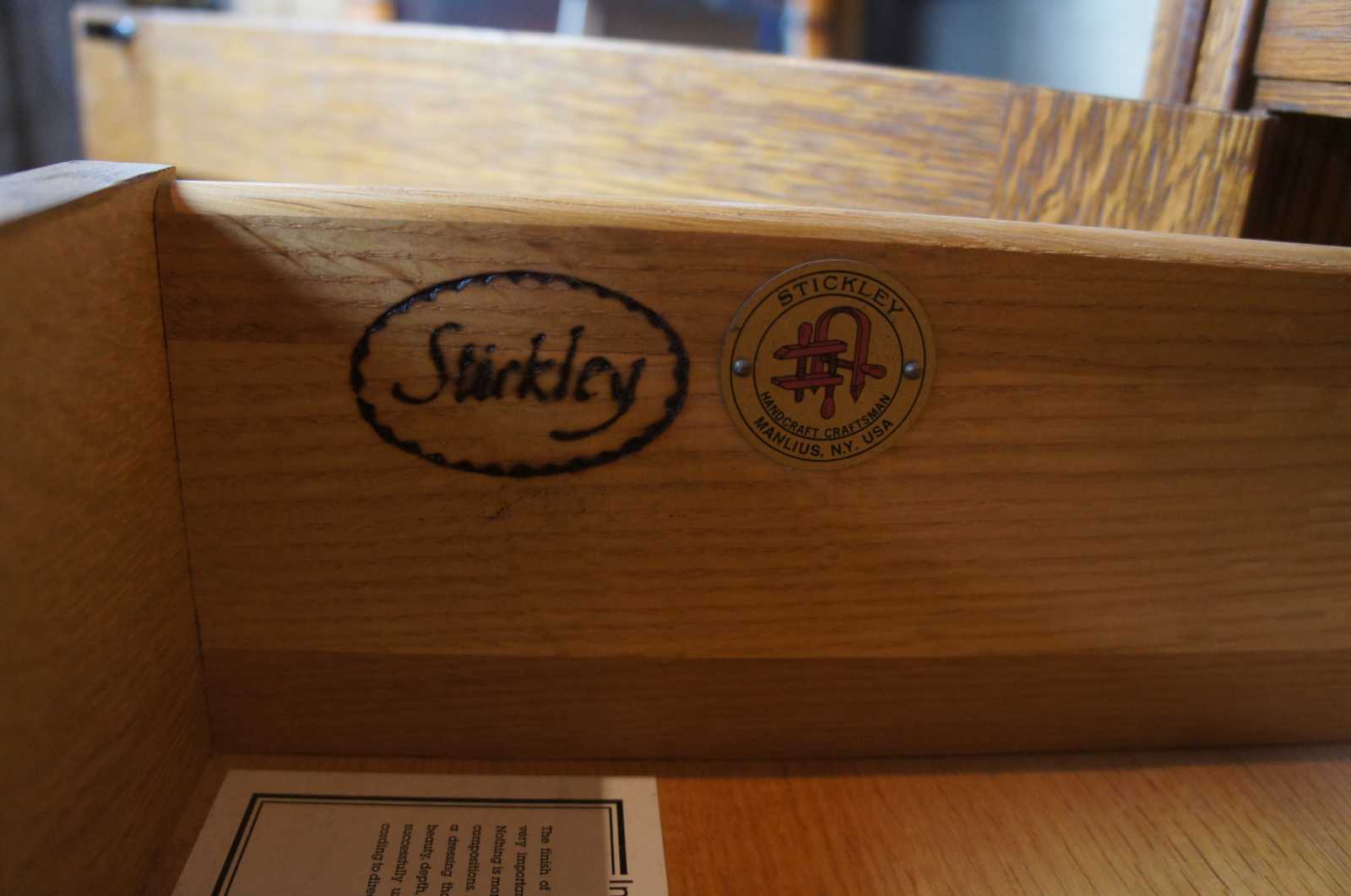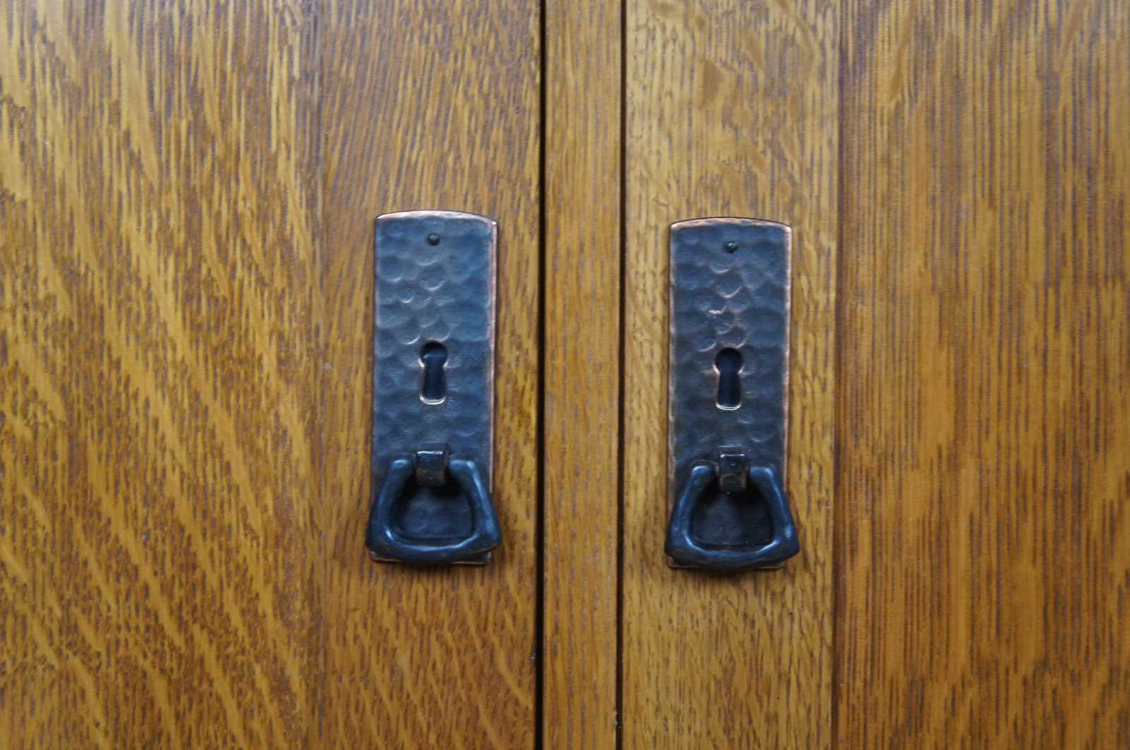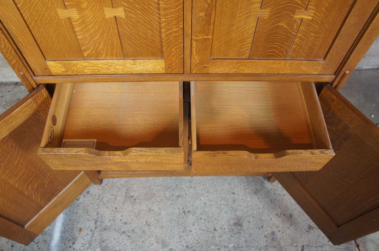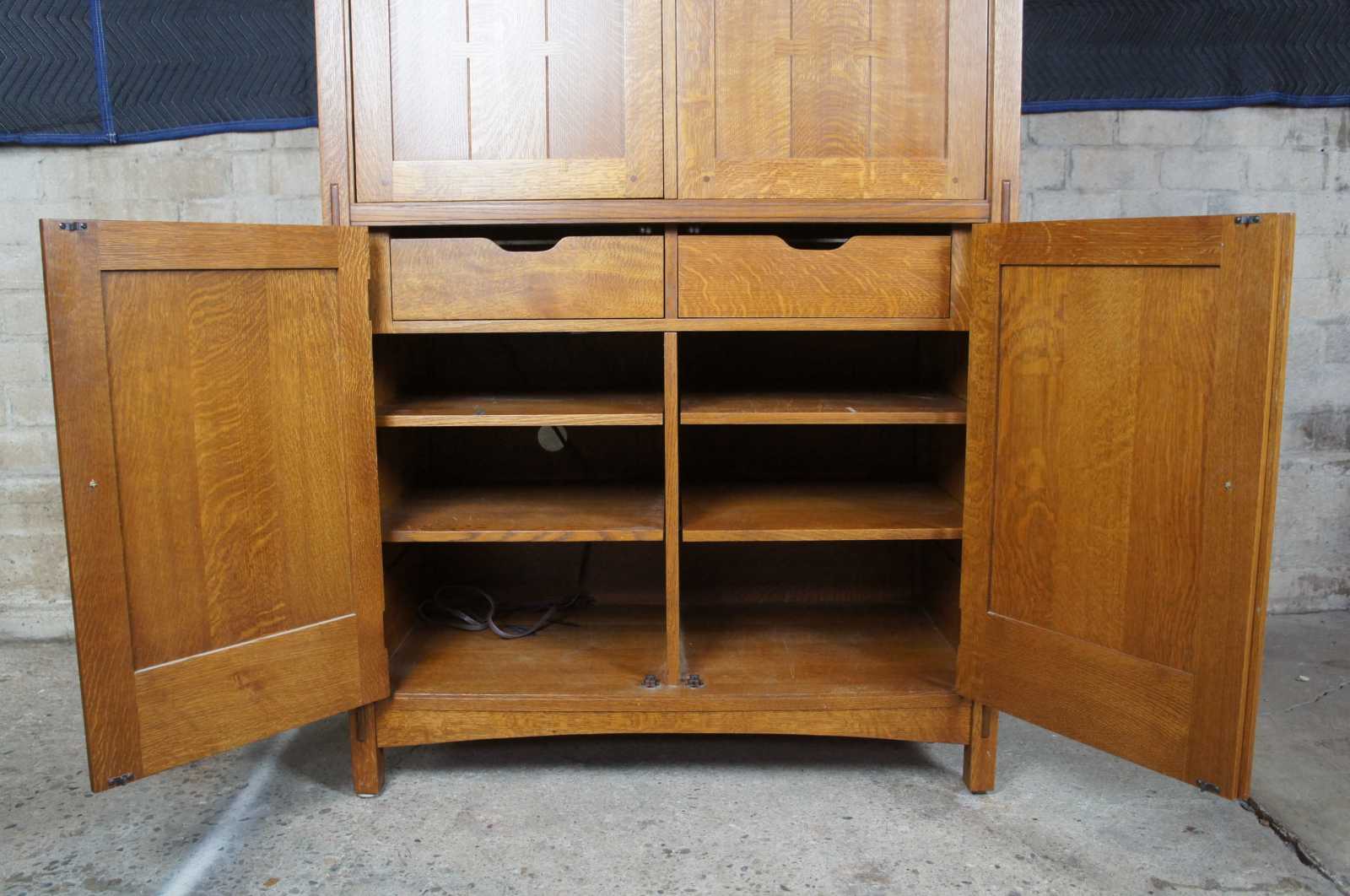 Late 20th Century Stickley media cabinet or armoire. Made from quartersawn oak in classic mission design with hammered copper hardware, bowtie inlay and 2 fitted interior drawers.