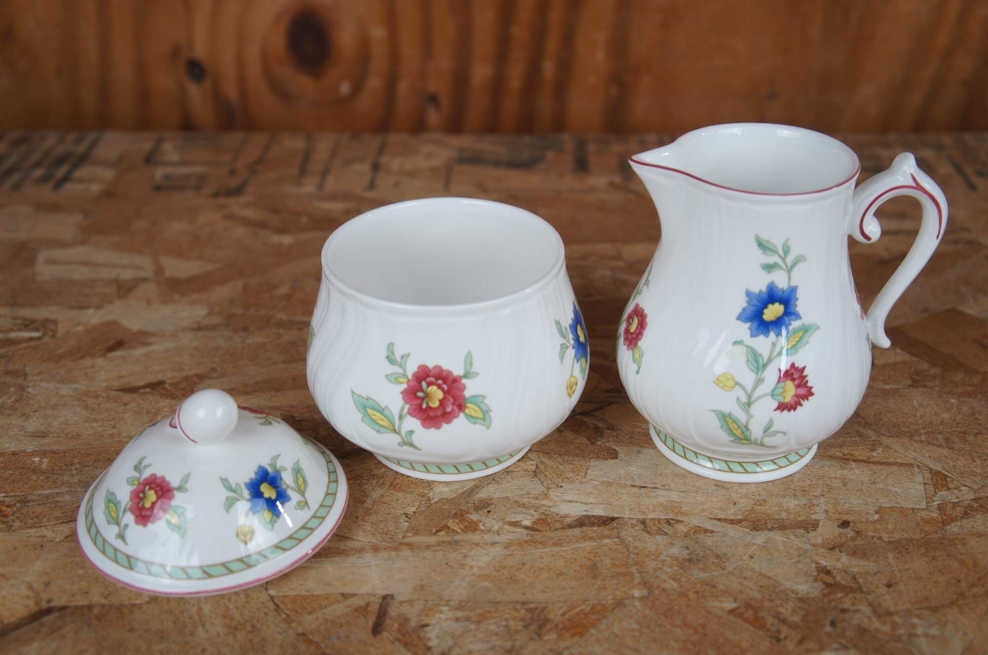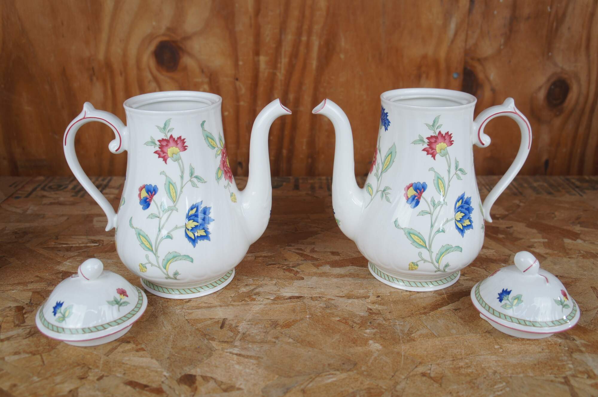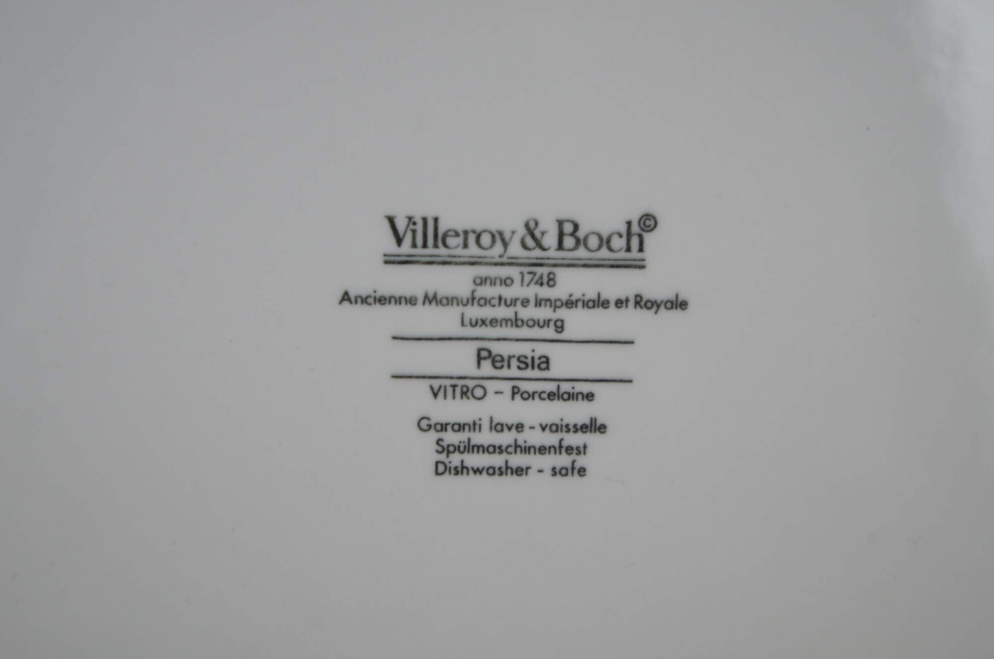 Lot of vintage Villeroy & Boch china in the “Persia” pattern featuring a floral botanical design. Includes oval platter, tureen with lid, two teapots with lids, cream and sugar with lid.