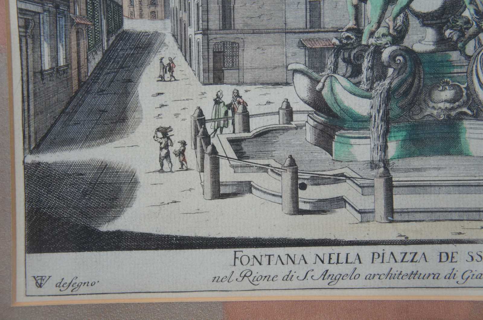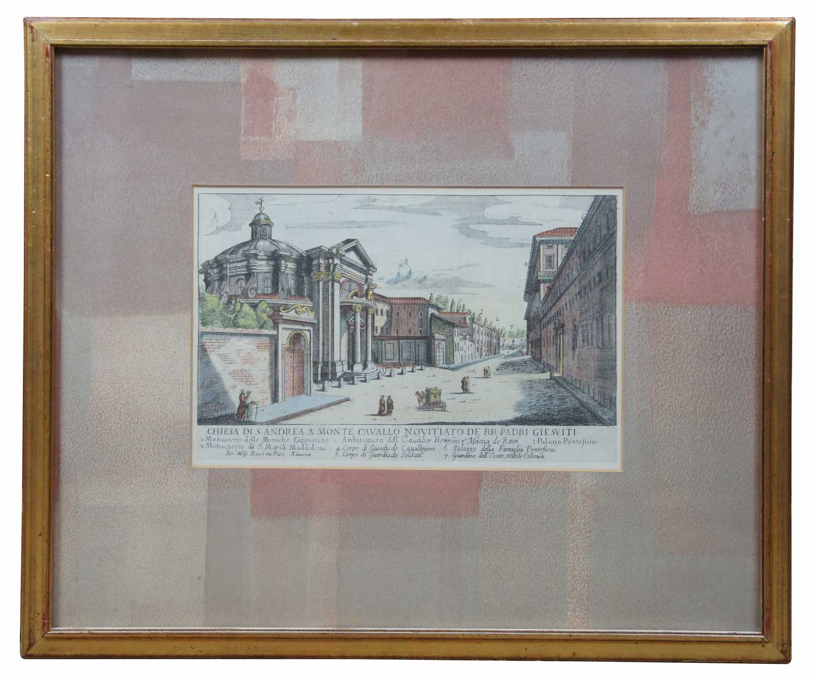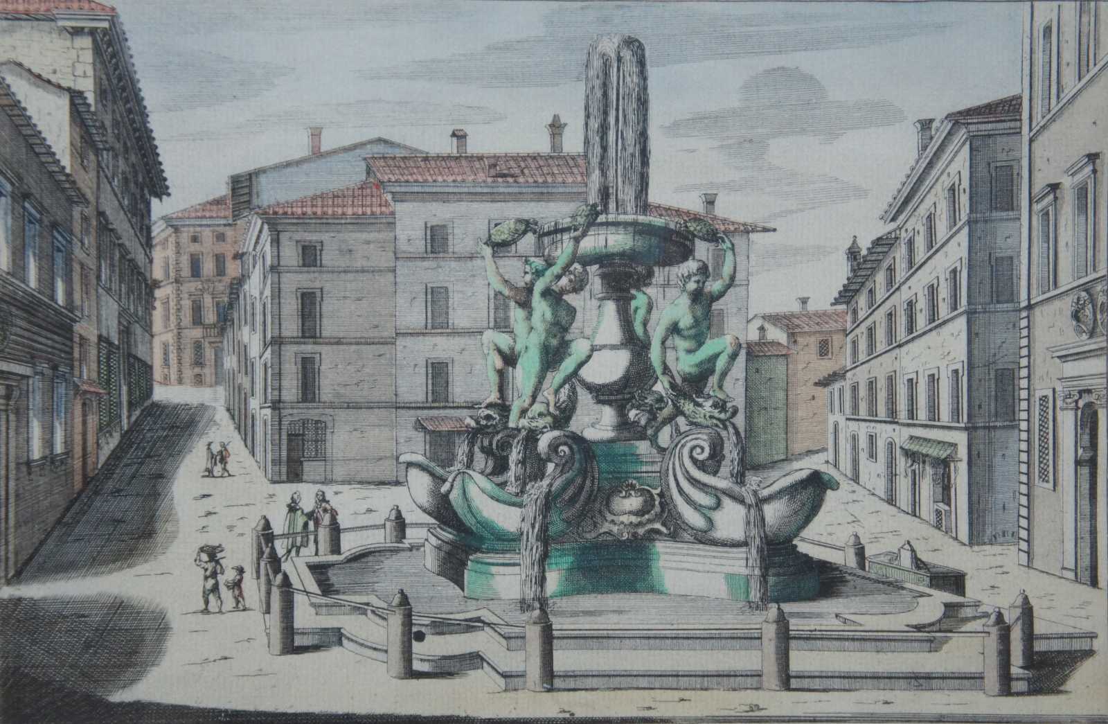 Set of two antique colored engravings featuring some of the Splendors of Rome – One city street featuring the Church of Saint Andrea and one showing The Turtle Fountain in the Piazza Mattei.