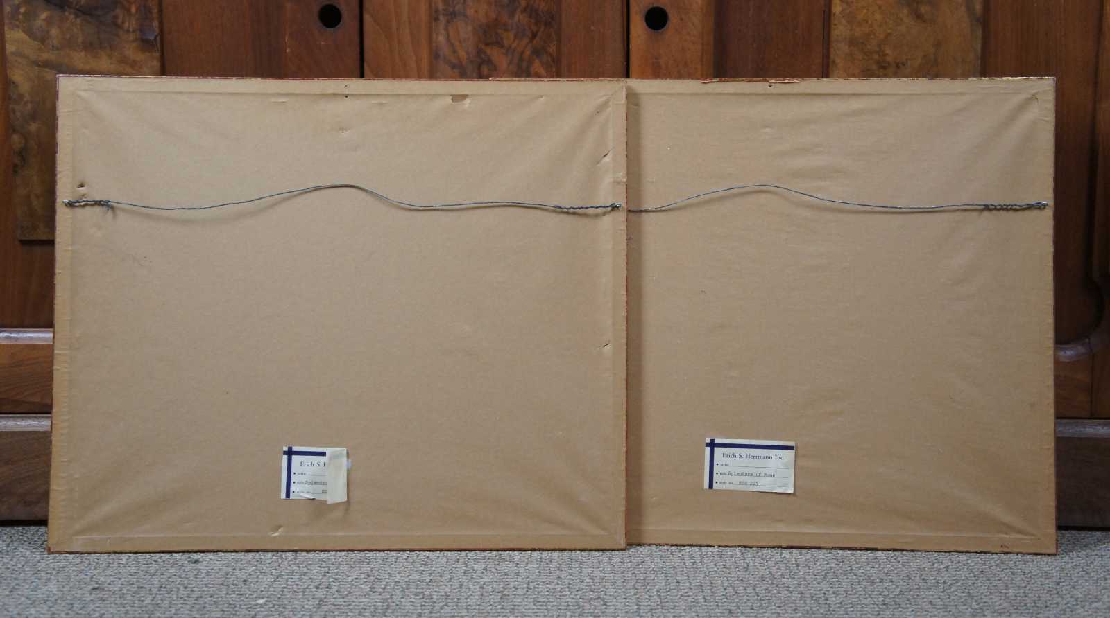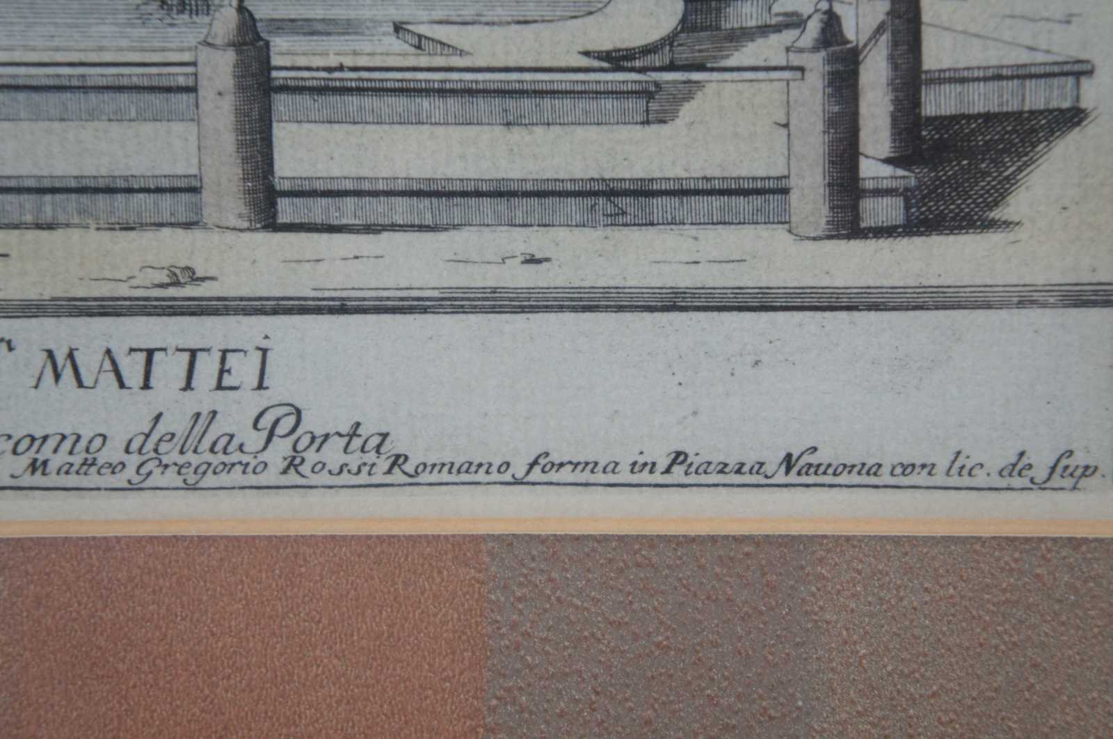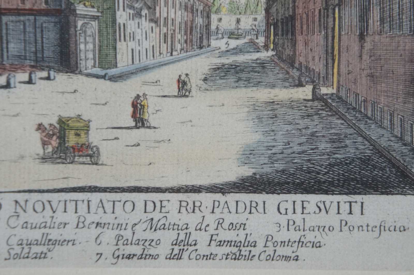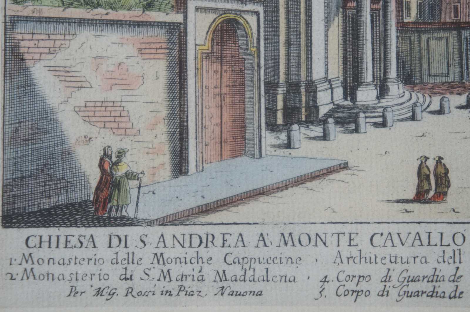 Set of two antique colored engravings featuring some of the Splendors of Rome – One city street featuring the Church of Saint Andrea and one showing The Turtle Fountain in the Piazza Mattei.