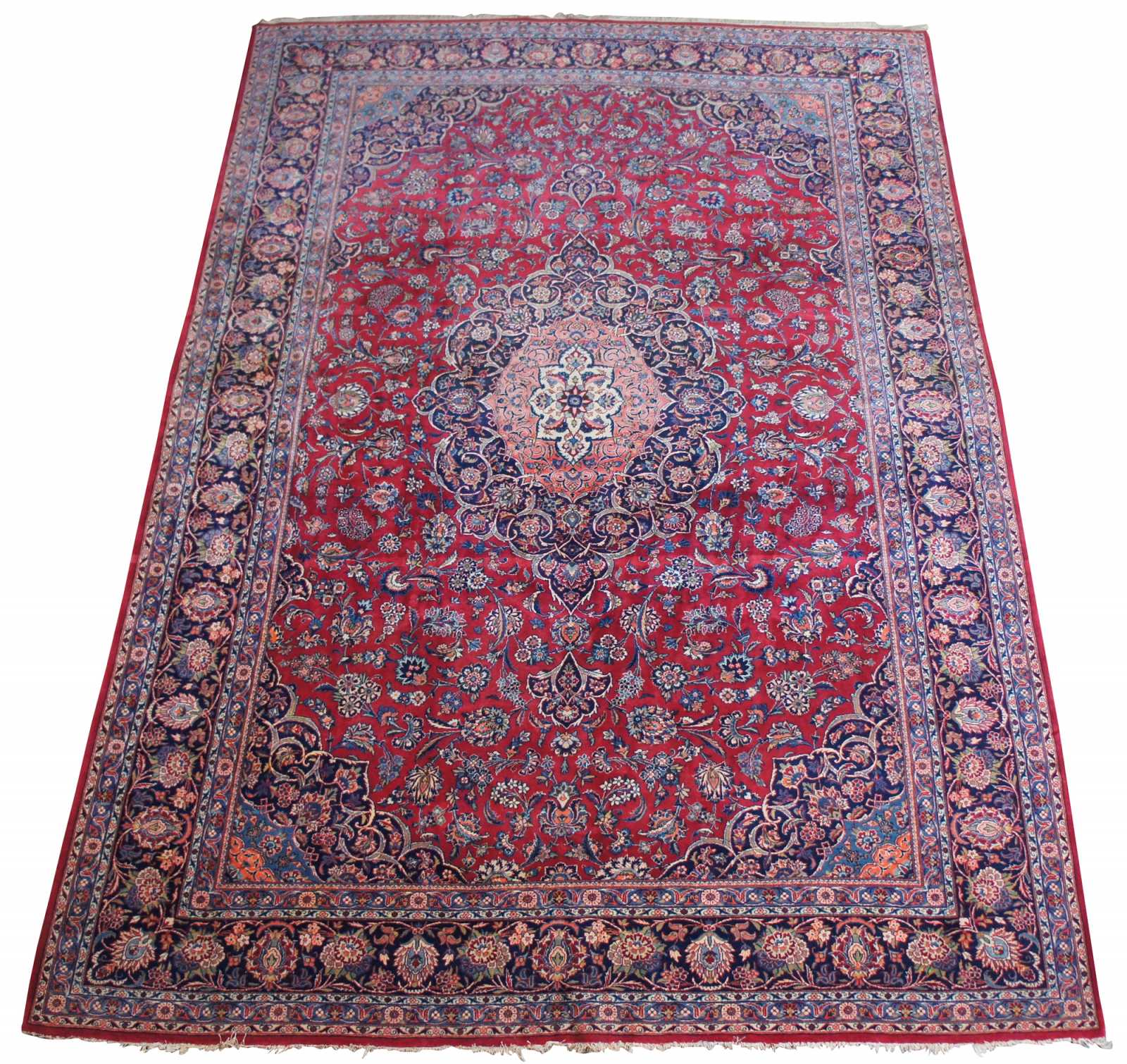 Kashan is used to describe a hand knotted rug that usually contains a diamond-shaped medallion on a Shah Abbas field. Shah Abbas fields take their name from a Mogul ruler who significantly contributed to the rise of Persian textile art in the 16th and 17th centuries. Shah Abbas fields, which are used in a variety of Persian designs, contain a series of curvilinear floral forms, creating a garden-like background. They are found either in an all-over format or with a central medallion.