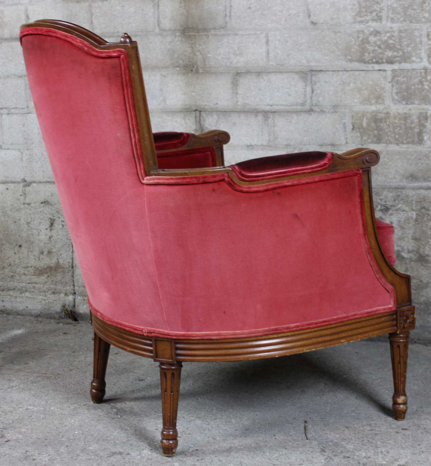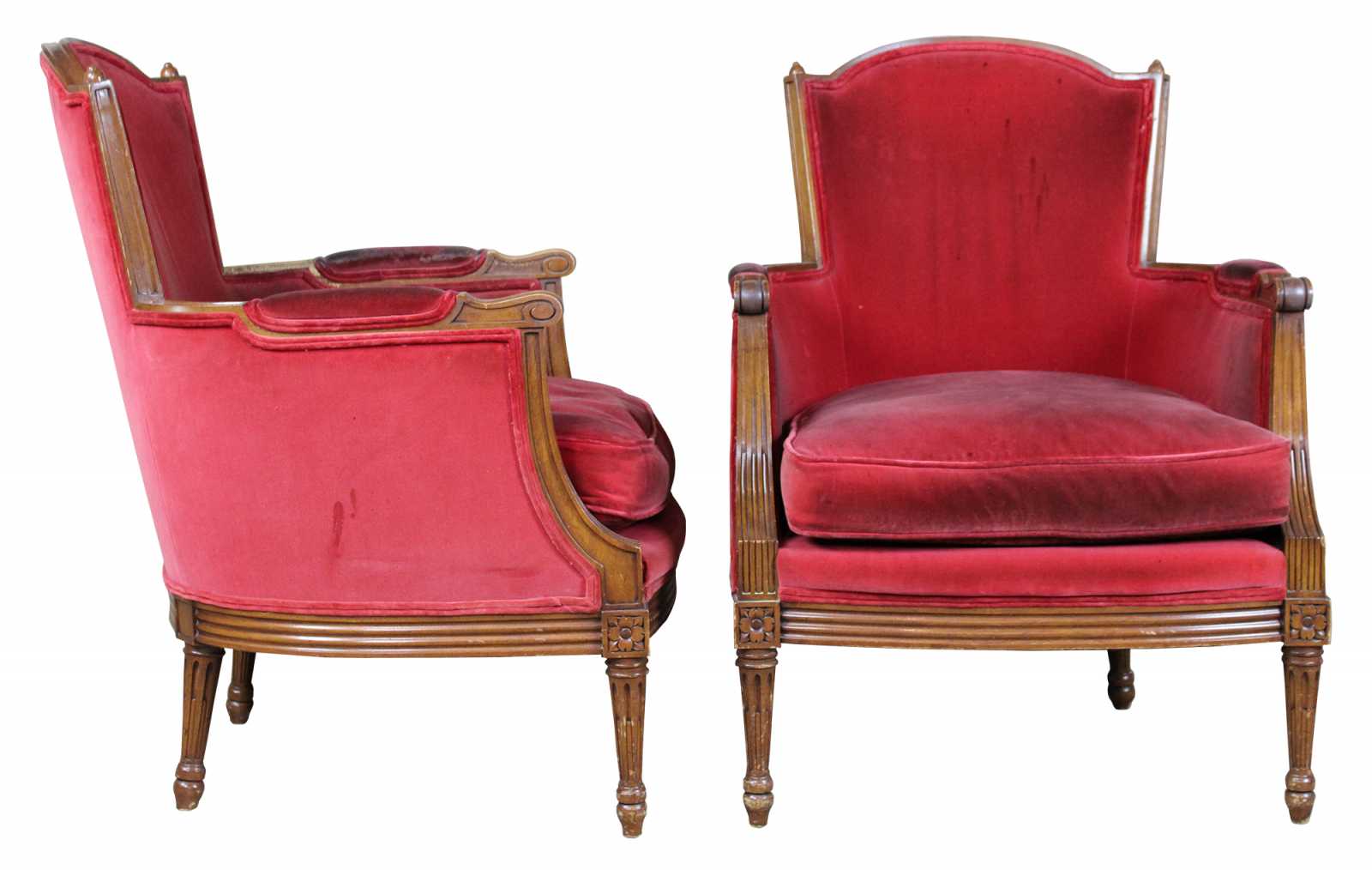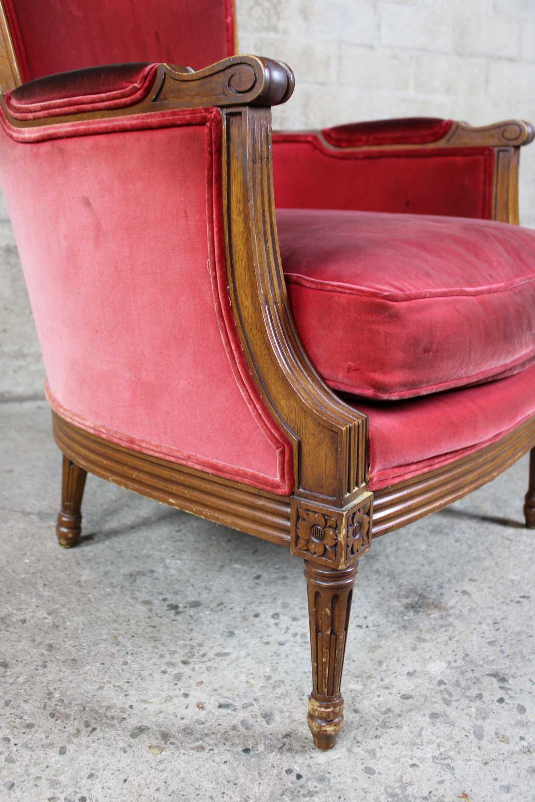 Circa 1960s French Provincial club chairs. Made from walnut with a reeded frame featuring floral medallions over tapered and fluted legs.