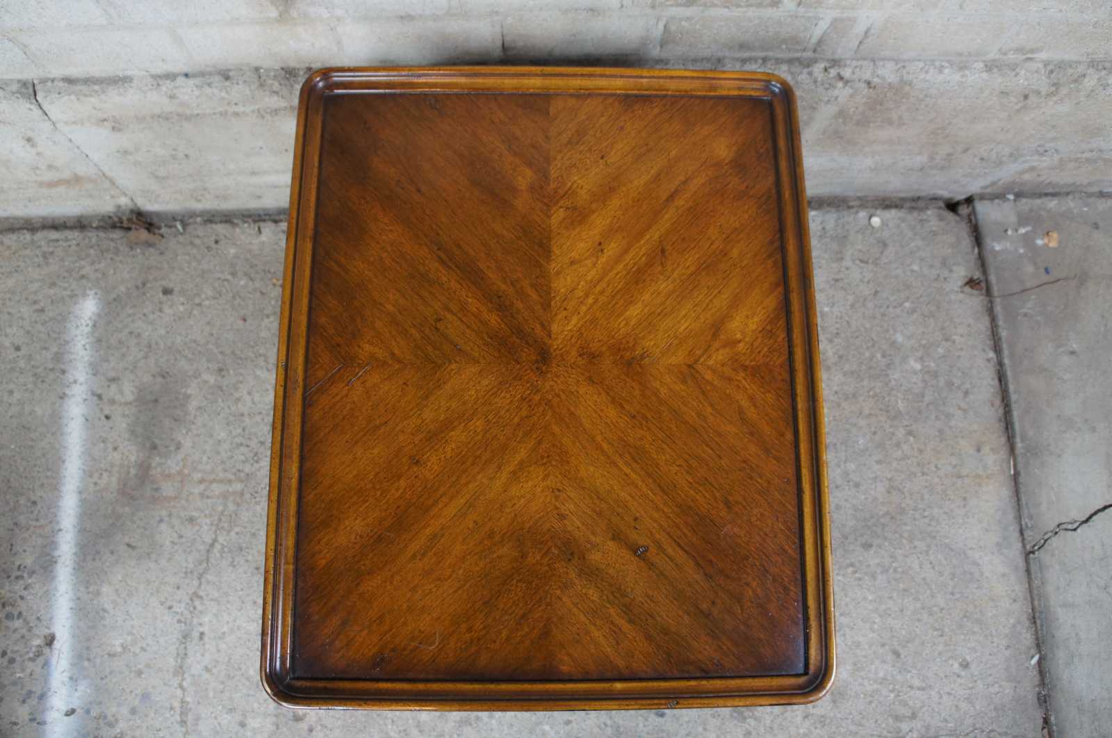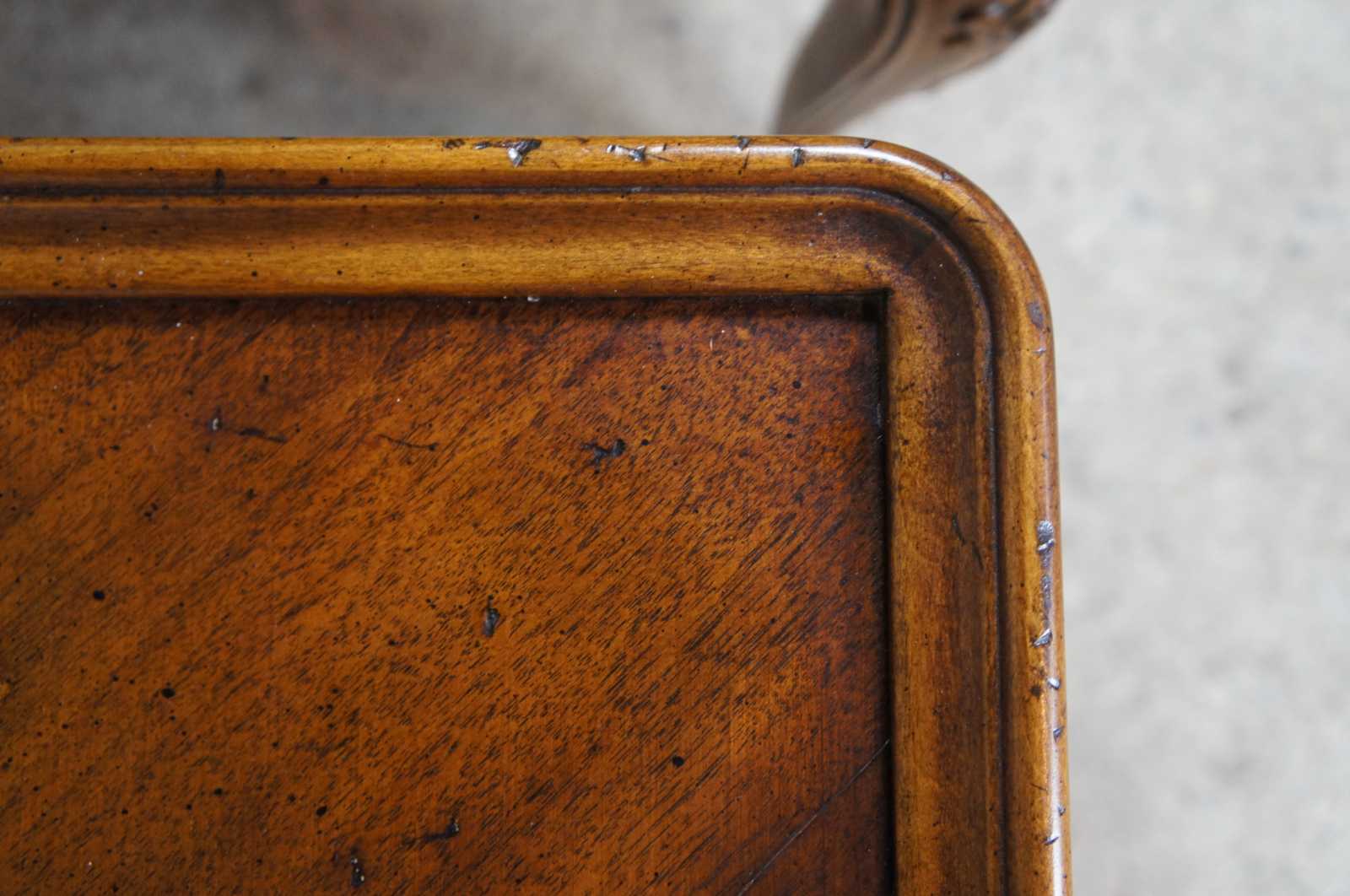 Pair of Henredon French Country side tables. Circa 1987. Made from Walnut with an inset bookmatched walnut top over a carved and scalloped arpon. The tables are supported by cabriole legs with shell and cartouche carvings. Style No 3201-41