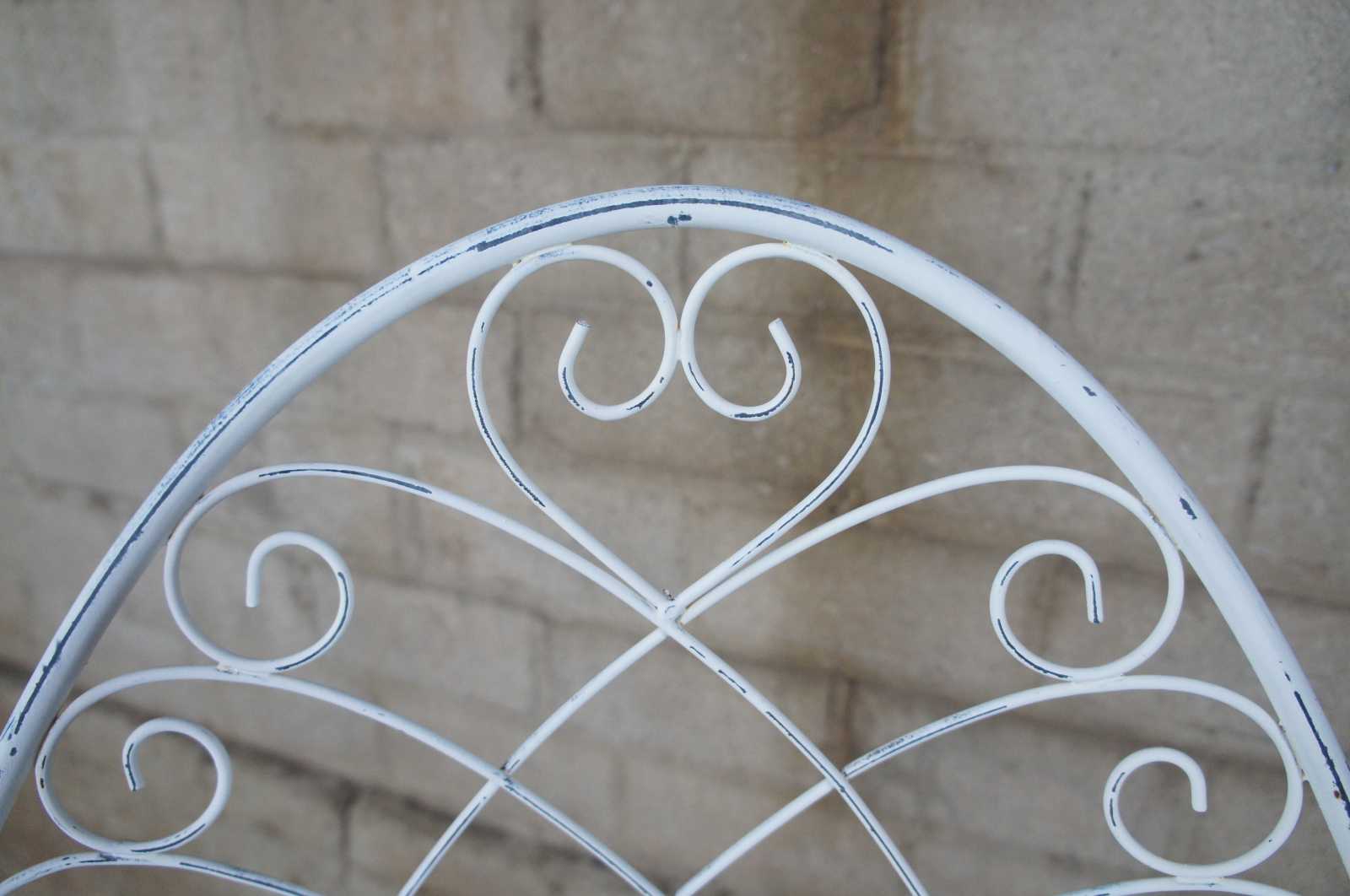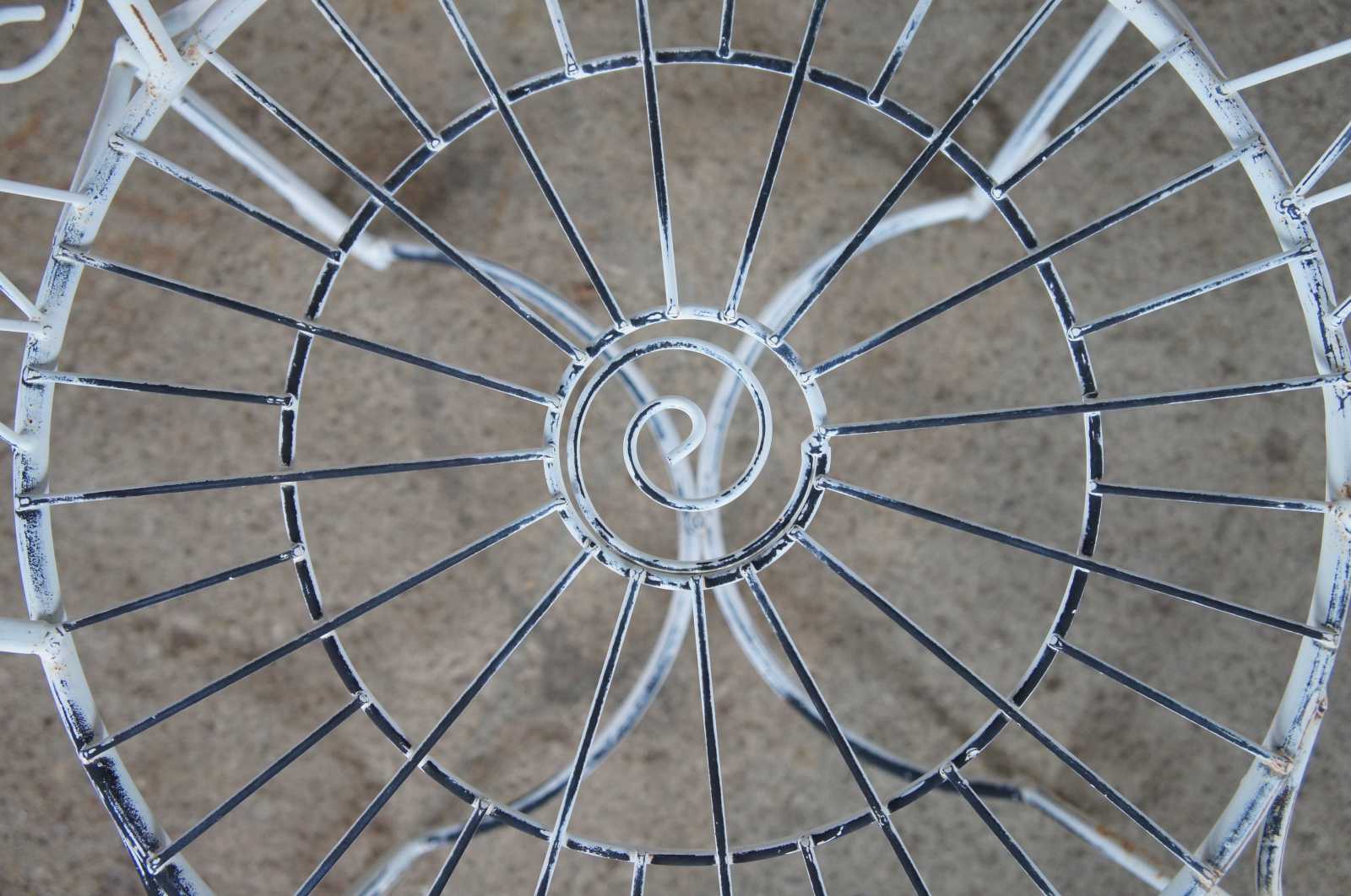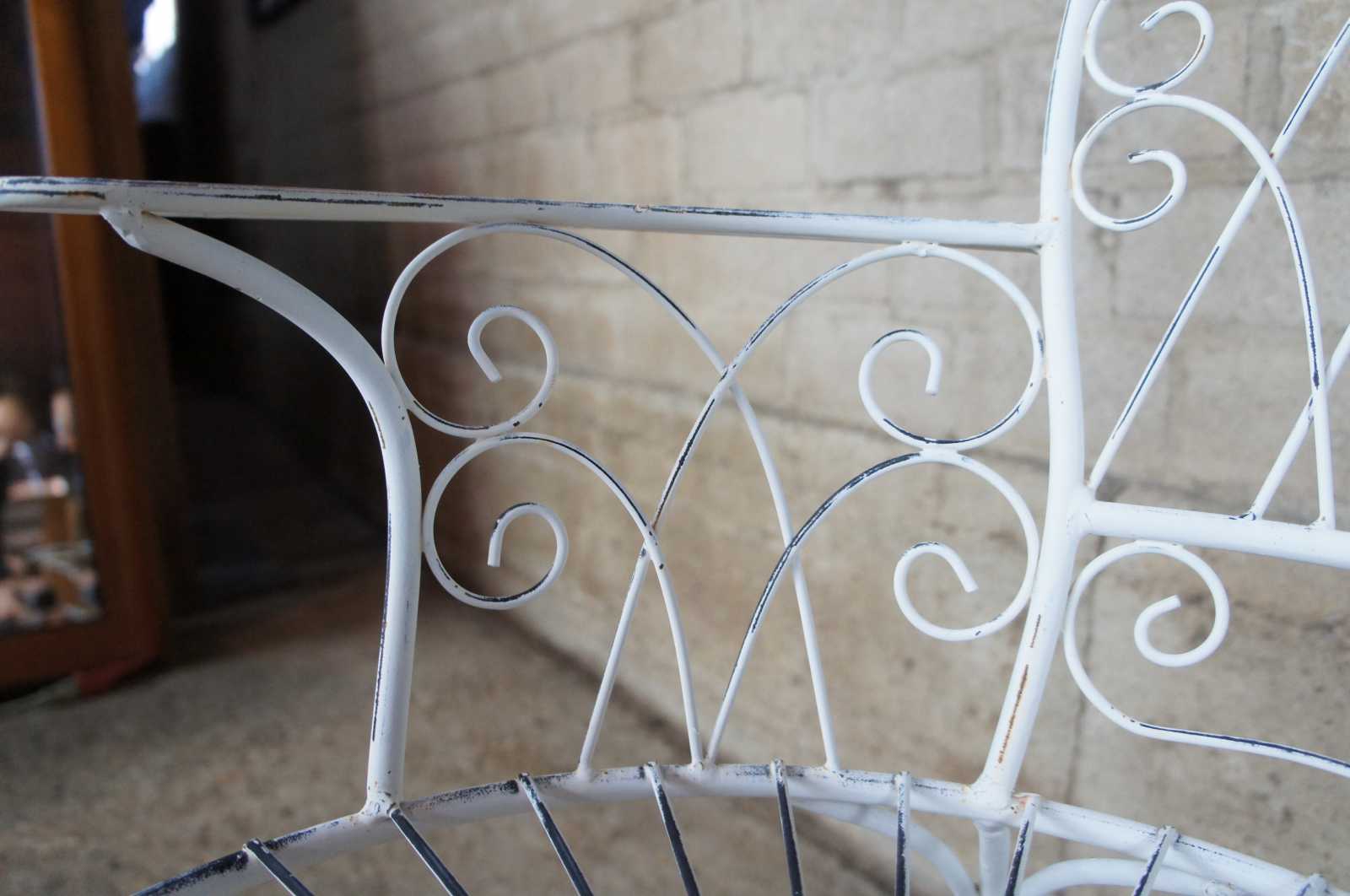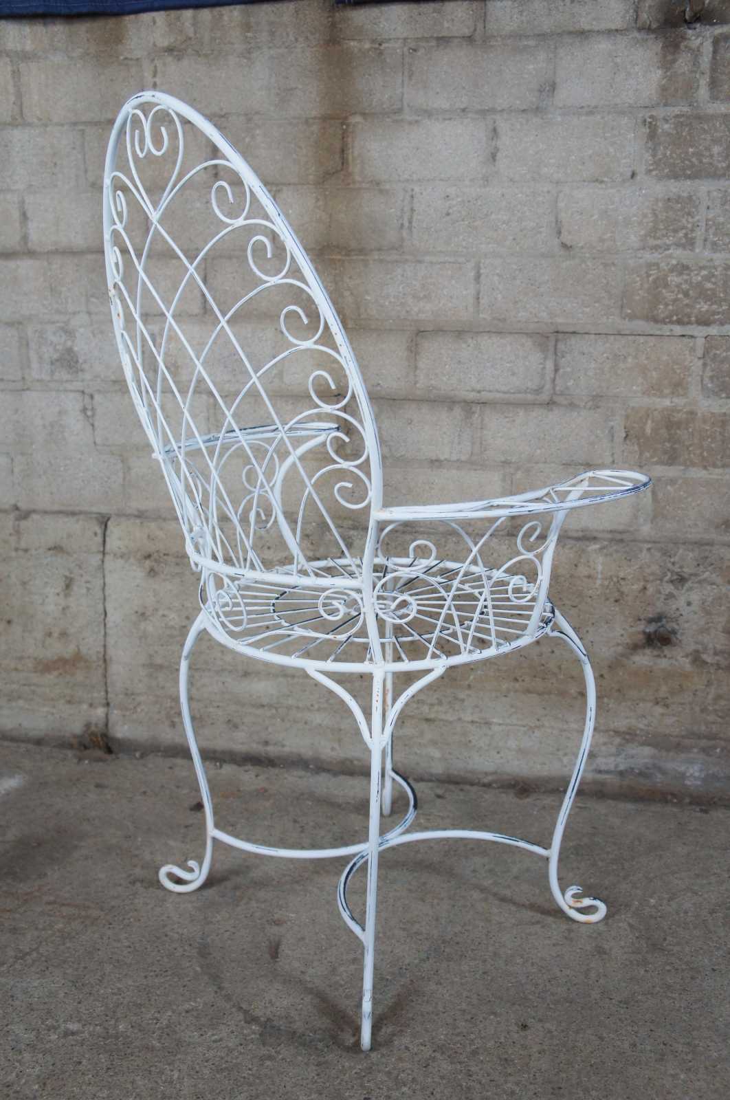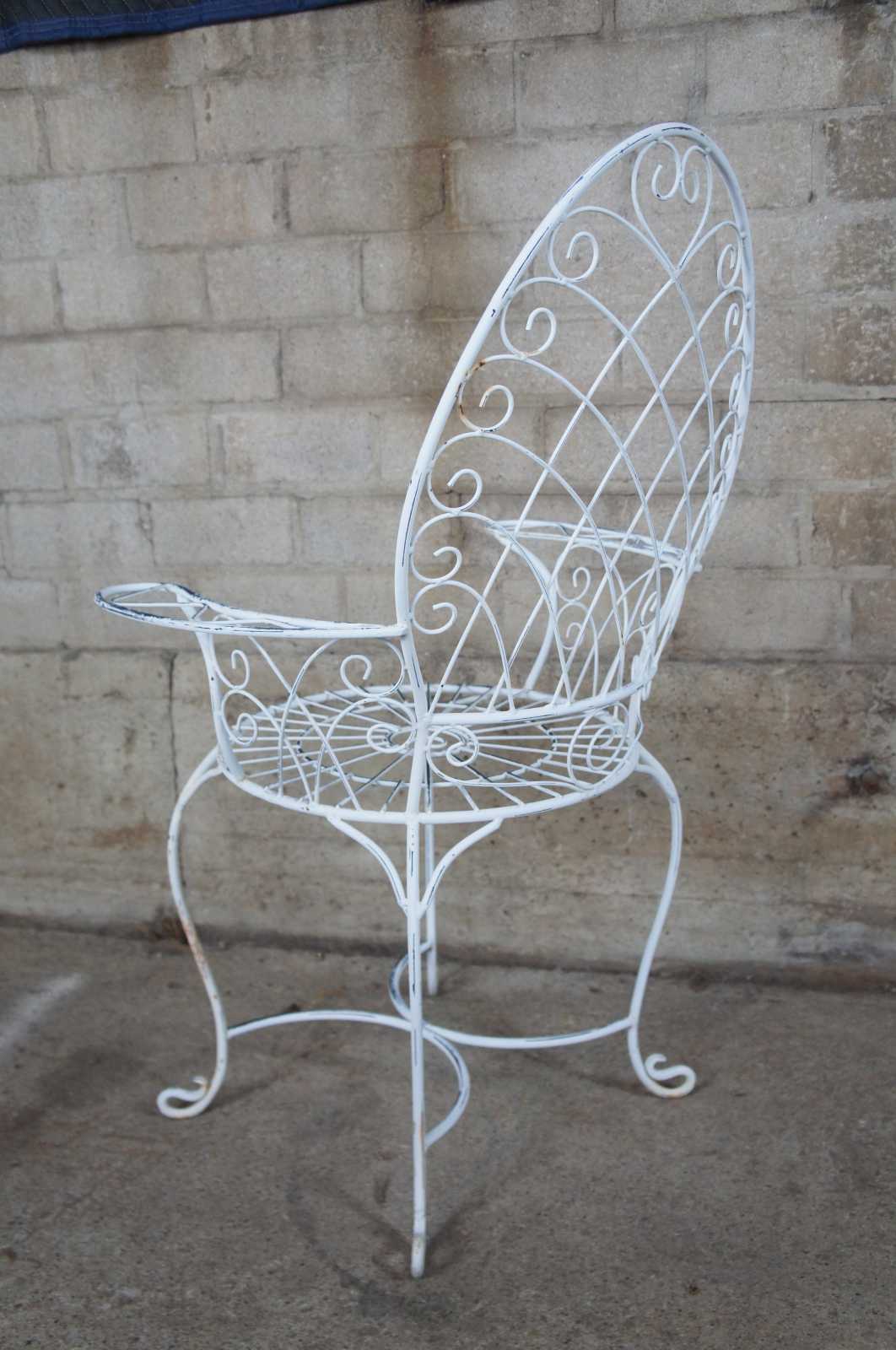 Set of four vintage wrought iron patio or parlor chairs. Features scrolled and spiral accents, arched back and nice patina.