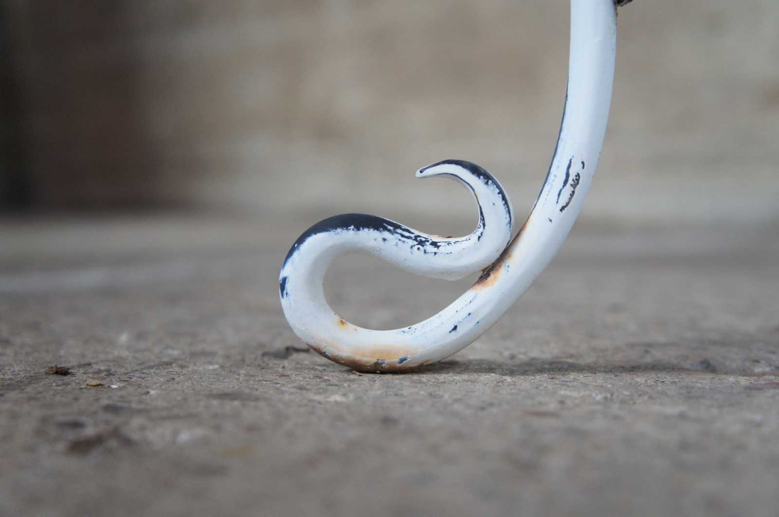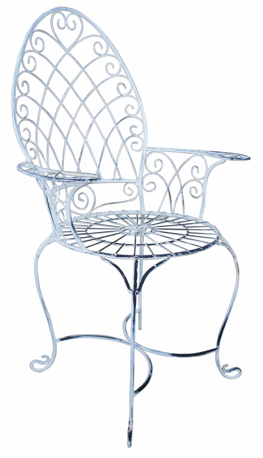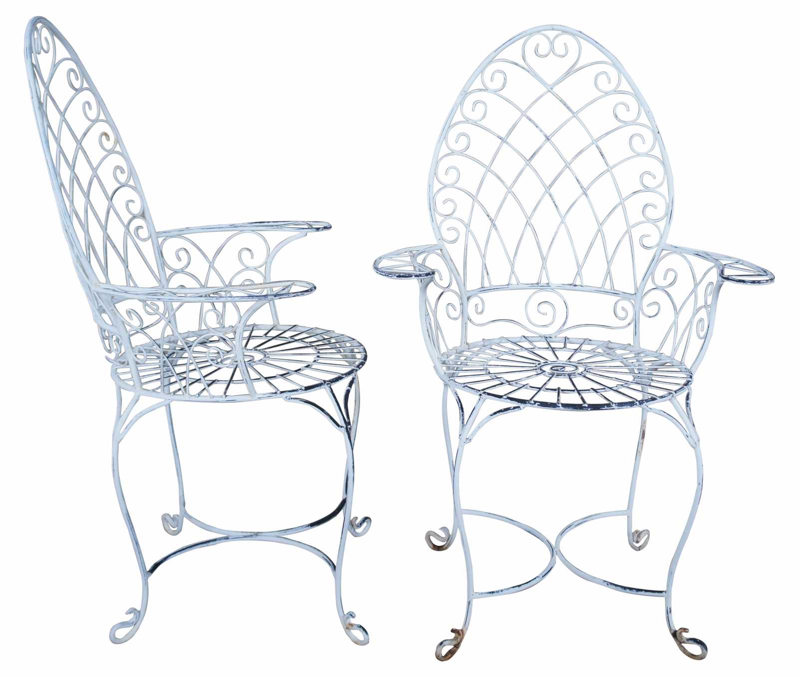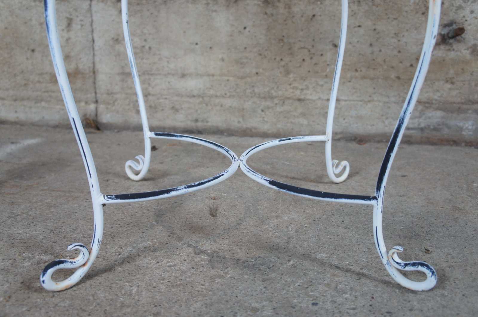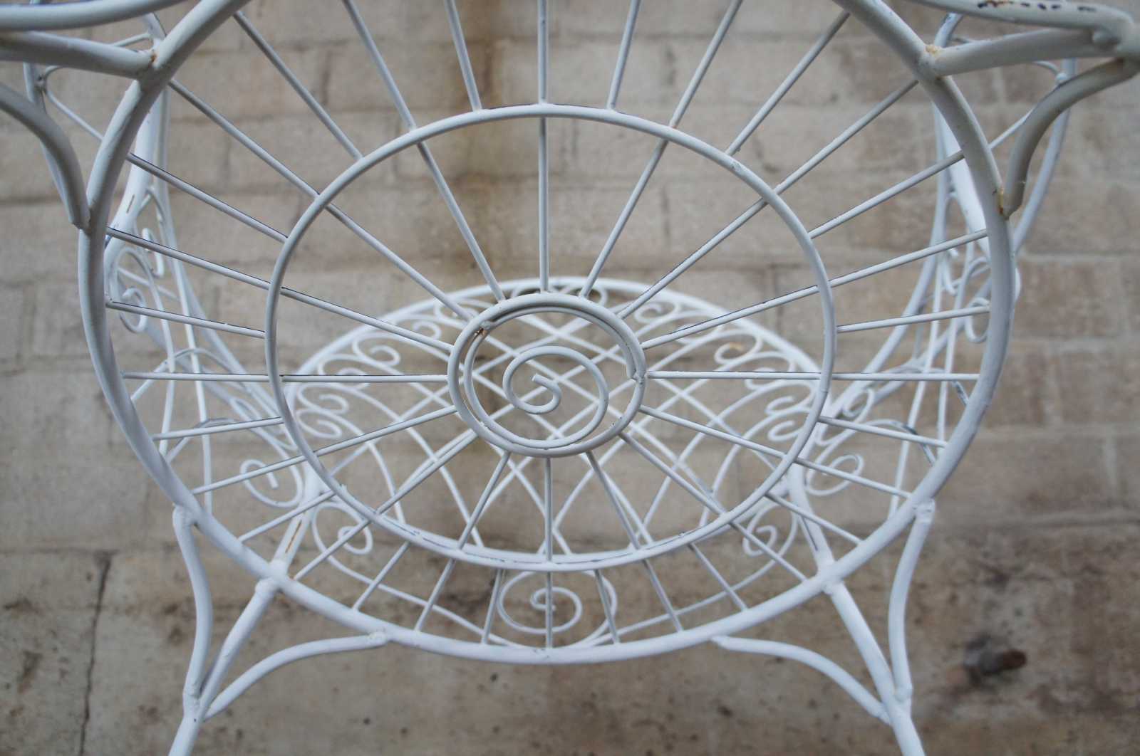 Set of four vintage wrought iron patio or parlor chairs. Features scrolled and spiral accents, arched back and nice patina.