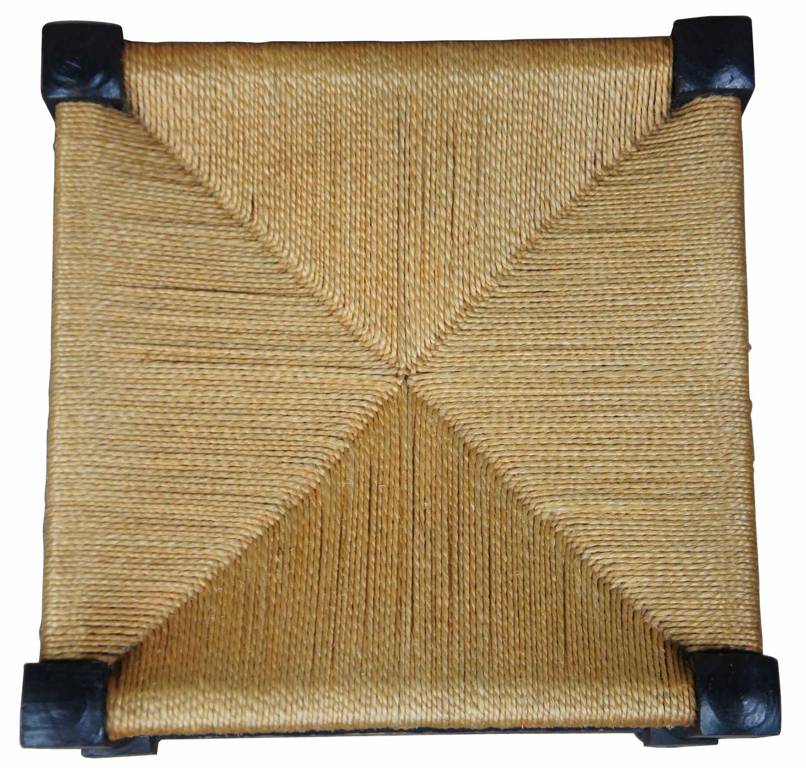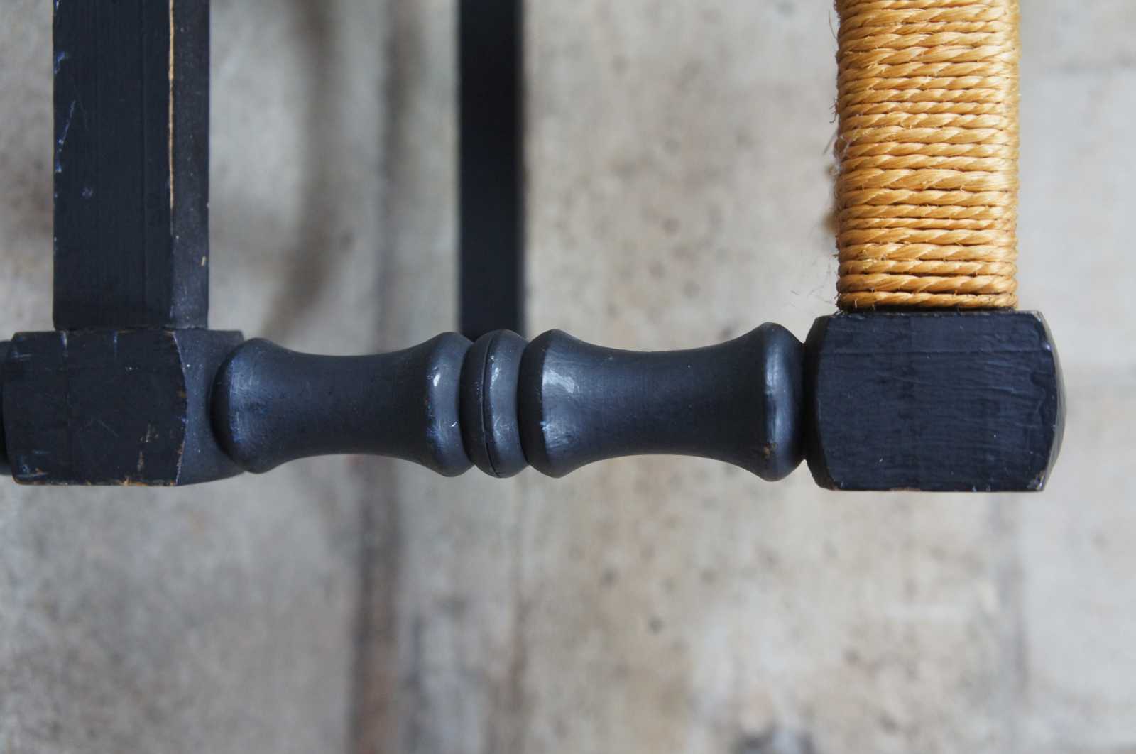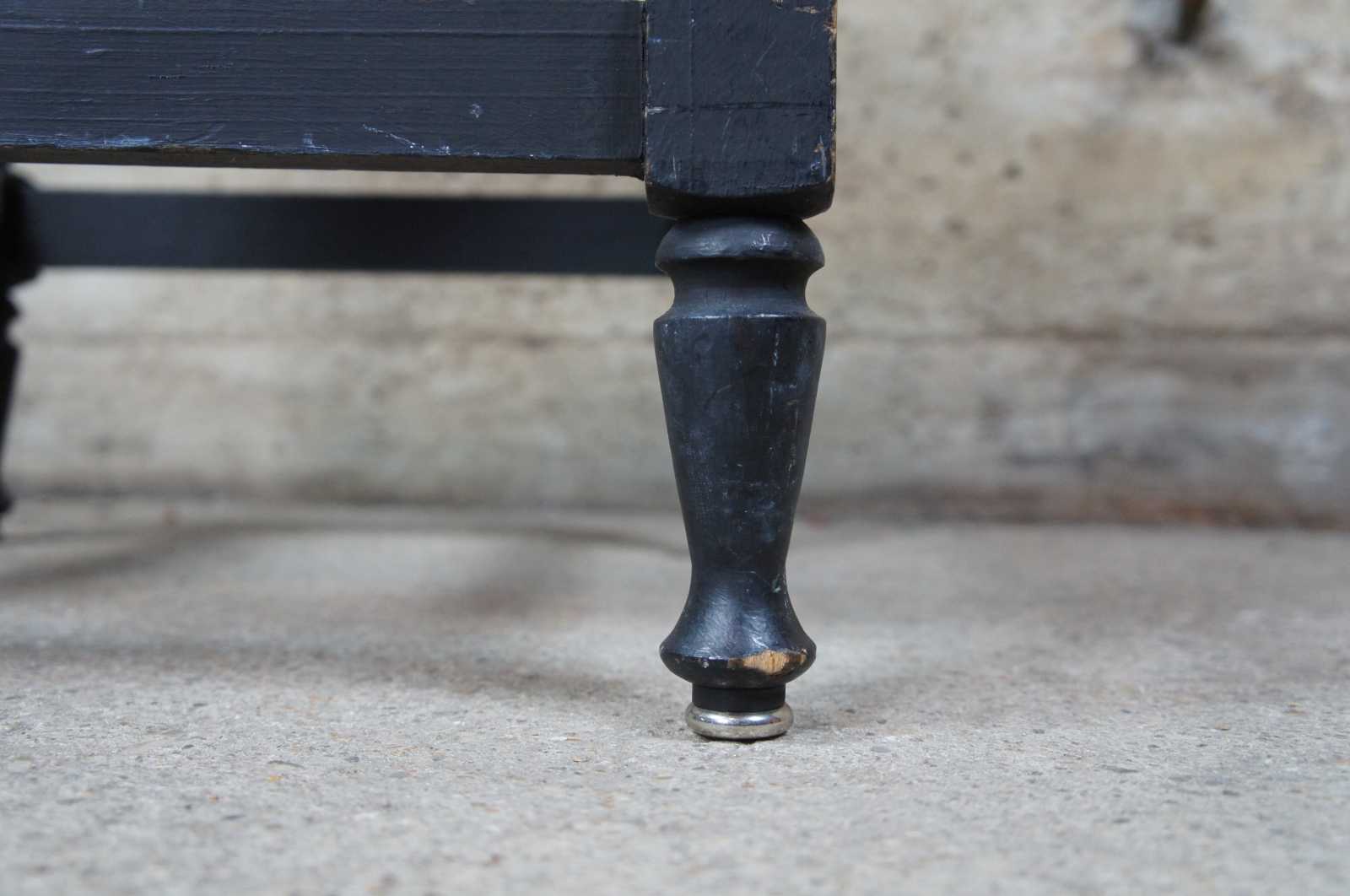 Vintage Shaker style stool or foot rest. Features woven seat, black painted finish with turned baluster supports and metal capped feet.