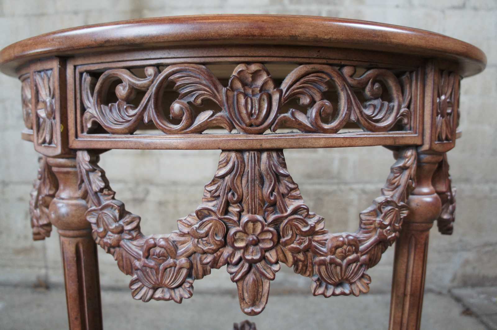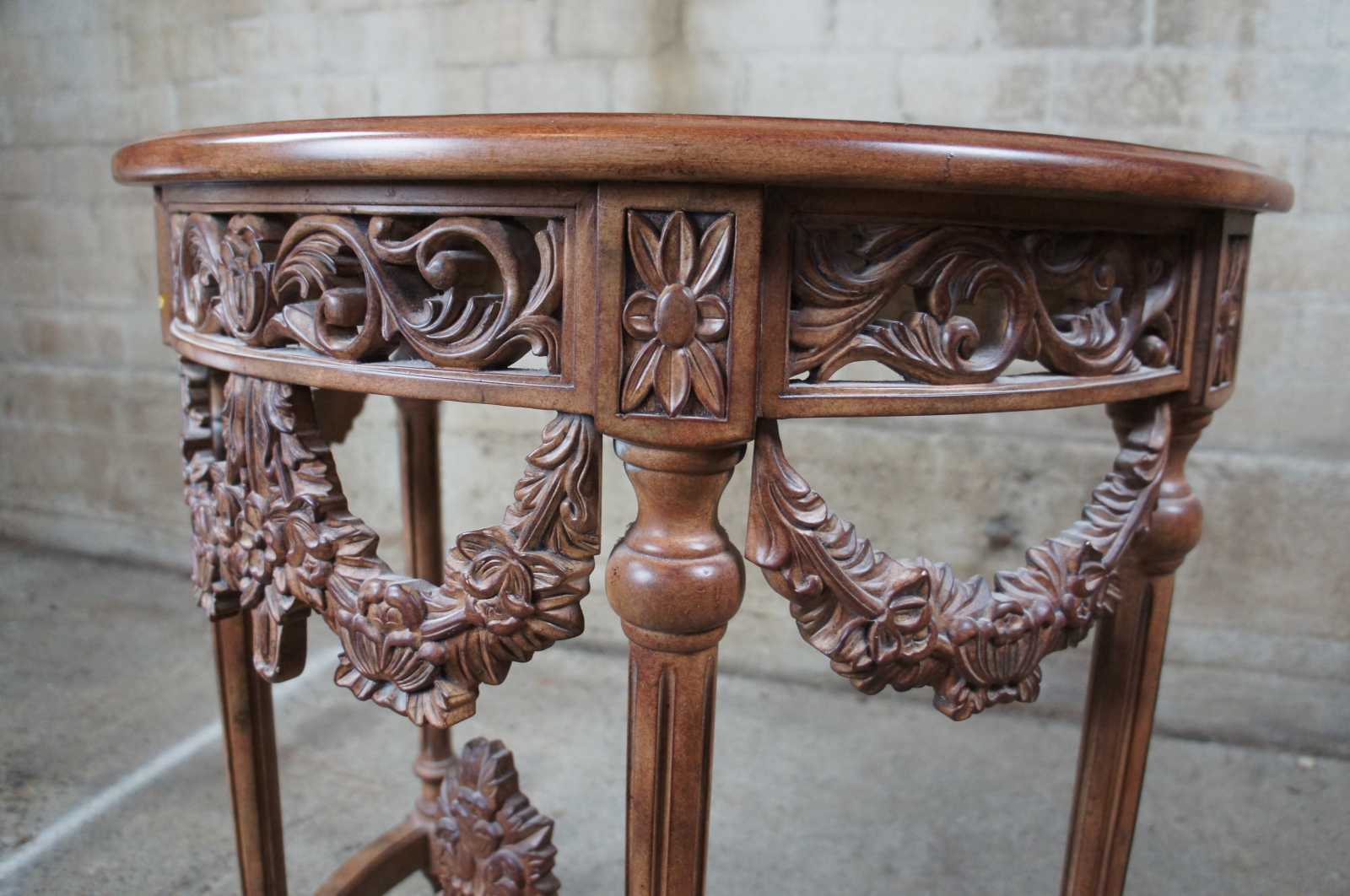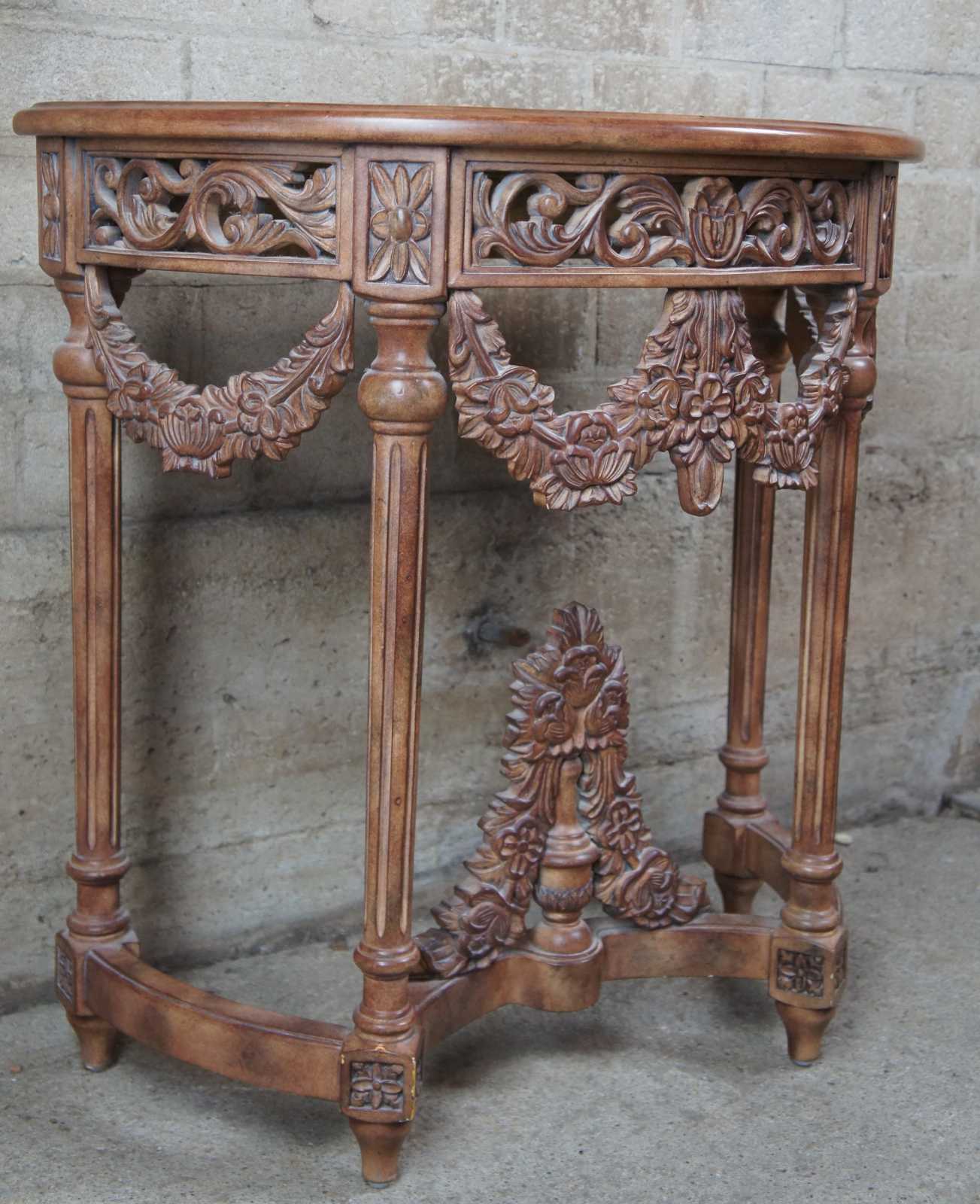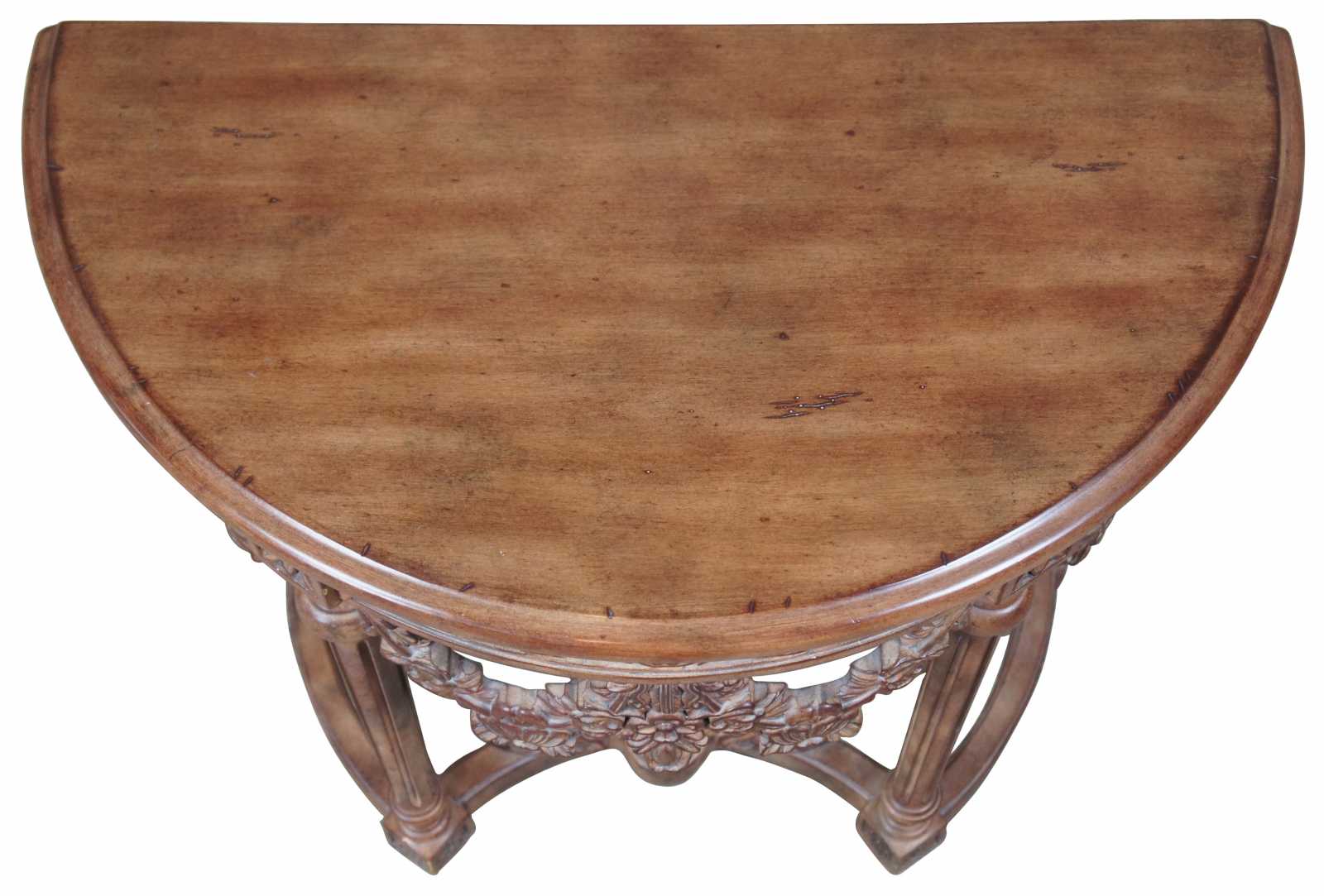 20th century Neoclassical revival console or hall table. Features a demilune shape with a distressed walnut finish. Ornately designed with a pierced apron and floral drapery between fluted columns leading to a trestle style base with trophy finial and overflowing flowers. The table is poised on arrow pointed feet. Includes French and Italian design elements.