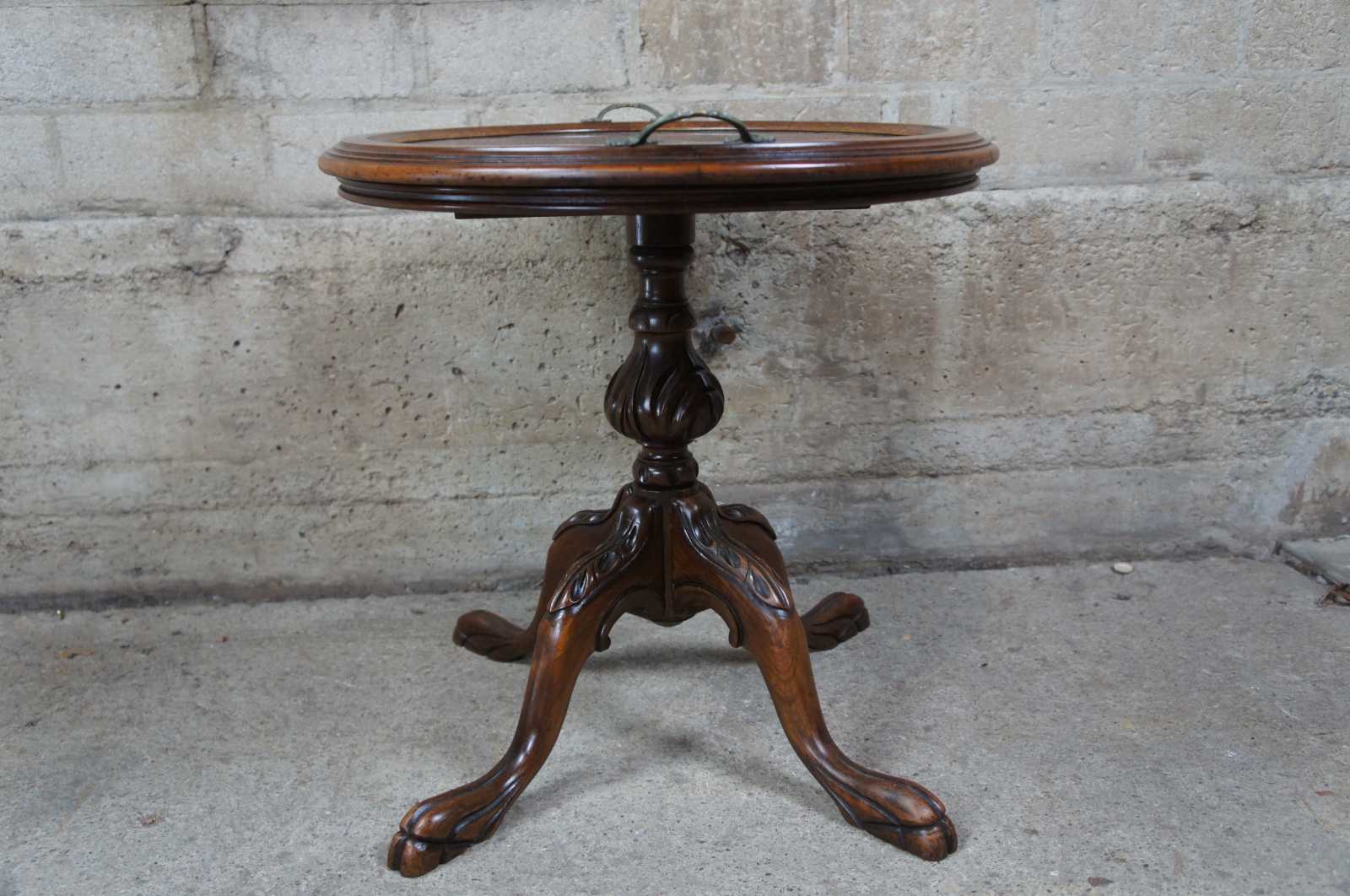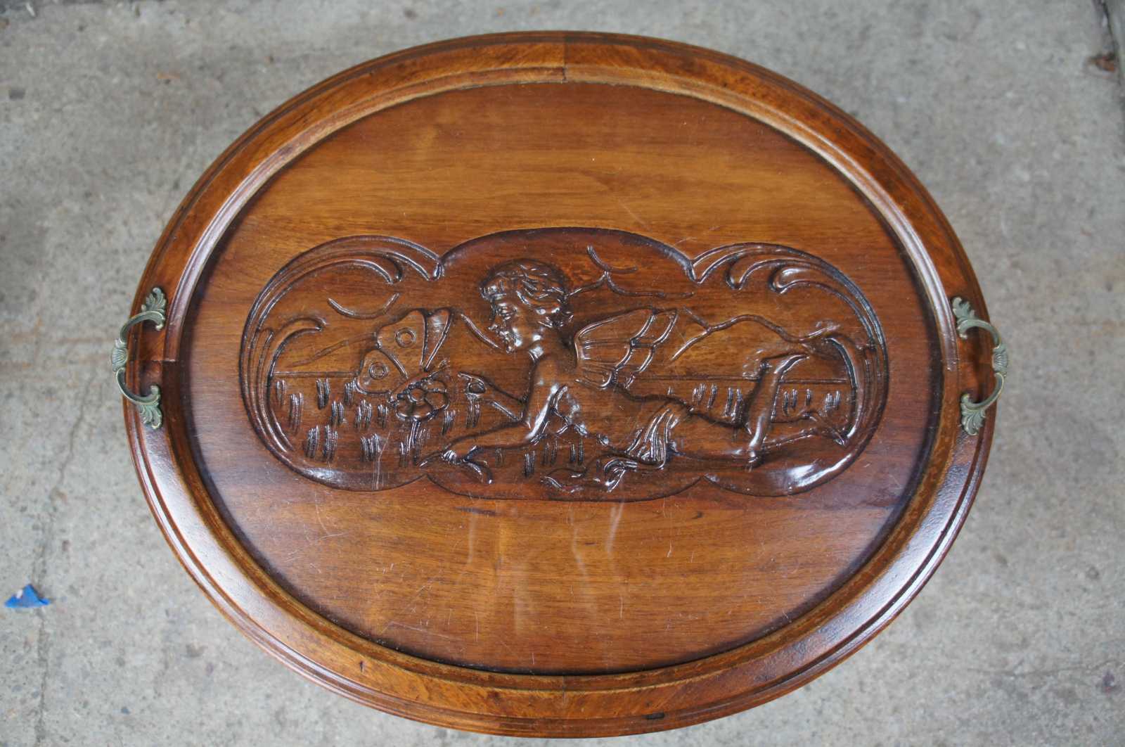 Antique late Victorian carved walnut pedestal tray table. Features a central figural scene with a boy angel and butterfly. The table sits atop four paw feet. The tray features glass center and brass handles, making it nice for serving.