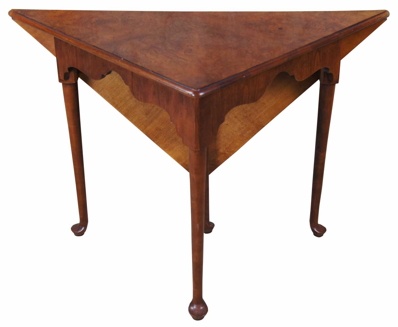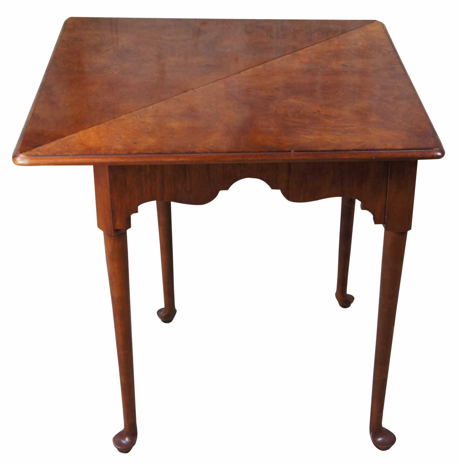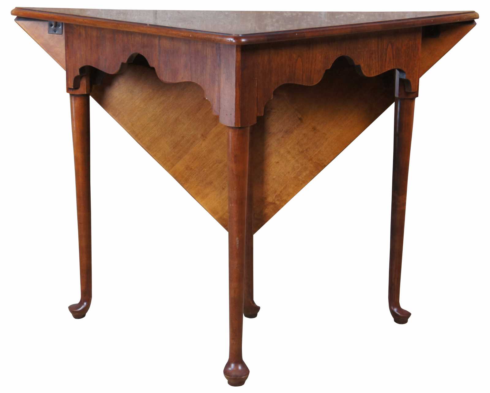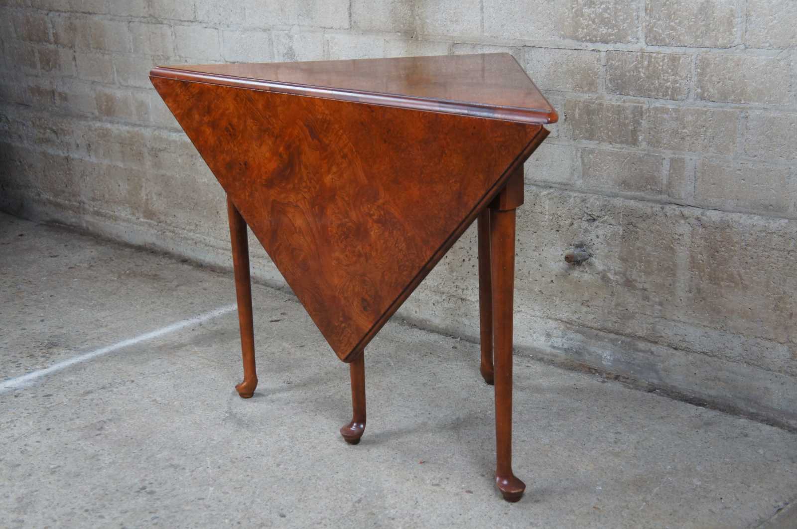 Circa 1980s handkerchief table by Hekman Furniture Co, 5-2015. Drawing inspiration from Colonial Williamsburg and Queen Anne styling. Features a triangular top of Olive Ash Burl over carved aprons and long tapered legs leading to pad feet. Back leg slides into place to support leaf. Marked along underside.