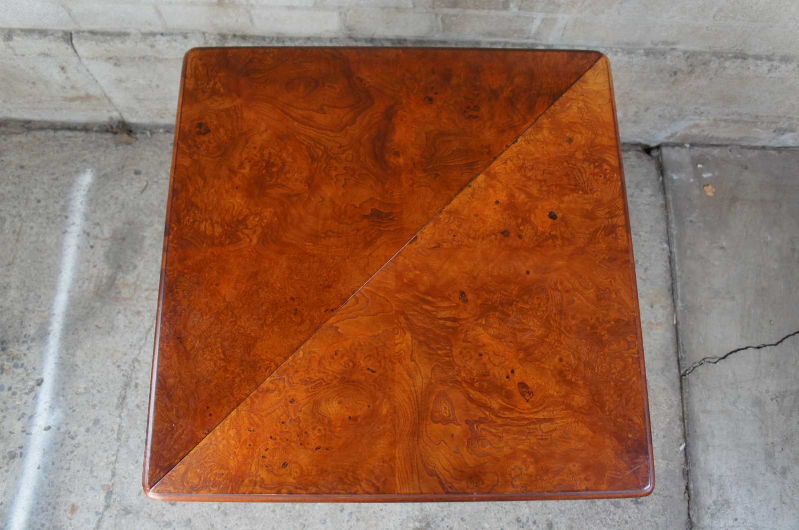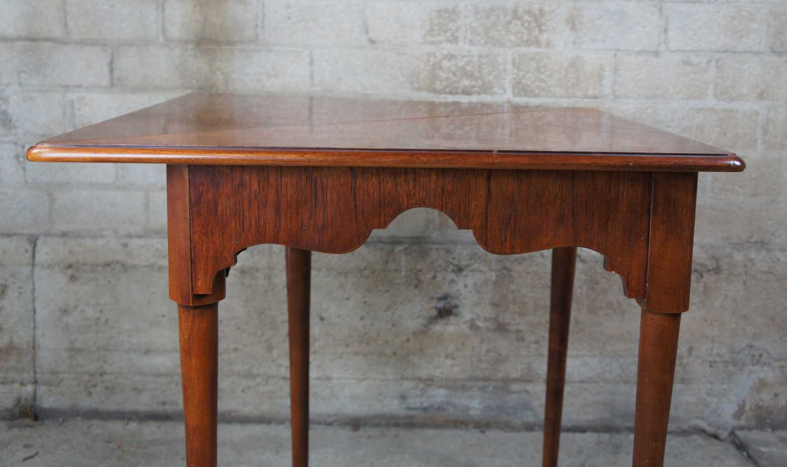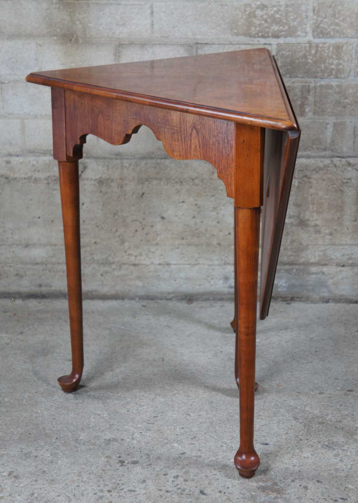 Circa 1980s handkerchief table by Hekman Furniture Co, 5-2015. Drawing inspiration from Colonial Williamsburg and Queen Anne styling. Features a triangular top of Olive Ash Burl over carved aprons and long tapered legs leading to pad feet. Back leg slides into place to support leaf. Marked along underside.