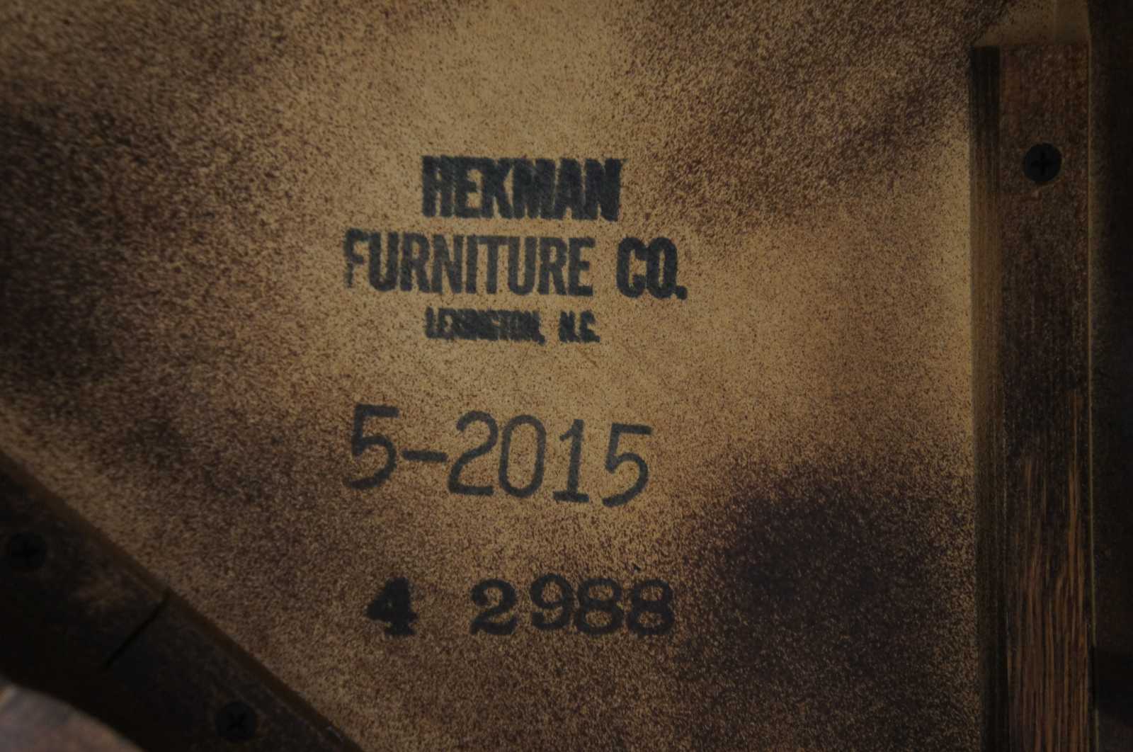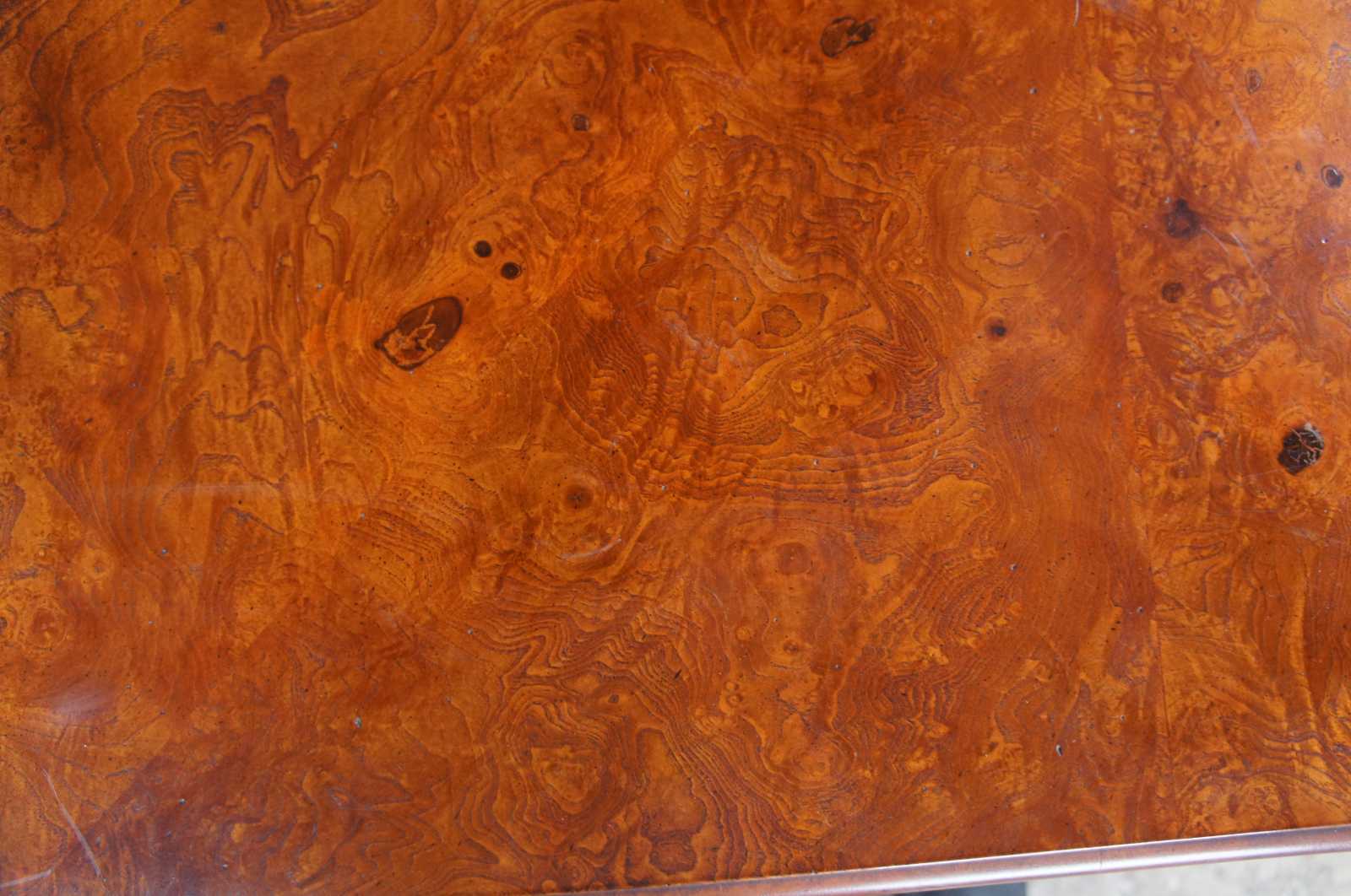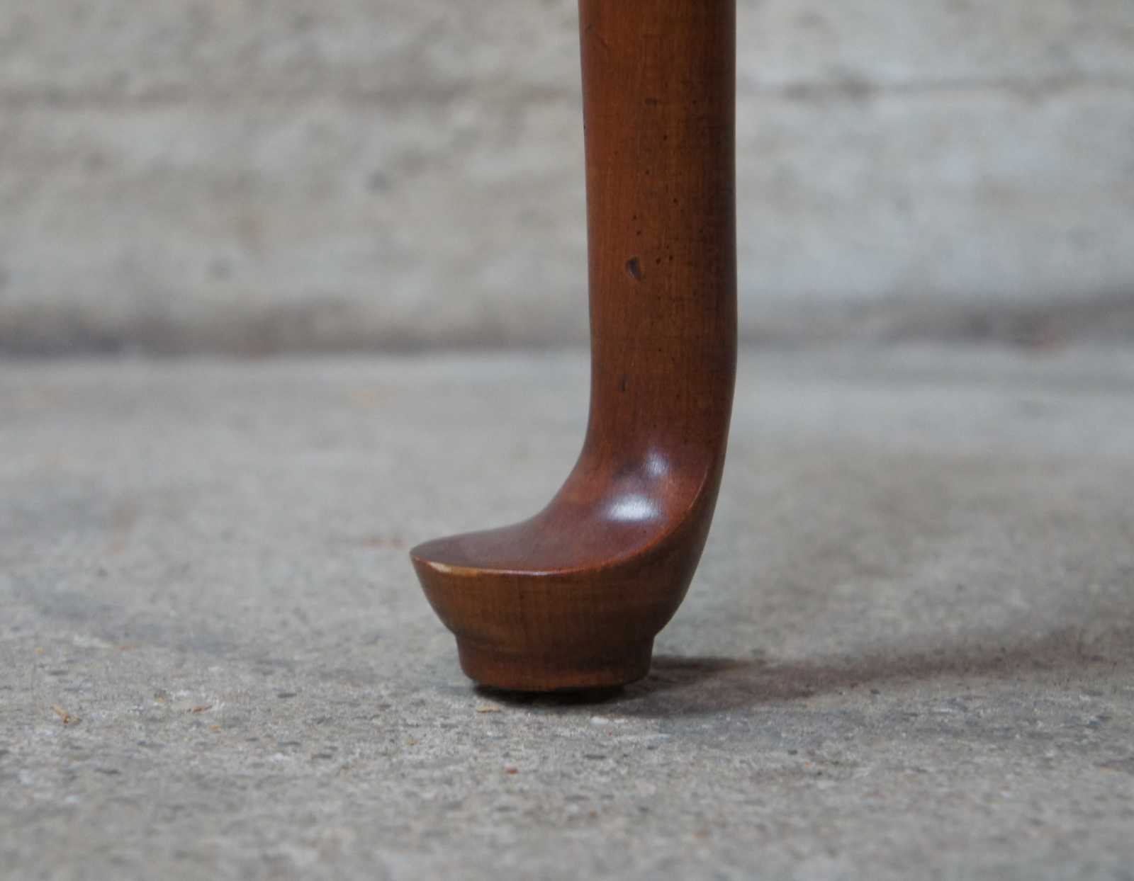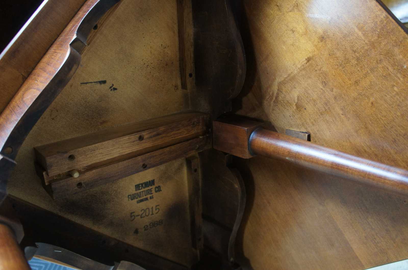 Circa 1980s handkerchief table by Hekman Furniture Co, 5-2015. Drawing inspiration from Colonial Williamsburg and Queen Anne styling. Features a triangular top of Olive Ash Burl over carved aprons and long tapered legs leading to pad feet. Back leg slides into place to support leaf. Marked along underside.