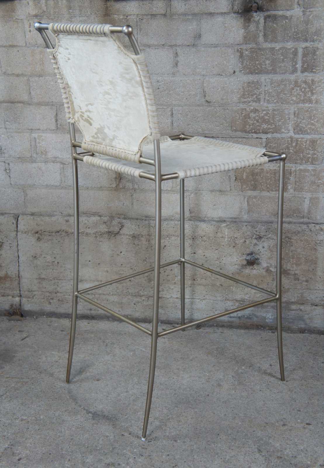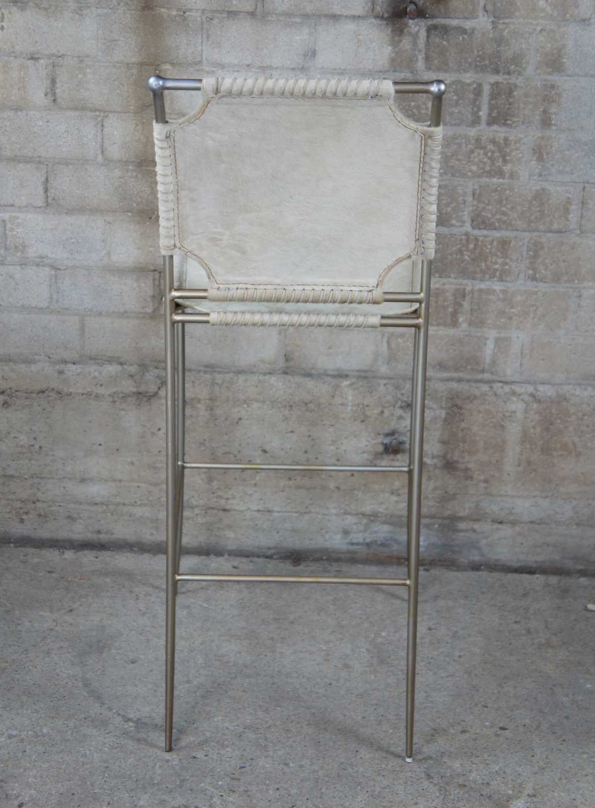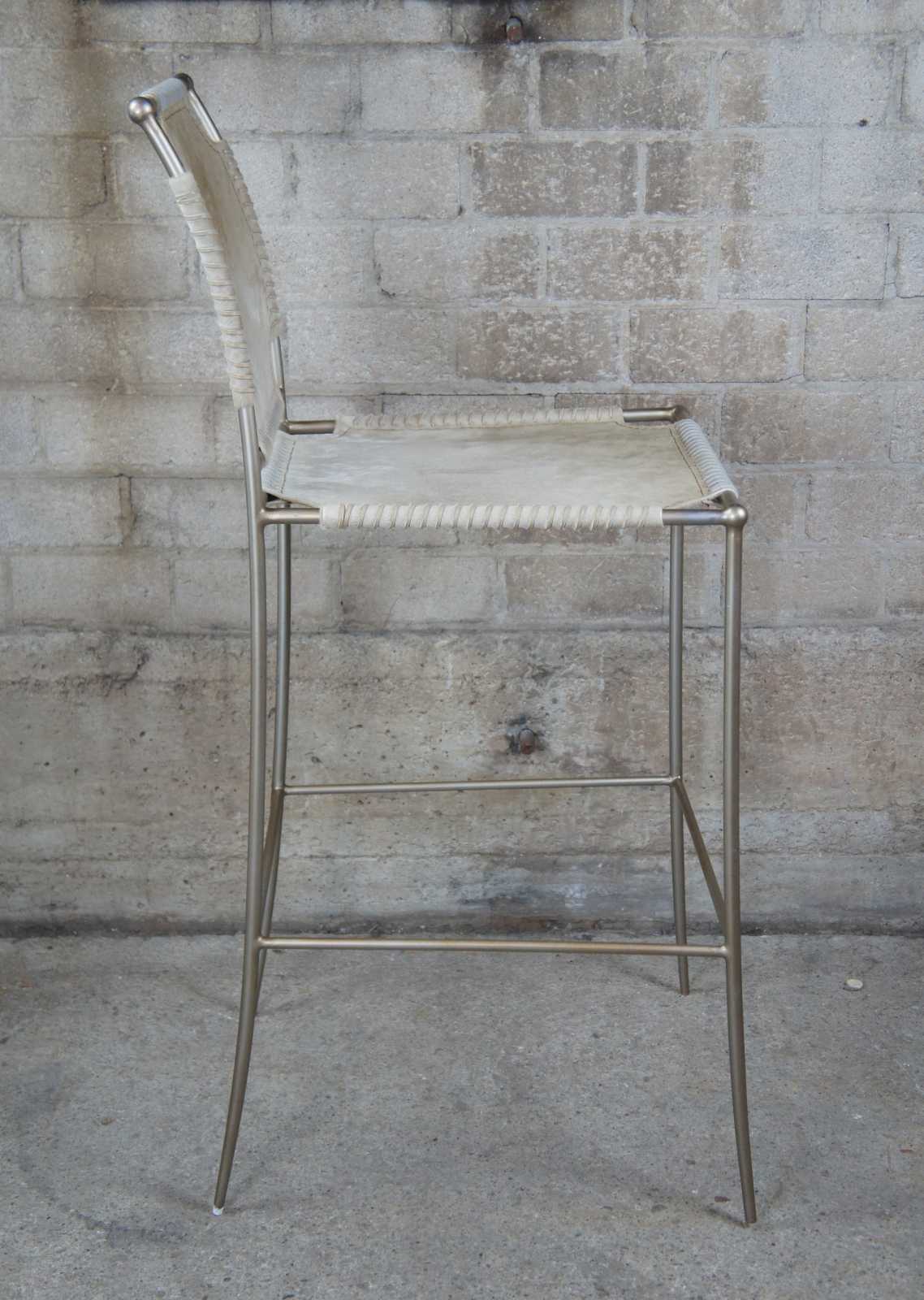 3 Caracole In Stitches bar stools,ATS-BARSTL-001. Part of their Modern Artisan line. Features a streamline metal frame with leather wrapped seat and back.